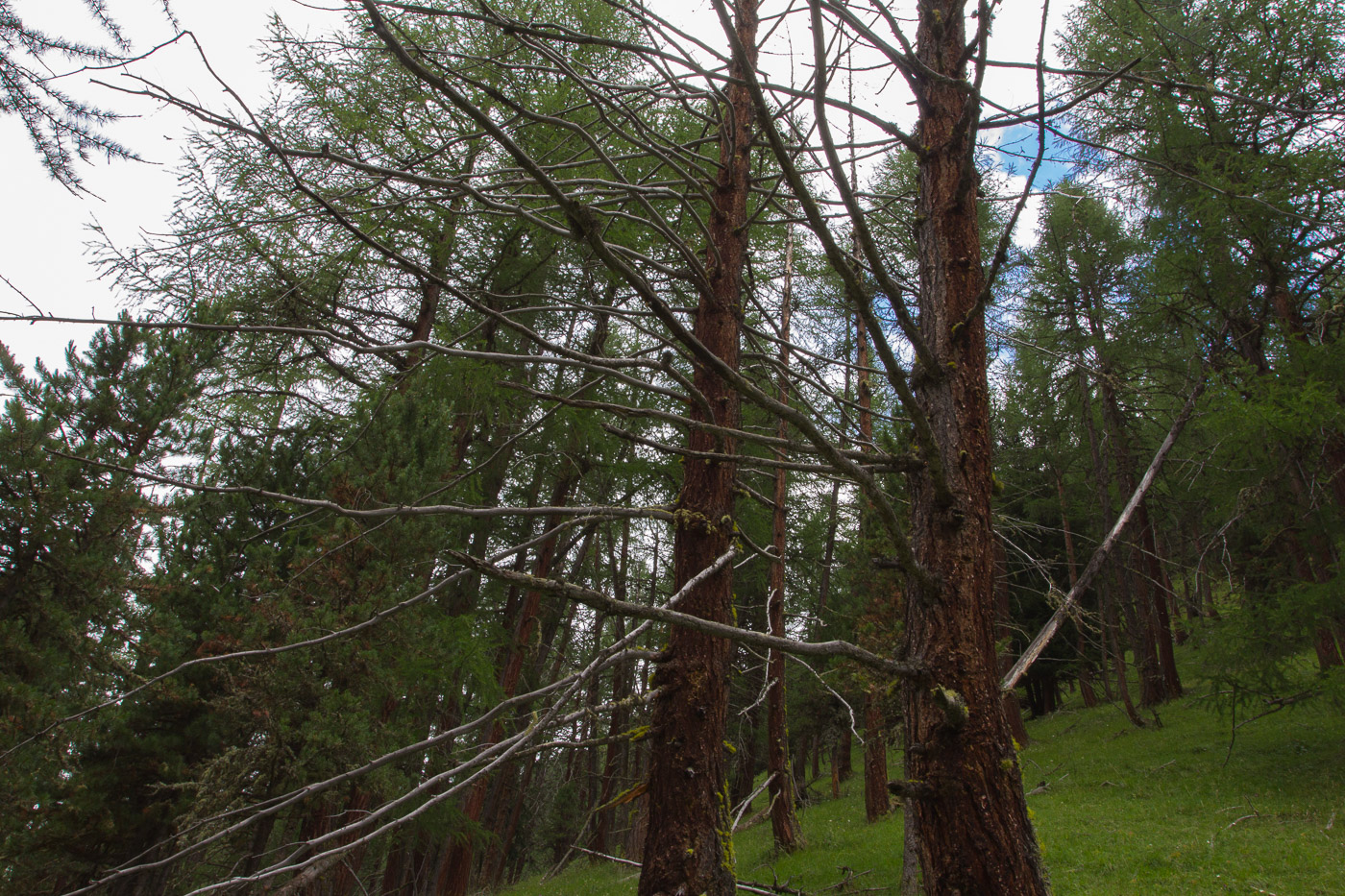 Leider hatten wir keine Zeit, die Kinder hier spielen zu lassen. Wir wanderten durch alpinen Nadelwald. Ein Eichhörnchen kletterte behände einen Baum hoch, sprang zum nächsten und kletterte diesen weiter hoch.