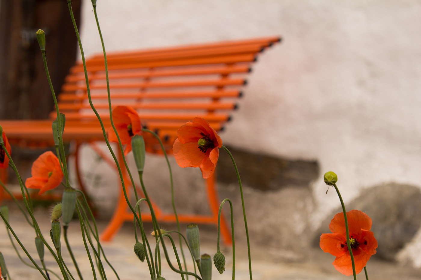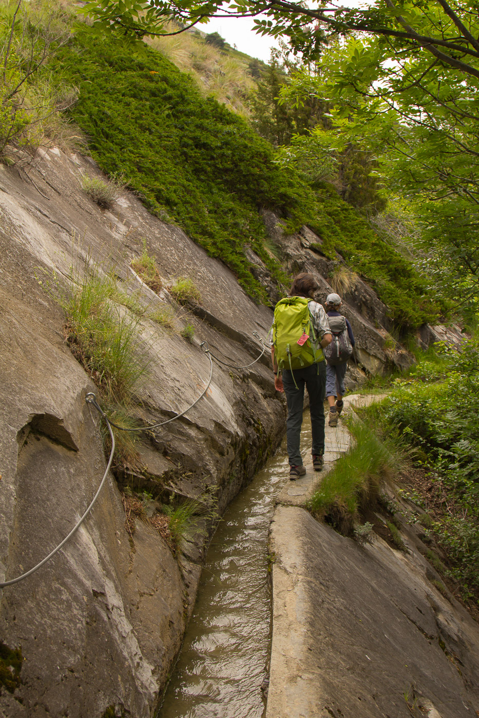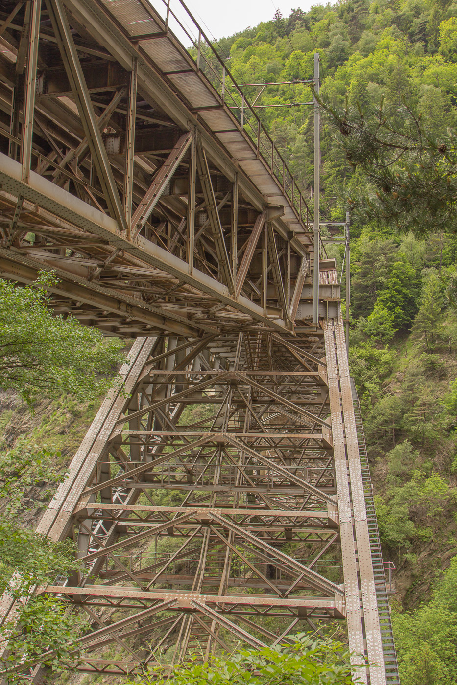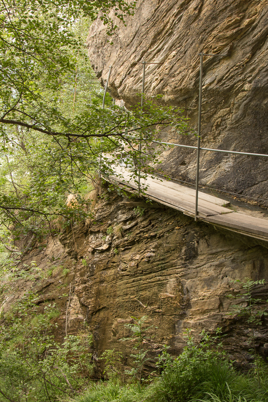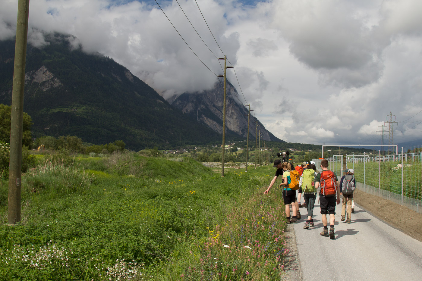 Viele Blumen säumen den Weg. Eine Teilnehmerin hat die „Flora Helvetica“ mitgenommen, das über 1600-seitige (!) Standardwerk zur helvetischen Blumenwelt. Beim „Chrizji“ (das heisst wohl Kreuz) steigen wir wieder abwärts zur Bahnlinie und unterqueren diese. Hundert Meter tiefer ist es gleich wärmer, ideal für Schmetterlinge. Es flattern denn auch viele umher, Schachbrett, Aurorafalter, Kleiner Fuchs, Braunauge und die grossen und seltenen Apollofalter. Wir folgen nun der „Lüögjerusuon“ (fragt mich nicht, was das heisst) zu einem Tunnel und einer Hängebrücke, die für den heutigen Nervenkitzel sorgen.