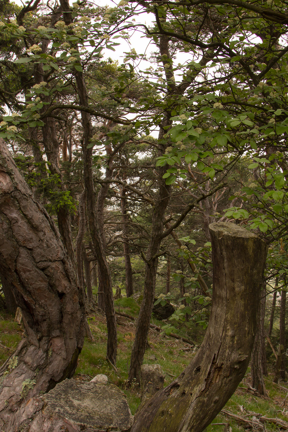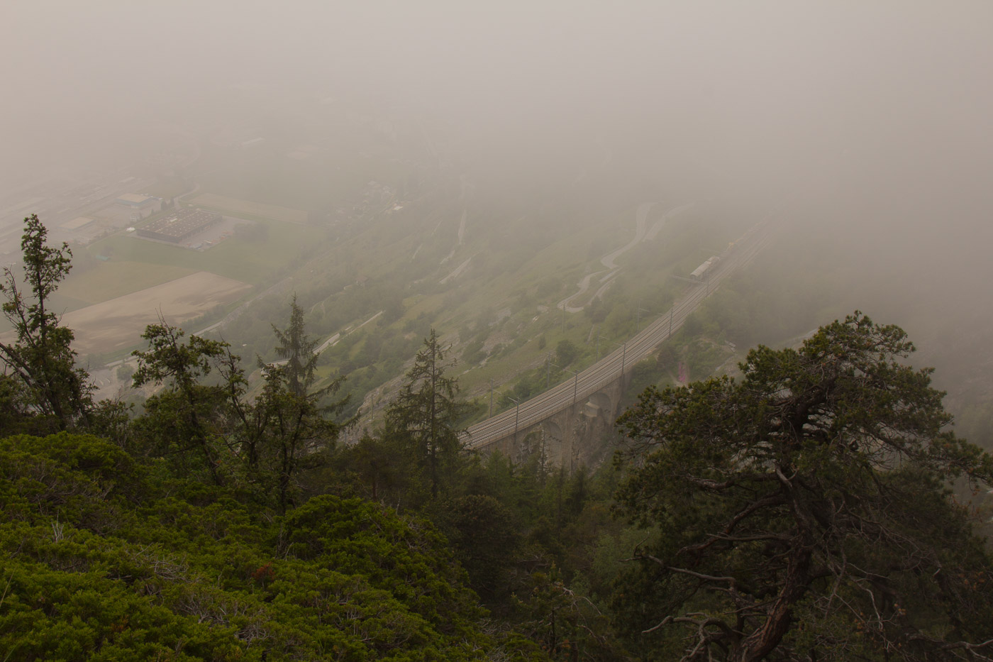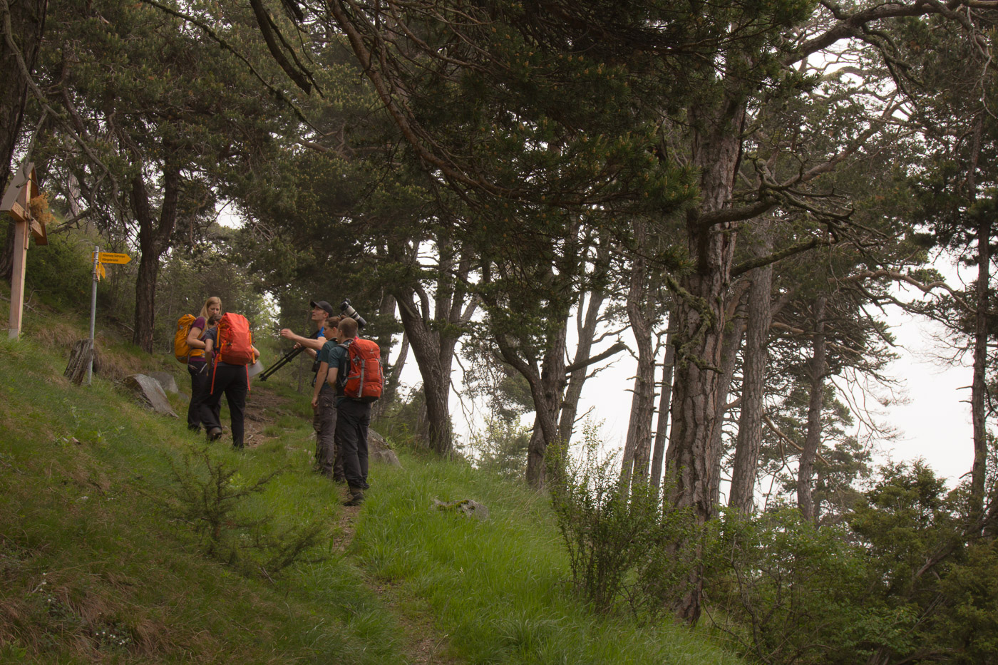 Am nächsten Morgen begrüsst uns am Bahnhof Ausserberg ein Gartenrotschwanz mit seinem Gesang. Wir fahren mit dem Zug eine Station weiter nach Hohtenn, wo wir unsere Wanderung zurück starten. Allerdings nehmen wir nicht den normalen Höhenwanderweg, sondern steigen zuerst hoch Richtung Alp Joli. Wir wandern durch Föhrenwald, Nebel umgibt uns. Föhren sind genügsame Bäume und kommen auch mit anspruchsvollen Biotopen wie hier an den heissen Südhängen klar. Hier haben sie keine Konkurrenz, für Buchen und Fichten ist es zu trocken und zu heiss. Dafür leiden sie unter dem Kiefern-Prozessionsspinner, dessen Raupen ganze Bäume zum Absterben bringen. Wir hören bekannte Vögel, aber auch eine Stimme, die wir nicht einordnen können, ausser unser Tourenleiter. Es handelt sich um einen Berglaubsänger. Zwischendurch ist das Gelände felsig, wir befinden uns in der Walliser Felsensteppe.