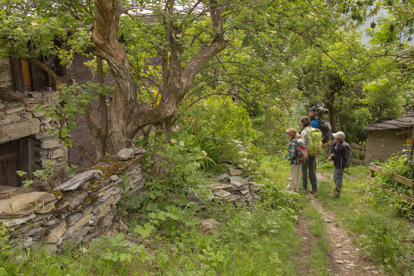 Wir steigen wieder einen Wanderweg hoch, also ich einen speziellen Ruf höre: Up-up-up. „Das ist er!“, ruft Philipp begeistert. Wir schleichen nun in Richtung der Rufquelle. Tatsächlich, da sitzt er auf einer abgestorbenen Föhre und ruft. Aber sobald er uns bemerkt hat, fliegt er davon. Wir gehen wieder zurück und weiter auf dem Wanderweg hoch. Da hören wir abermals den Ruf, ganz in der Nähe. Wieder schleichen wir uns an, und wieder sitzt er auf einer Föhre. Wunderbar! Nun kann Silvan wieder einen Vogel auf seiner Wunschliste abhaken. Wir wandern weiter, vorbei an wunderschön blühenden Wiesen, wie man sie bei uns ebenfalls kaum mehr findet. Donner grollt, gegen Leukerbad hoch ist schwarz. Wir gehen einen Zacken schneller, erreichen das Auto noch trocken.