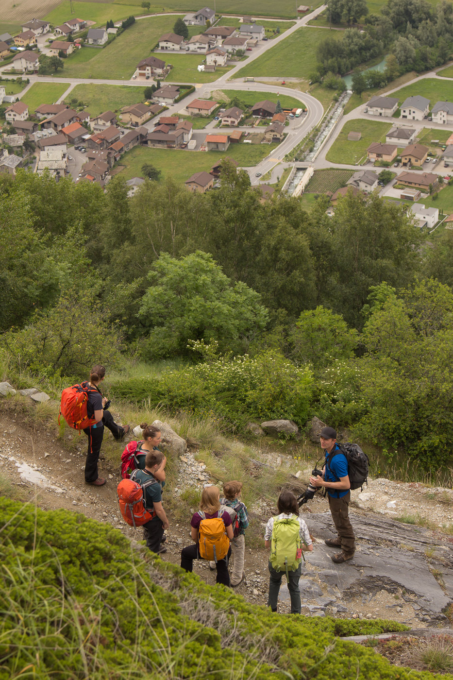Vom Weg überblicken wir das halbe Rhonetal. Beim Anblick habe ich gemischte Gefühle: Einerseits die Natur mit Bächen, Wiesen, Wäldern, andererseits der ganze Siedlungsbrei, die Strassen, die Zersiedelung. Wie ein Krebsgeschwür frisst sich die „Zivilisation“ in die Landschaft (ich will damit nicht behaupten, dass es zu Hause besser ist). Nun denn, wir wandern weiter, entdecken unterwegs eine grosse Holzbiene, die ihre Eier in Totholz ablegt. Beim „Chrüter Beizli“ rasten wir, bevor wir weiter gehen zum Eingang des Bietschtales. Dort hinten verspricht uns Philipp weitere schöne Beobachtungen. Der Weg ist gelb markiert, dafür aber ganz schön ausgesetzt.
