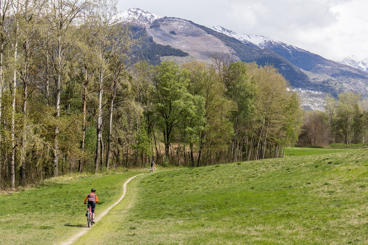 Endlich können wir wieder weiter fahren, wir sind nun im hügeligen Gelände, das am letzten Sonntag das Ende der Wanderung durch den Pfynwald markierte. Es gibt nochmals coole Trails, bevor wir gemütlich am Rosensee vorbeiradeln. Über eine Wiese erreichen wir den Damm, wo uns wieder der Föhn brutal ins Gesicht bläst und Staubwolken aufwirbelt. Wir sind froh, als wir wieder im Wald sind, dort ist es um einiges gemütlicher. Wir erreichen Leuk und müssen nun wie gewohnt noch hoch zu unserer Wohnung. Kaum angekommen dort, beginnt es zu regnen. Was für ein Timing, was für eine Tour!