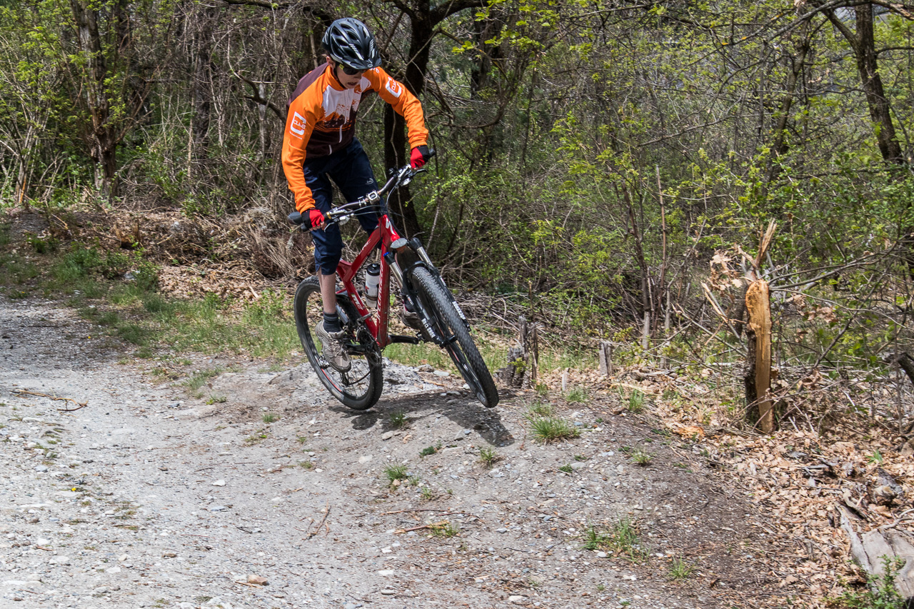 Dann geht es den ersten Singletrail abwärts, ich brettere über alle Unebenheiten hinweg mit meinem neuen Mountainbike. Es fühlt sich super an, wie das wohl ist, wenn ich erst die Federgabel deblockiere!?! Weiter geht es durch den Wald auf schmalen Pfaden, ich voraus, Fabian immer dicht hinter mir. Den kann ich wohl nicht mehr abschütteln, abwärts schon gar nicht. Und Silvan schwärmt von meinem alten Bike, das sei viel leichter und agiler als seins, da könne er viel besser springen.