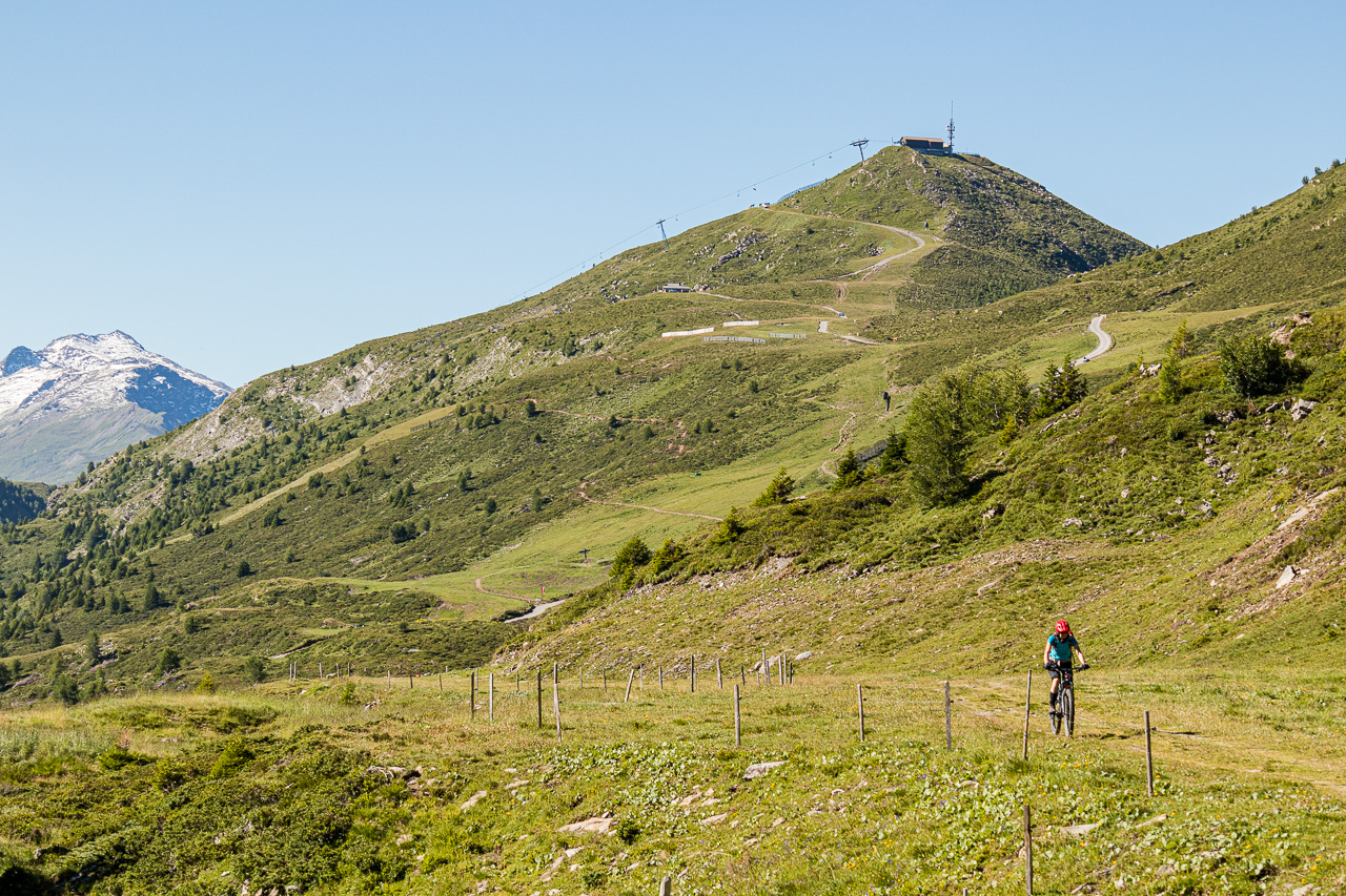 Wir stehen früh an der Talstation, denn wir wollen zu den ersten gehören, die auf den Piz Scalottas hochfahren. Zuerst müssen wir aber noch an einem extra dafür platzierten Sesselbahnsitz üben, das Bike korrekt anzuhängen, bevor wir hoch fahren dürfen. Nach einmal umsteigen erreichen wir den Piz Scalottas auf 2324 Meter über Meer. Die Aussicht ist fantastisch und ringt uns Bewunderung ab. Da tönt es plötzlich in unseren Rücken „hoi zäme!“ Ein SAC-Kollege, mit dem die Söhne die Woche zuvor im Bergsteigerlager waren, hat den heutigen Tag auch fürs Biken reserviert.