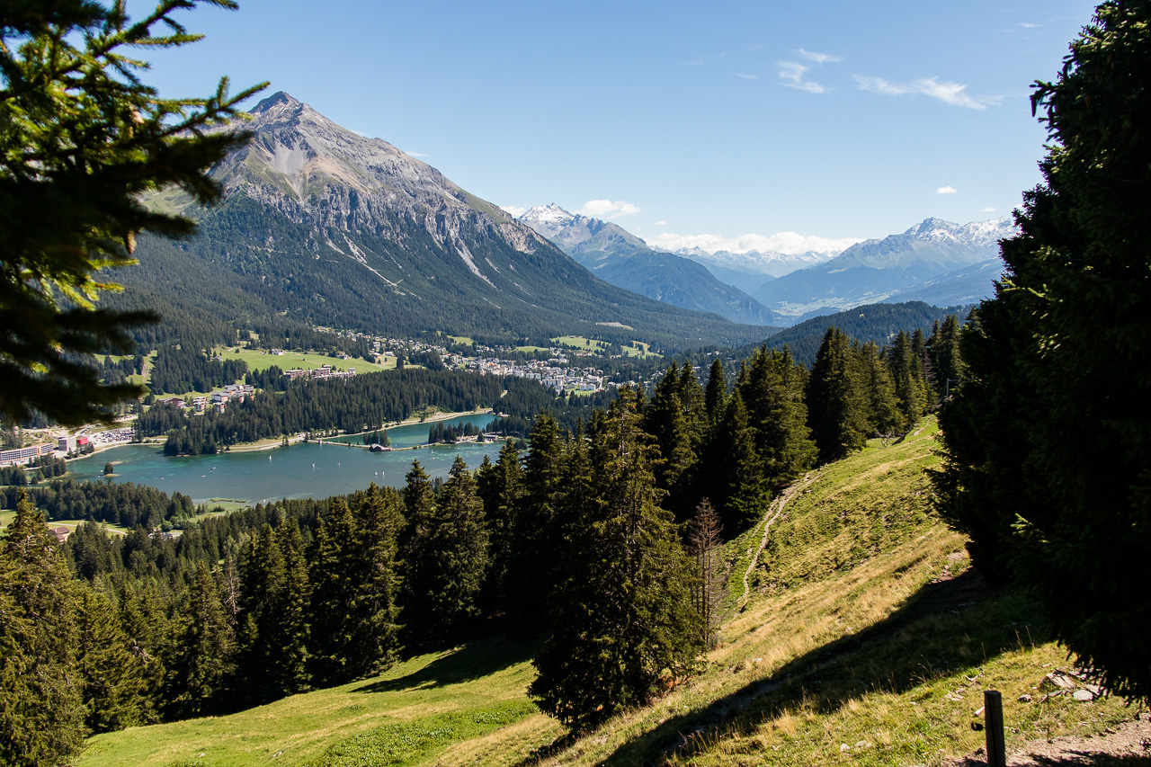Vom Heidbüel fahren wir abwärts auf der Alpstrasse, wieder vorbei an der Alp Stätz wie heute Morgen, aber diesmal Richtung Lenzerheide. An einem schönen Rastplatz mit Blick auf den Heidsee legen wir nochmals eine Pause ein, bevor wir den letzten Singeltrail in Angriff nehmen. Wieder poltern wir runter, vorbei an einer Bikegruppe, die mit ihren Lehrern unterwegs ist. Müde, aber glücklich erreichen wir den Heidsee und radeln zurück zur Ferienwohnung. Was für ein Ritt! Und ja, Bähnlibiken ist anstrengend. Ausser, man fragt Fabian.