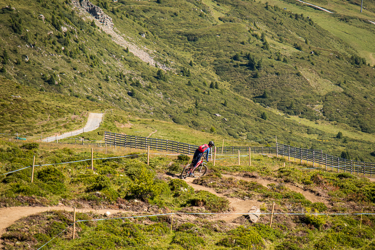 Wir fahren auf dem Brambrüesch erst mal entspannt auf der Strasse. „Schön, das würde mir jetzt reichen so bis Churwalden“, denke ich mir. Aber ich habe mich wieder mal getäuscht. Ein deftiger Singletrail führt uns durch den Wald abwärts, ein-, zweimal muss ich absteigen. Dann wird es wieder etwas flacher. Aber da steht Fabian am Wegrand, er ist wieder mal allen davongefahren. „Ich habe einen Platten!“ ärgert er sich. So legen wir eine Zwangspause ein, während er den Schlauch wechselt. Schön, wenn sie so selbständig sind. Nach diesem Intermezzo fahren wir weiter auf dem Trail. „Ah, dort unten kommt die Strasse, dann wird es wieder etwas gemütlicher“, denke ich noch, kurz darauf fliege ich ein Bord runter, das Bike über mir! Ich muss am Gatter angehängt haben, weiss nicht, wie das passiert ist. Ich habe zum Glück nur ein paar Schrammen, das GPS wurde abgeriessen und hat nun einen Kratzer im Display, funktioniert aber immer noch tadellos, ebenso das Bike, da gab es keine Schäden. Also weiter, runter nach Churwalden und hoch mit der letzten Bahn.