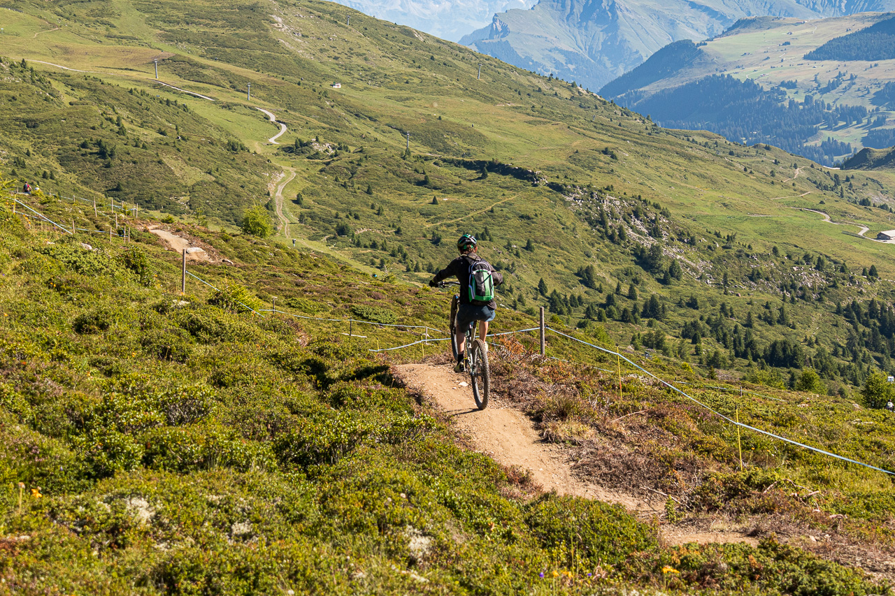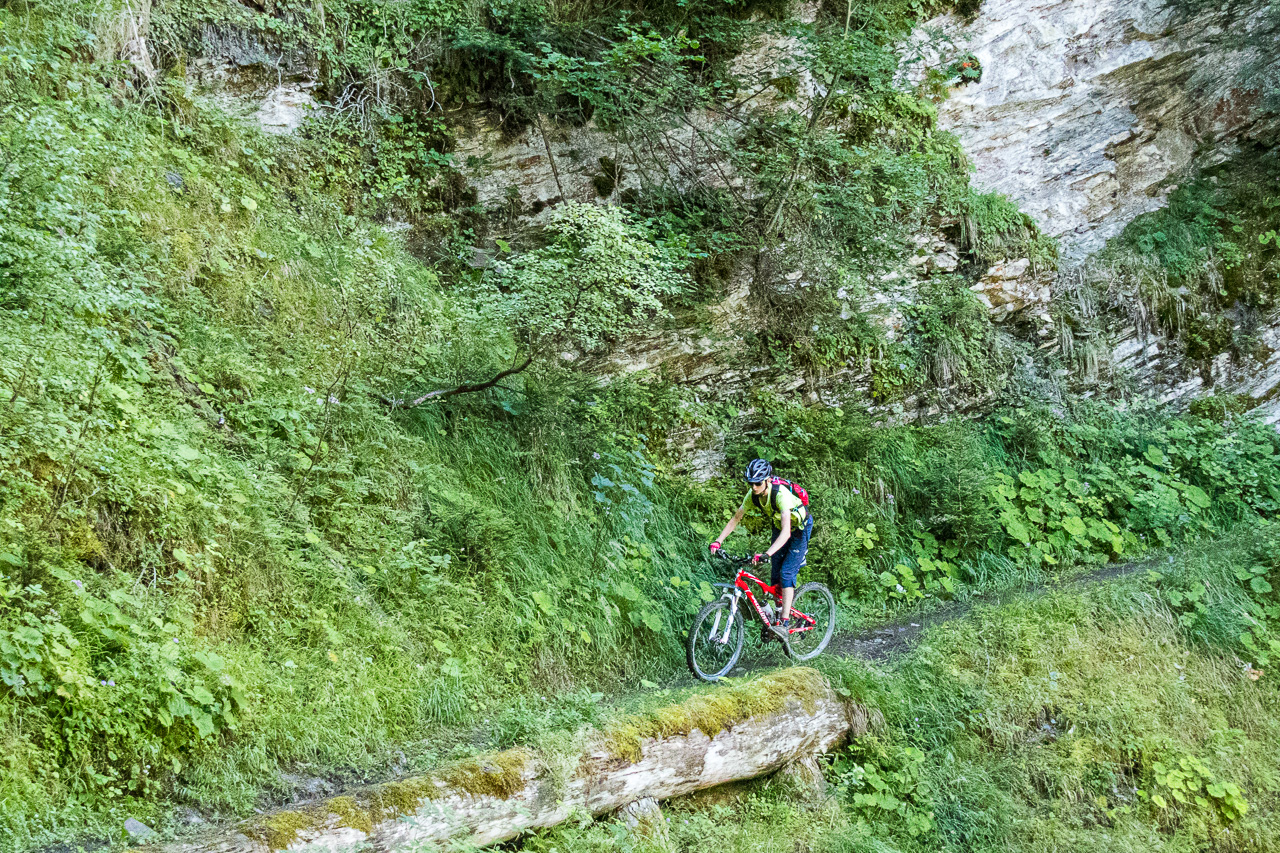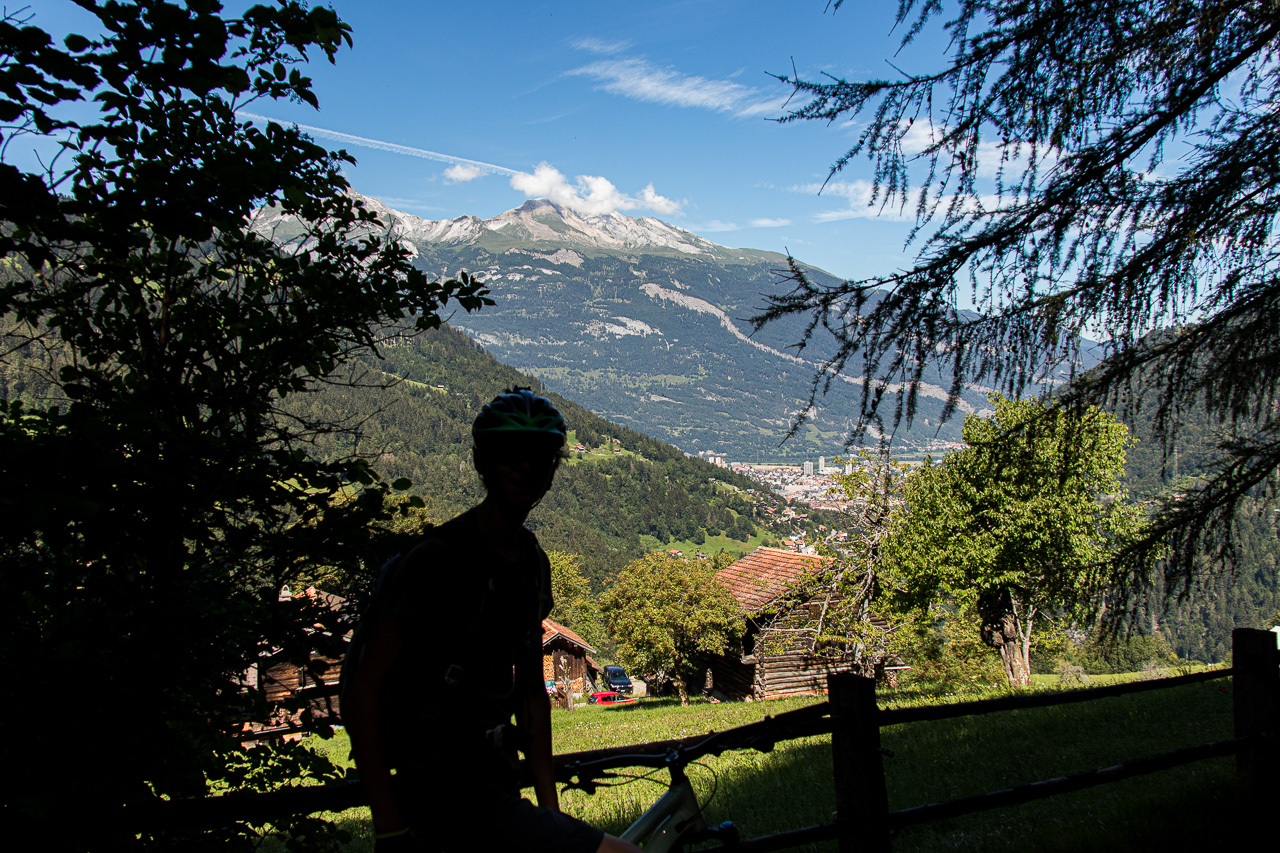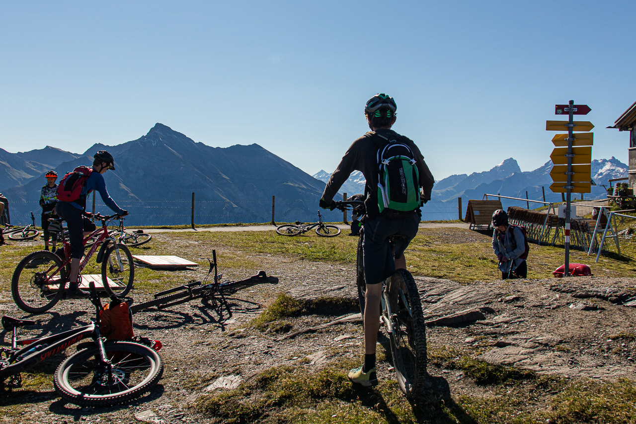 Nun aber los, die Jungs sind kaum mehr zu halten. Fabian prescht voran, Silvan hinterher. Der Trail ist flowig mit Anliegerkurven und gespickt mit Kicker, die die Frau und ich mehr oder weniger elegant überfahren, die Jungs überfliegen. Er ist aber auch ziemlich ruppig, nicht so ein Micky-Maus-Trail wie von Scharmoin herunter. Gütigerweise wartet Fabian ab und zu auf uns Schleicher. Von der Alp Scharmoin, wo wir uns kurz etwas erholen können, geht es den Wanderweg abwärts. Und wie! Der Weg ist steil, oben verwurzelt und unten verblockt. Ich starte zuerst, rattere über die Wurzeln und denke mir „boah, das machst du aber gut!“ Da scheppert es rechts von mir und Fabian saust an mir vorbei, als wäre es eine normale Strasse! Silvan, der als einziger kein Trailbike fährt, entschliesst sich abzusteigen und zu schieben.