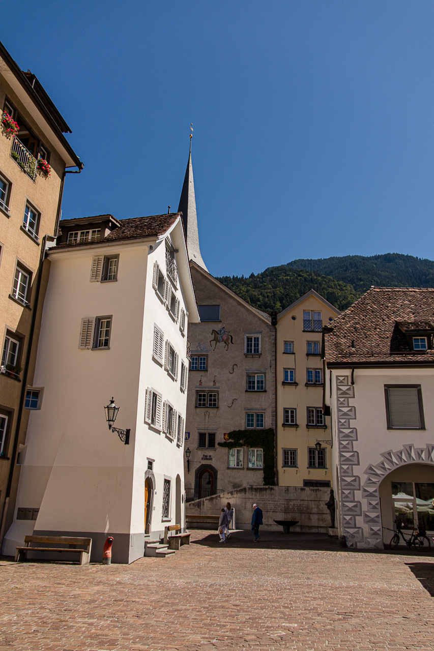 Der Talboden kommt jedenfalls immer näher. Bei Meiersboden ist denn auch fertig mit Singletrails, wir radeln nach Chur. Dort kommen wieder Erinnerungen an unsere Rheinveloreise vor zehn Jahren. Wir erkennen die Strasse, an der unsere Unterkunft lag, die Altstadt, die wir nun aufsuchen, kam uns auch wieder bekannt vor. Silvan wollte damals nicht vom Windschattenvelo absteigen, mürrisch fragte er, was wir denn hier in der Stadt wollten. Er wäre lieber auf dem Bauernhof in Valendas geblieben, wo wir zwei Nächte verbrachten.