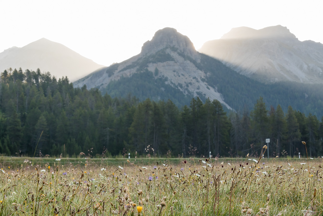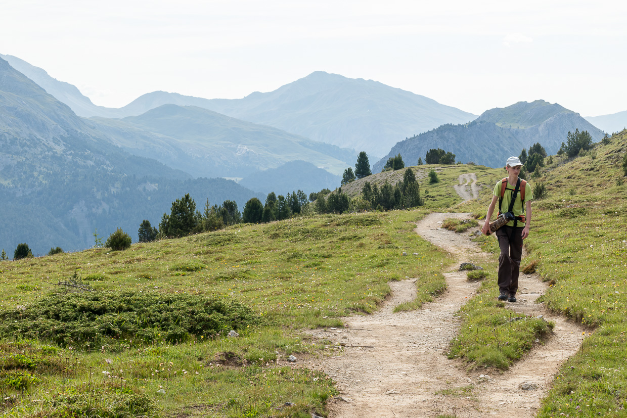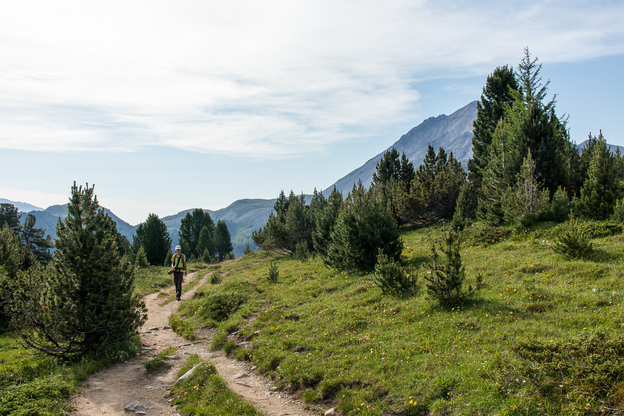 Den Piz Daint im Rücken gehen wir auf dem Wanderweg, mehr oder weniger die Höhe haltend. Es ist still, da und dort krächzt ein Tannenhäher. Und wir sind ganz alleine, was ich immer besonders schätze. Eine Ringdrossel scheint Junge zu haben, sie hat den Schnabel mit Raupen und anderen Leckereien gefüllt.