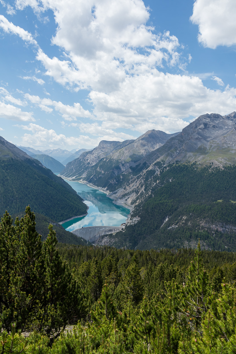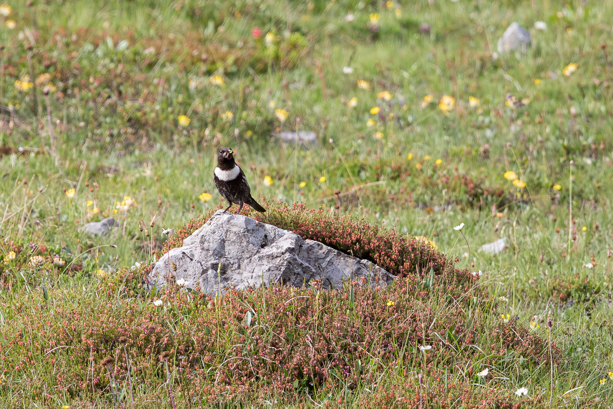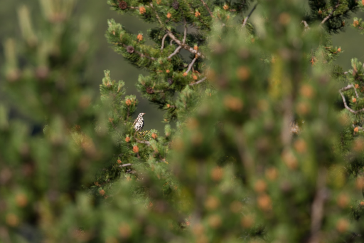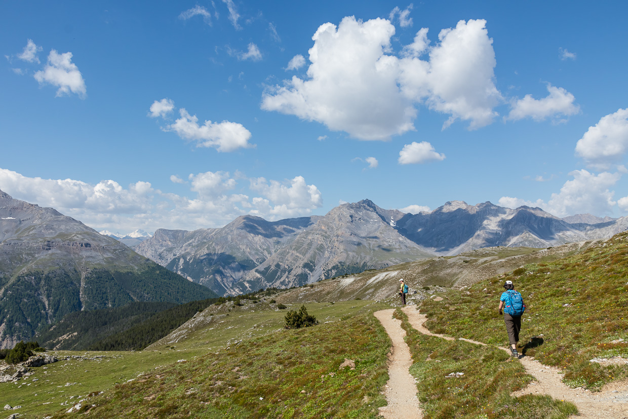 Den Piz Daint im Rücken gehen wir auf dem Wanderweg, mehr oder weniger die Höhe haltend. Es ist still, da und dort krächzt ein Tannenhäher. Und wir sind ganz alleine, was ich immer besonders schätze. Eine Ringdrossel scheint Junge zu haben, sie hat den Schnabel mit Raupen und anderen Leckereien gefüllt.