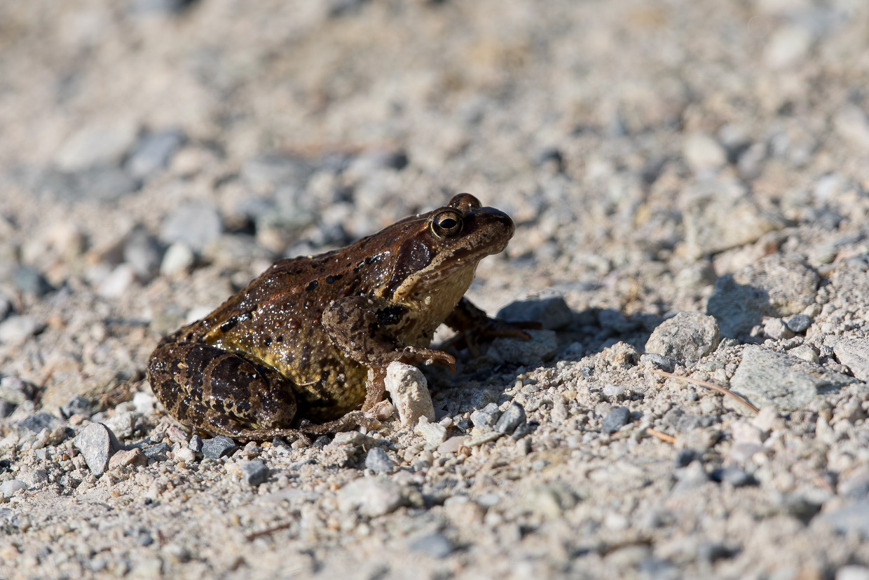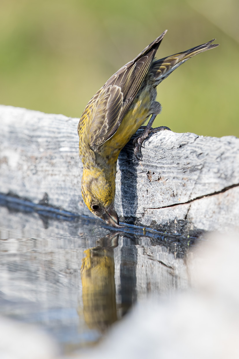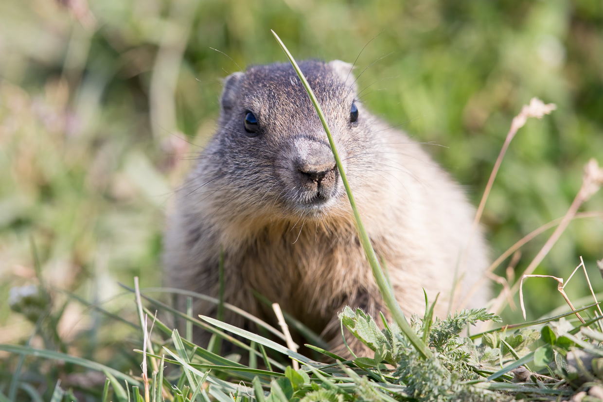 Mit dem ersten Postauto fahren wir nach Buffalora. Noch im kühlen Schatten überqueren wir die Alp und die Ova dal Fuorn. Aber schon bald entdeckt Silvan wieder Schmetterlinge, was unser Vorwärtskommen verzögert. Ich gehe trotzdem langsam voran, sichte eine Misteldrossel, Tannenhäher und Meisen, ein Grasfrosch wird von einer Kuhherde aus seinem nassen Paradies vertrieben. Im Schatten der Bäume warte ich auf die anderen, es ist nämlich bereits heiss. Das spüren auch die Tiere, gemeinsam erreichen wir einen Brunnen, aus dem ein Fichtenkreuzschnabel trinkt. Wenig weiter guckt ein junges Murmeltier aus seiner Höhle. Wir können uns auf wenige Meter nähern, ohne den Weg zu verlassen.