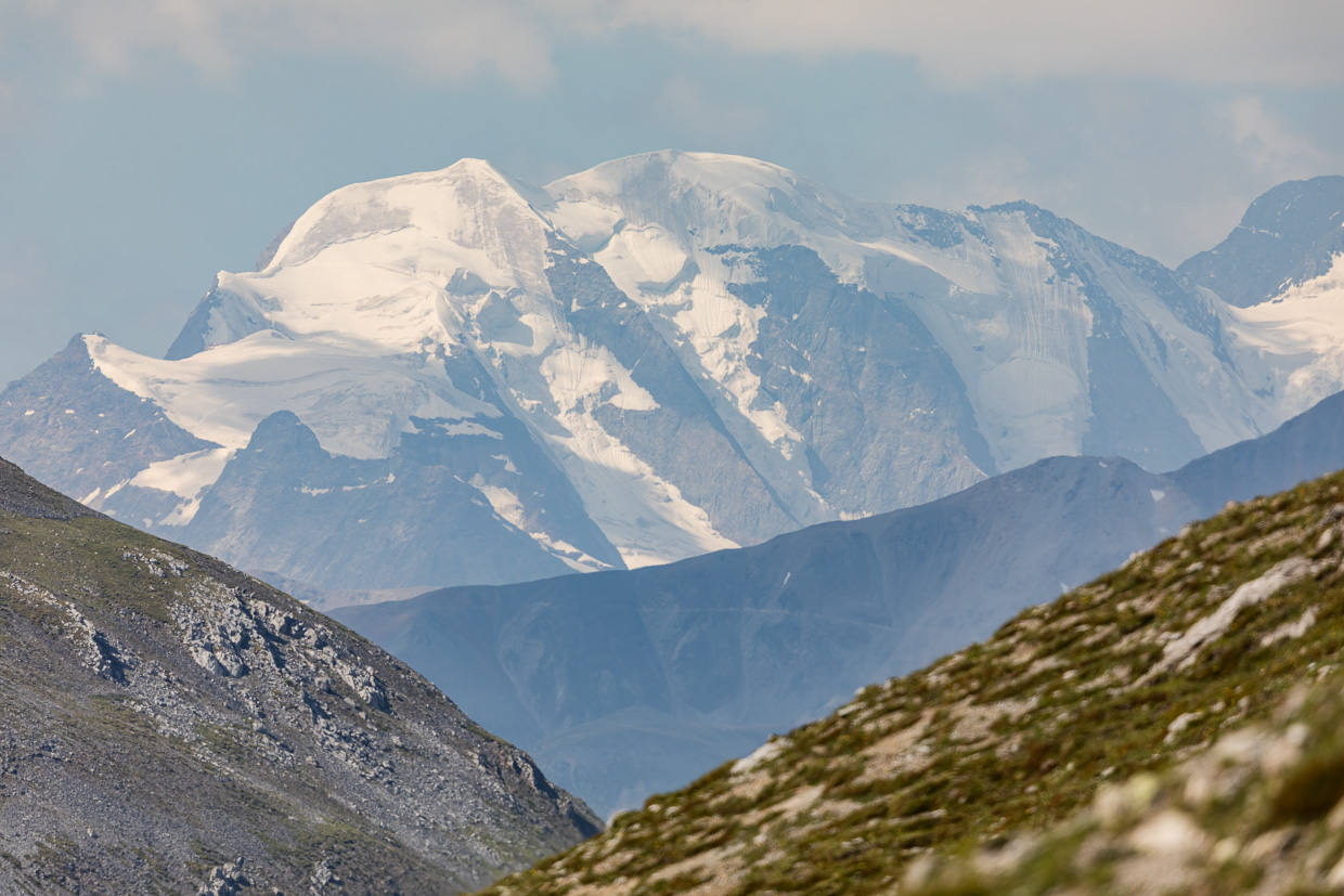 Auf dem Gipfel heben sich die mächtigen Eisberge des Berninamassivs und der Ortler auf der anderen Seite aus der Masse der grauen Berge hervor. Ich bin nun aber froh, mal meine Ausrüstung beiseite legen zu können, ich schleppe immerhin einige Kilogramm mit herum mit zwei Kameras, einem Fernglas und der Tranksame. Wenigstens deren Gewicht kann ich verringern.