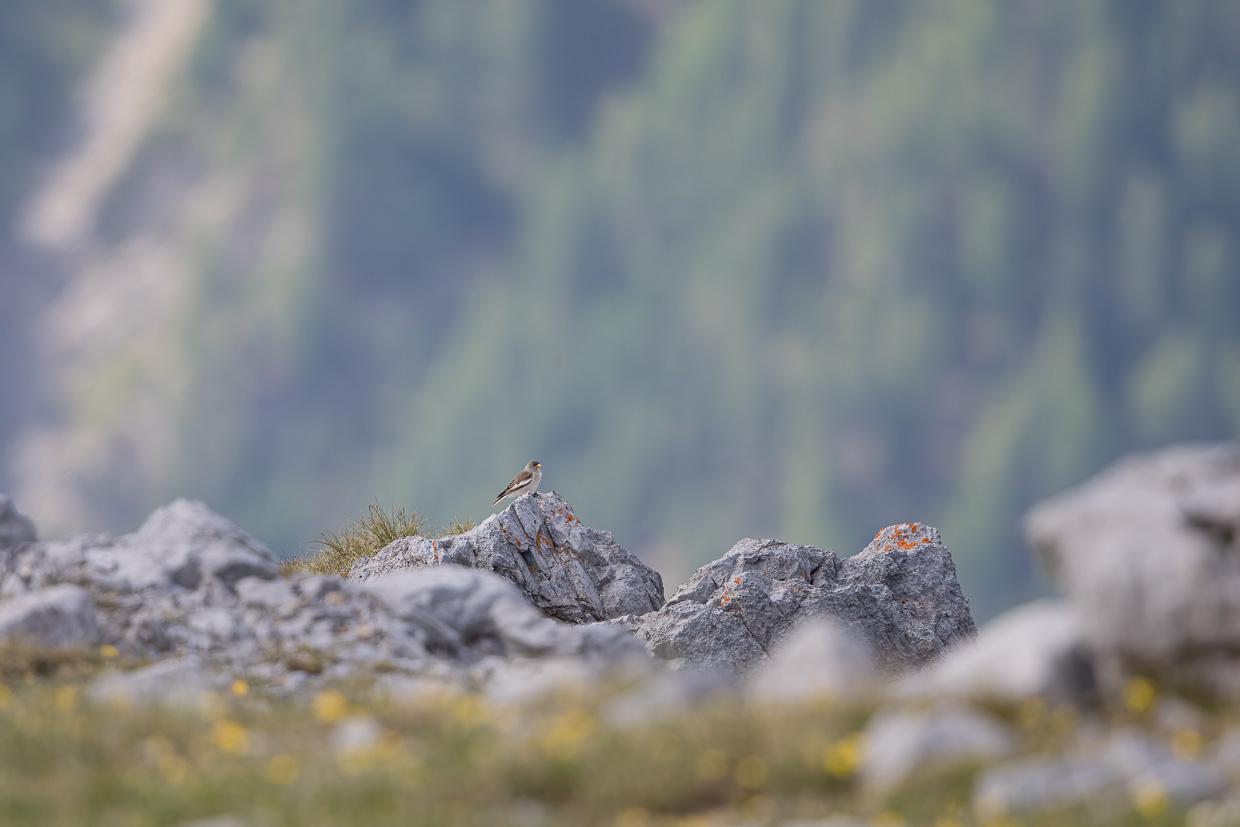 Es kommen immer mehr Leute, Zeit zu gehen. Wir machen uns an den Abstieg zur Alp la Schera. Unterwegs kommen uns zwei junge Männer entgegen. Sie fragen uns ebenfalls, ob wir die Schneehühner gesehen hätten. Offenbar sind diese hier ein Publikumsmagnet. Ein Steinschmätzer posiert auf einem Stein, darüber hinweg blicken wir nach Italien auf den tiefblauen Livignostausee. Von der Alp la Schera dauert der Abstieg ungefähr eine Stunde. Den erhofften Dreizehenspecht haben wir nicht gefunden, „nur“ Alpenmeisen, Haubenmeisen und Fichtenkreuzschnäbel. Was wir aber gefunden haben, ist das Hotel „Il Fuorn“, wir nun dankbar etwas zu trinken bestellen.