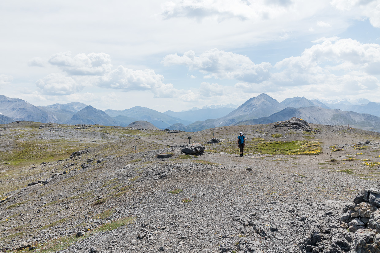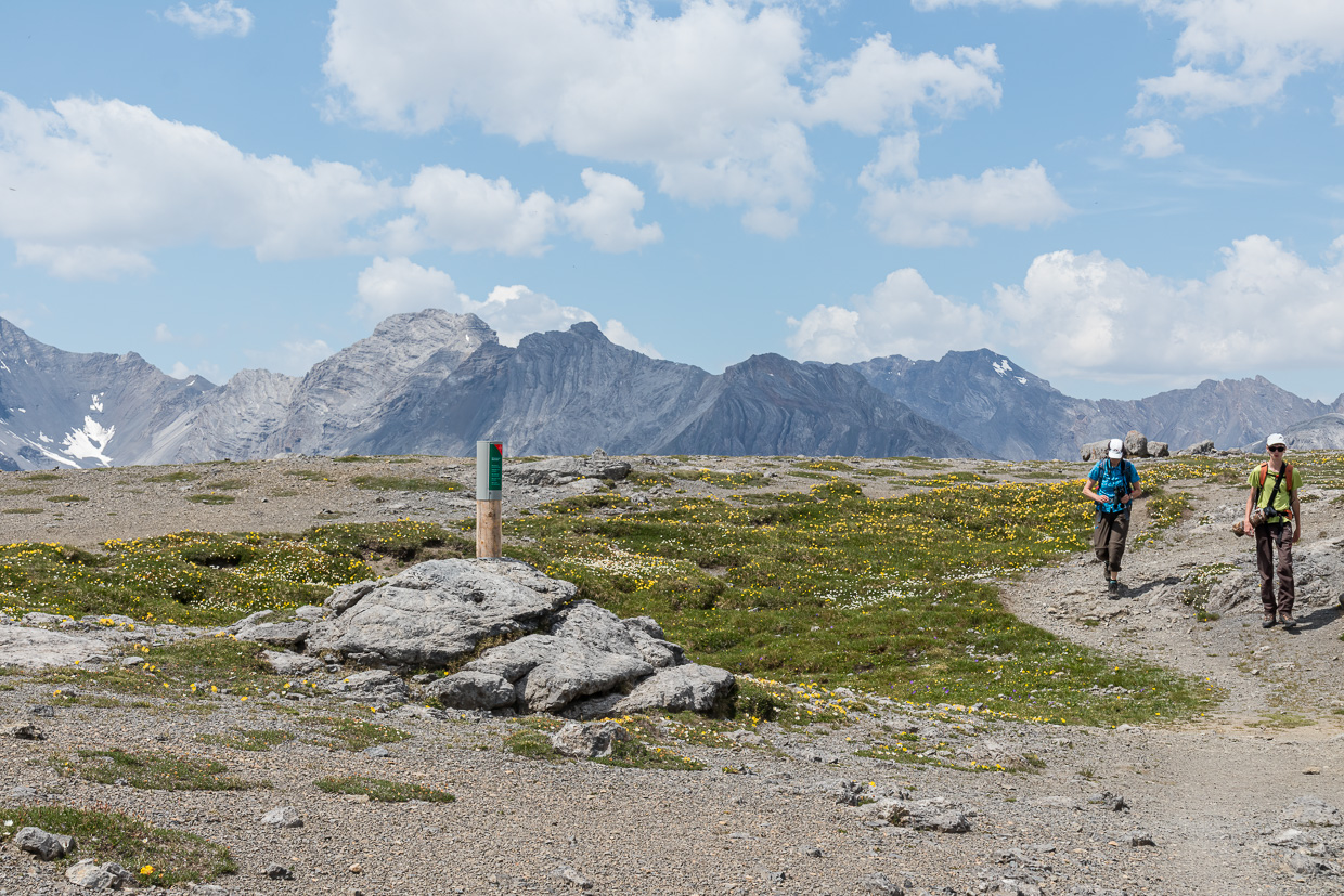 Unmissverständlich wird uns klar gemacht, dass wir nun den Schweizerischen Nationalpark betreten. Pfosten in regelmässigen Abständen markieren die Grenze, eine Infotafel klärt uns über den Park auf. Wir sind im Reich von Steinschmätzer und Ringdrosseln. Nicht nur die Vögel lösen bei uns Glücksmomente aus, auch die Aussicht ist grossartig. Aber da kommt uns doch tatsächlich der erste Mensch entgegen, ein Parkwächter. Nach dem langen, eher ebenen Wegstück geht es nun nochmals bergan auf den Gipfel des Munt la Schera. Den Gipfel selber muss man fast suchen, dieser ist eher ein Hochplateau. Wie es sich aber gehört, ist auch dieser mit einem Gipfelkreuz geschmückt, so dass man ihn doch noch findet. Inzwischen begegnen wir auch mehr Leuten. Eine Frau fragt mich, ob ich Schneehühner gesehen hätte. Leider nein. Dafür hüpfen wenig später Schneesperlinge umher.