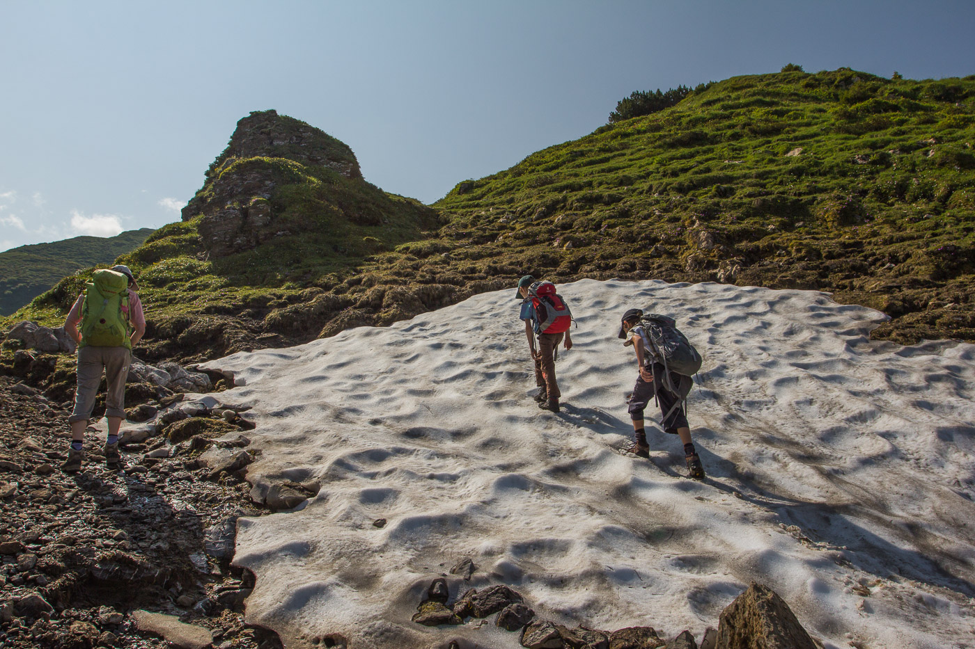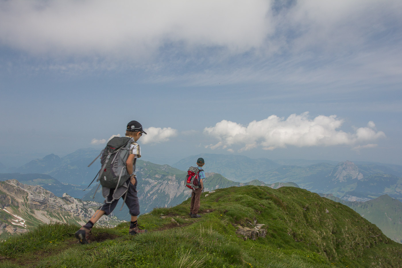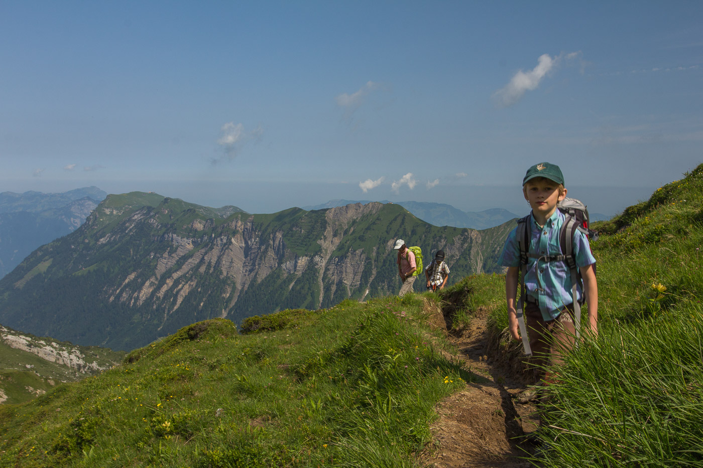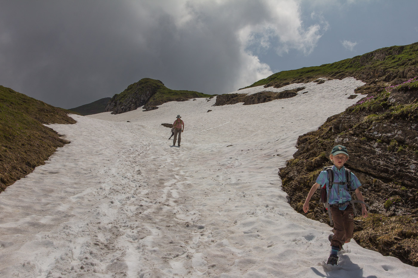 Gegenüber erblickten wir die Bergstationen von Fronalpstock und Klingenstock vom Skigebiet Stoos, wo wir unsere ersten Skiferien verbrachten. In der Ferne glitzerte der Vierwaldstättersee, dahinter erhob sich die Rigi. Schneefelder säumten nun unsere Weg. Die einen zogen es vor, darauf zu gehen, die anderen blieben auf dem Weg. Plötzlich läuft vor Silvan ein Tier weg: Ein Alpenschneehuhn! In seinem gesprenkelten Sommerkleid ist es bestens getarnt in dieser Umgebung. Die Alpenflora beginnt erst jetzt zu blühen. Es war faszinierend: Dort, wo tags zuvor der Schnee weggeschmolzen war, blühten nun Alpenglöcklein. Es ist wahrlich eine Blütenexplosion.