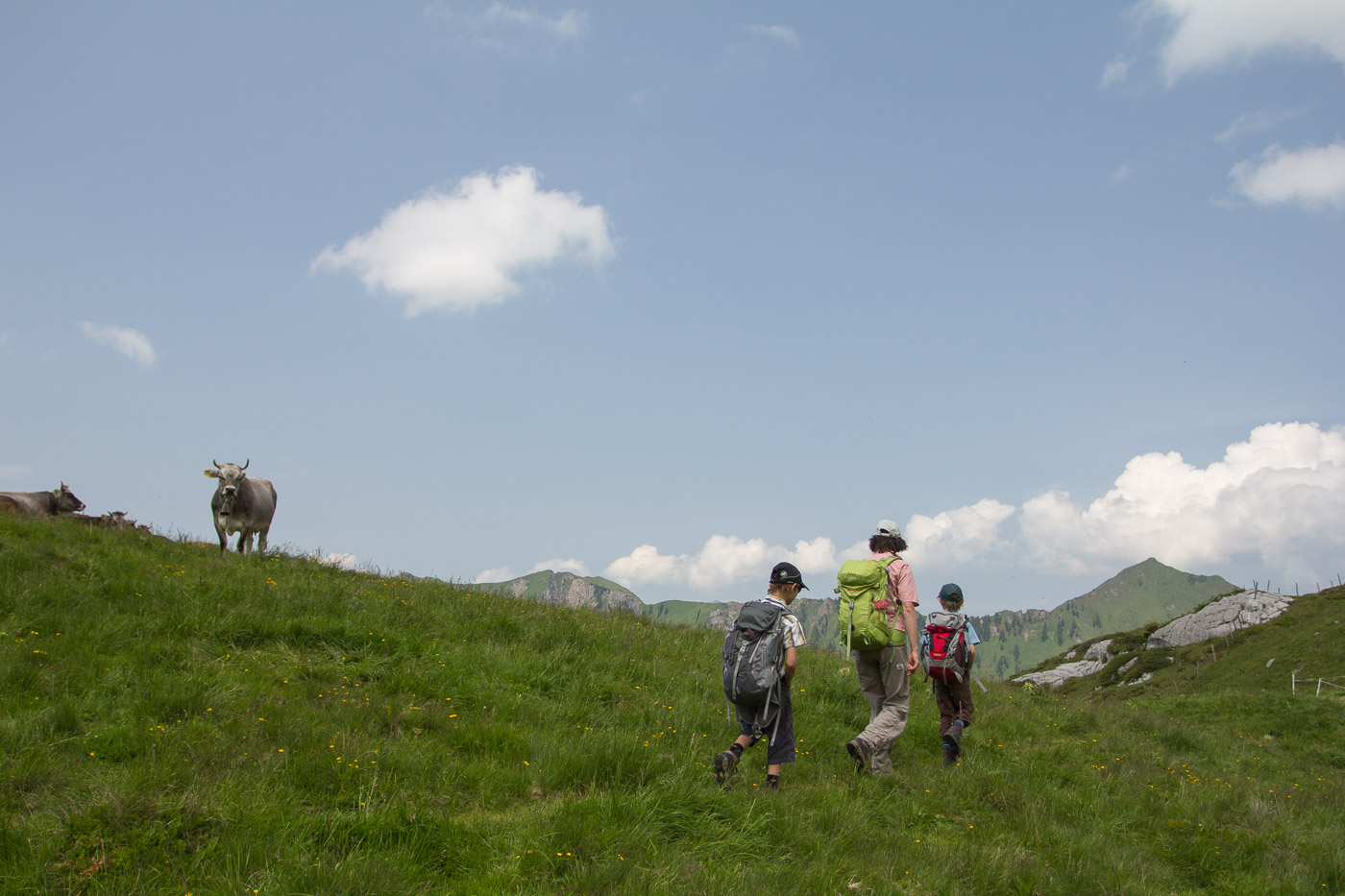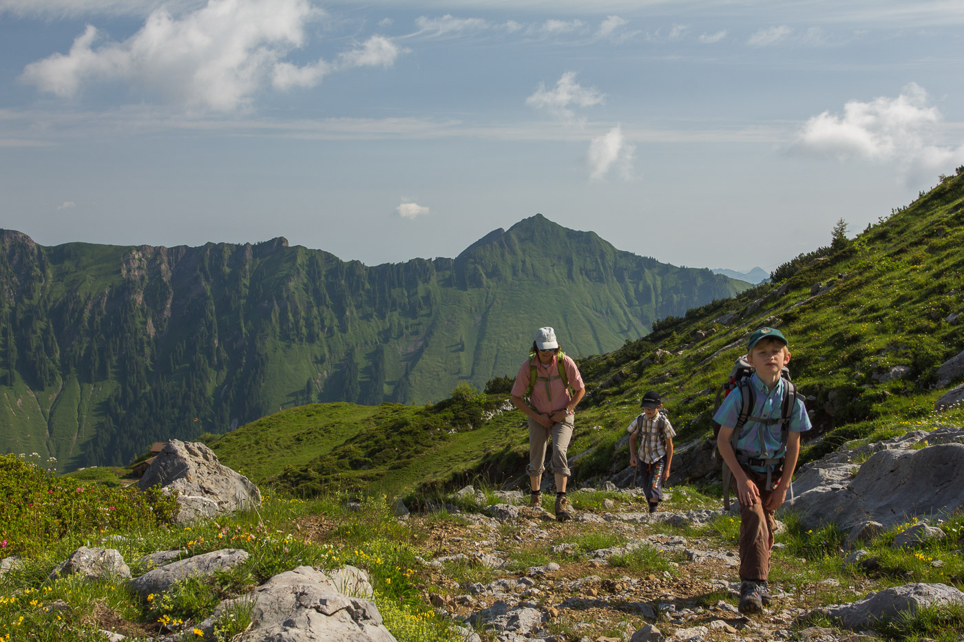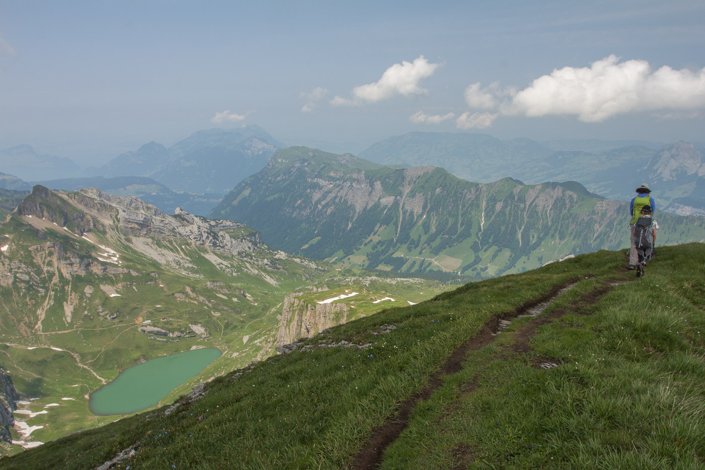 Gegenüber erblickten wir die Bergstationen von Fronalpstock und Klingenstock vom Skigebiet Stoos, wo wir unsere ersten Skiferien verbrachten. In der Ferne glitzerte der Vierwaldstättersee, dahinter erhob sich die Rigi. Schneefelder säumten nun unsere Weg. Die einen zogen es vor, darauf zu gehen, die anderen blieben auf dem Weg. Plötzlich läuft vor Silvan ein Tier weg: Ein Alpenschneehuhn! In seinem gesprenkelten Sommerkleid ist es bestens getarnt in dieser Umgebung. Die Alpenflora beginnt erst jetzt zu blühen. Es war faszinierend: Dort, wo tags zuvor der Schnee weggeschmolzen war, blühten nun Alpenglöcklein. Es ist wahrlich eine Blütenexplosion.