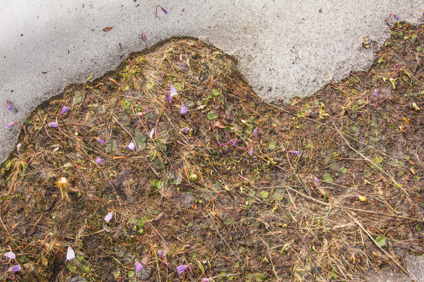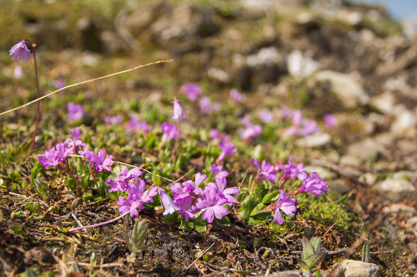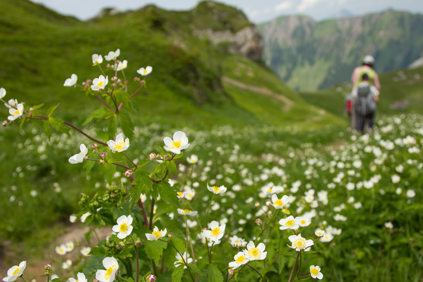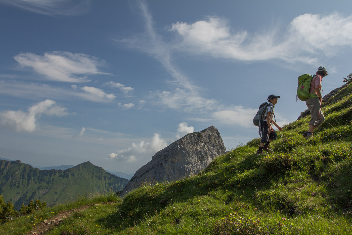 Gegenüber erblickten wir die Bergstationen von Fronalpstock und Klingenstock vom Skigebiet Stoos, wo wir unsere ersten Skiferien verbrachten. In der Ferne glitzerte der Vierwaldstättersee, dahinter erhob sich die Rigi. Schneefelder säumten nun unsere Weg. Die einen zogen es vor, darauf zu gehen, die anderen blieben auf dem Weg. Plötzlich läuft vor Silvan ein Tier weg: Ein Alpenschneehuhn! In seinem gesprenkelten Sommerkleid ist es bestens getarnt in dieser Umgebung. Die Alpenflora beginnt erst jetzt zu blühen. Es war faszinierend: Dort, wo tags zuvor der Schnee weggeschmolzen war, blühten nun Alpenglöcklein. Es ist wahrlich eine Blütenexplosion.