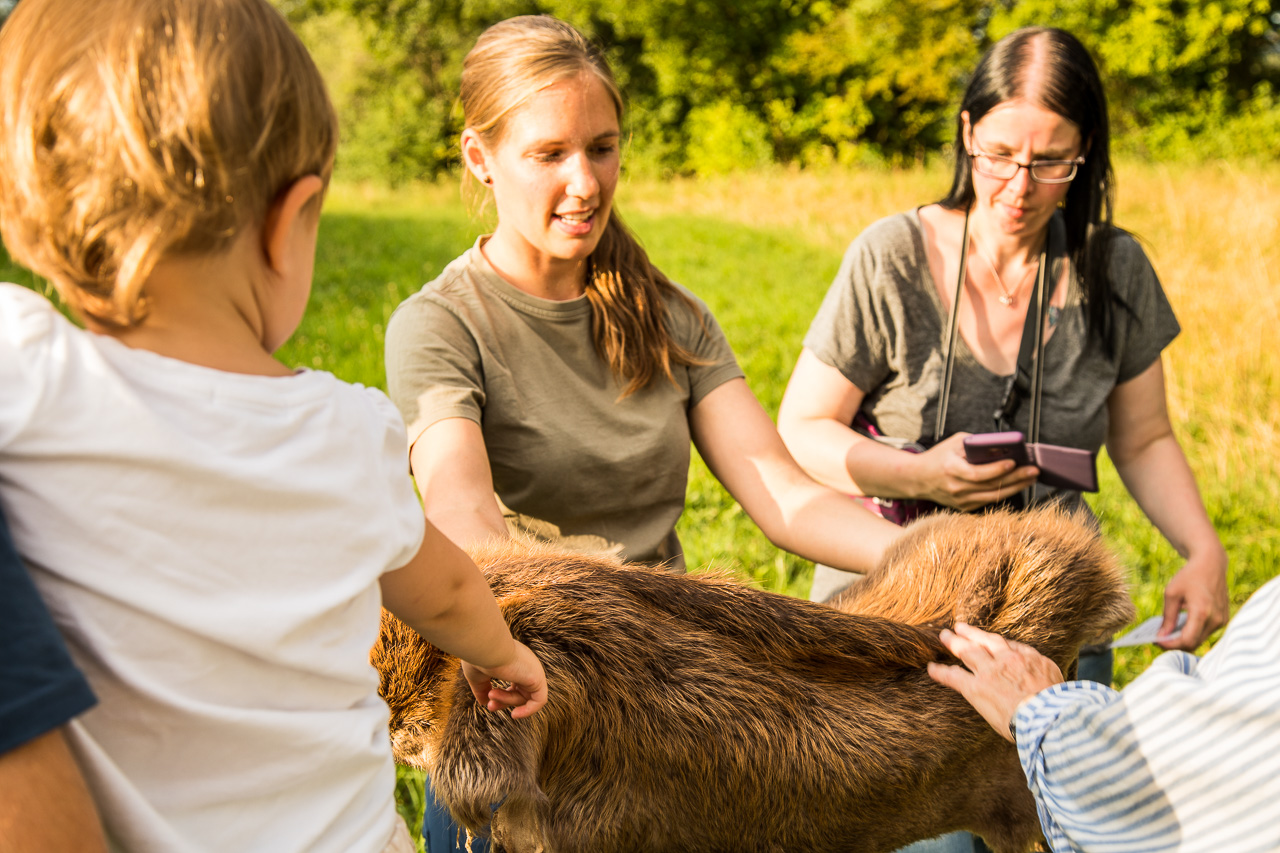Im Gänsemarsch folgen wir auf dem schmalen Pfad der Leiterin. An einem geeigneten Ort halten wir, Frau Peretti lässt uns Infos über den Biber zusammentragen. Was zeichnet dieses Tier aus? Es hat ein sehr dichtes Fell (23’000 Haare auf einem 1 cm²), Nagerzähne, in denen Eisen eingelagert ist (deshalb die rötliche Färbung), das macht sie besonders hart. Da sich die oberen und unteren Zähne immer reiben, nutzen sie sich ab. Würden sie das nicht tun, würden die Zähne wachsen, bis sie sich in den Ober- oder Unterkiefer bohren und das Tier verhungert. Die Vorderpfoten sind als Greifhände ausgebildet, während die Hinterpfoten Schwimmhäute aufweisen. Frau Peretti lässt uns ein Biberfell streicheln, ein Schädelpräparat zeigt die mächtigen Nagezähne. Dann lässt sie eine Flasche und Tuch, das mit der Flüssigkeit getränkt ist, herumreichen. Es handelt sich um Bibergeil, einem Sekret des Bibers, das er für die Fellpflege und zur Reviermarkierung verwendet.