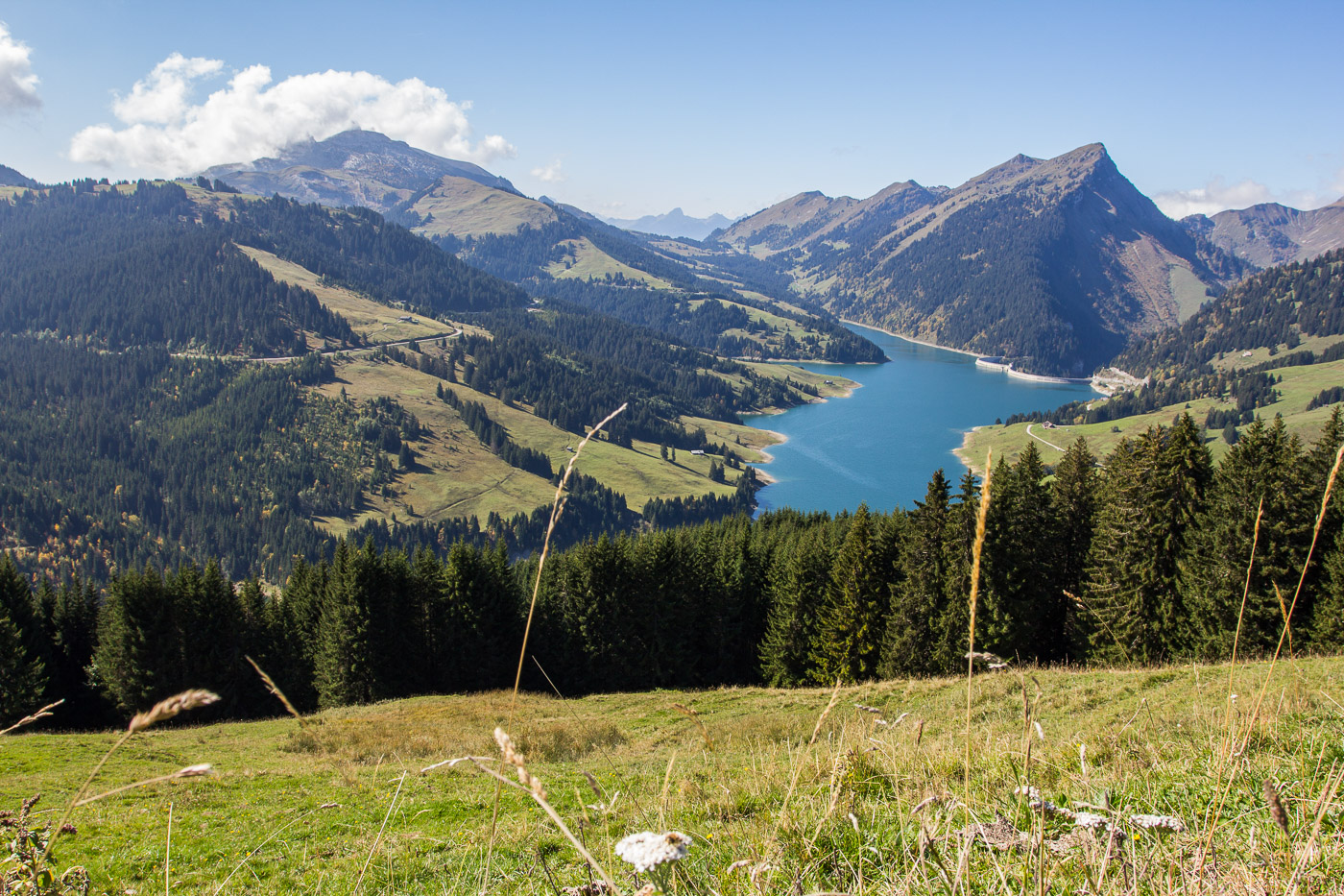 Wir waren wieder auf der Alpine Bike 1. Und diese folgt nun einem Wanderweg zum Lac de l’Hongrin hinunter. Oder ist es doch eher ein Bachbett? Jetzt erwachten die Jungs definitiv, jeder wollte der erste sein. Was nun folgte, ist nicht eine Schotterstrasse, wie man es von ausgeschilderten Bikerouten gewohnt ist, sondern Wurzeln, Absätze, Bollensteine, Schlamm, Dreck! Und natürlich musste ich im tiefsten Schlammloch absteigen, während die Jungs einfach durchflitzten. Am Ende dieses Trails schauten wir uns und die Bikes an: Alles war mit Dreck verspritzt. Heute war definitiv eine Dusche fällig. Wir fuhren zum Ufer des Lac de l’Hongrin, wo Fischer ihr Anglerglück versuchten. Bevor die Kinder wieder das halbe Ufer umgebaut hatten mit Strassen und Festungen, machten wir uns nach auf den Weg. Wir mussten wieder zur Strasse hoch, was nochmals einen zünftigen Aufstieg zur Folge hatte. Spannend war das nicht, einzig der Blick in die Schlucht war noch beeindruckend. Bald hatte sich der Kreis der Rundtour geschlossen. Der Jüngere war müde, er fuhr mit der Mutter nach La Lécherette, während der Ältere und ich nochmals über die Weiden und durch den Wald zurück zum Auto fuhren. In La Lécherette beschlossen wir die Tour mit einem Rivella und blinzelten zum Pic Chaussy rüber. Denn dort oben wollten wir am nächsten Tag stehen.