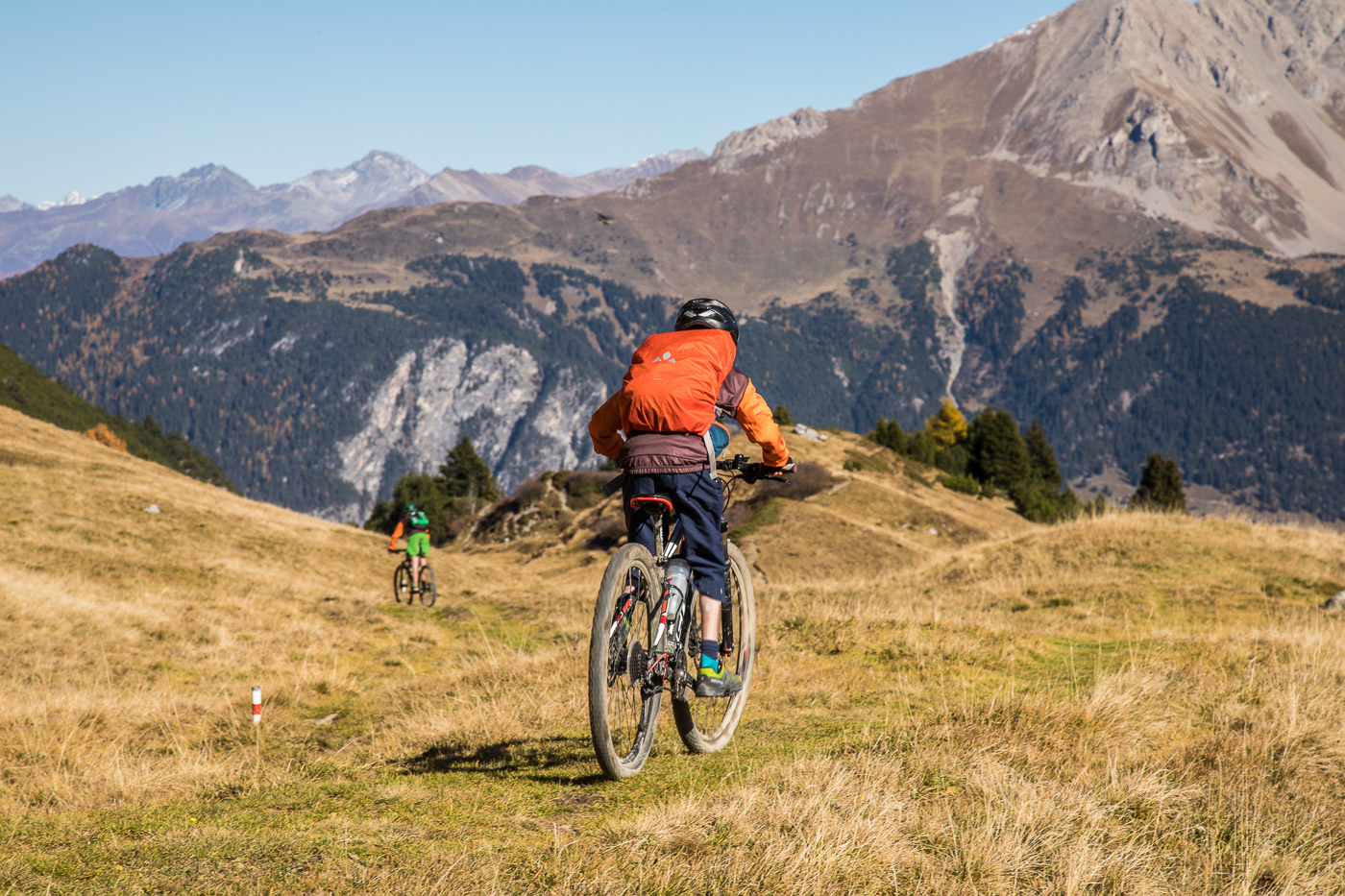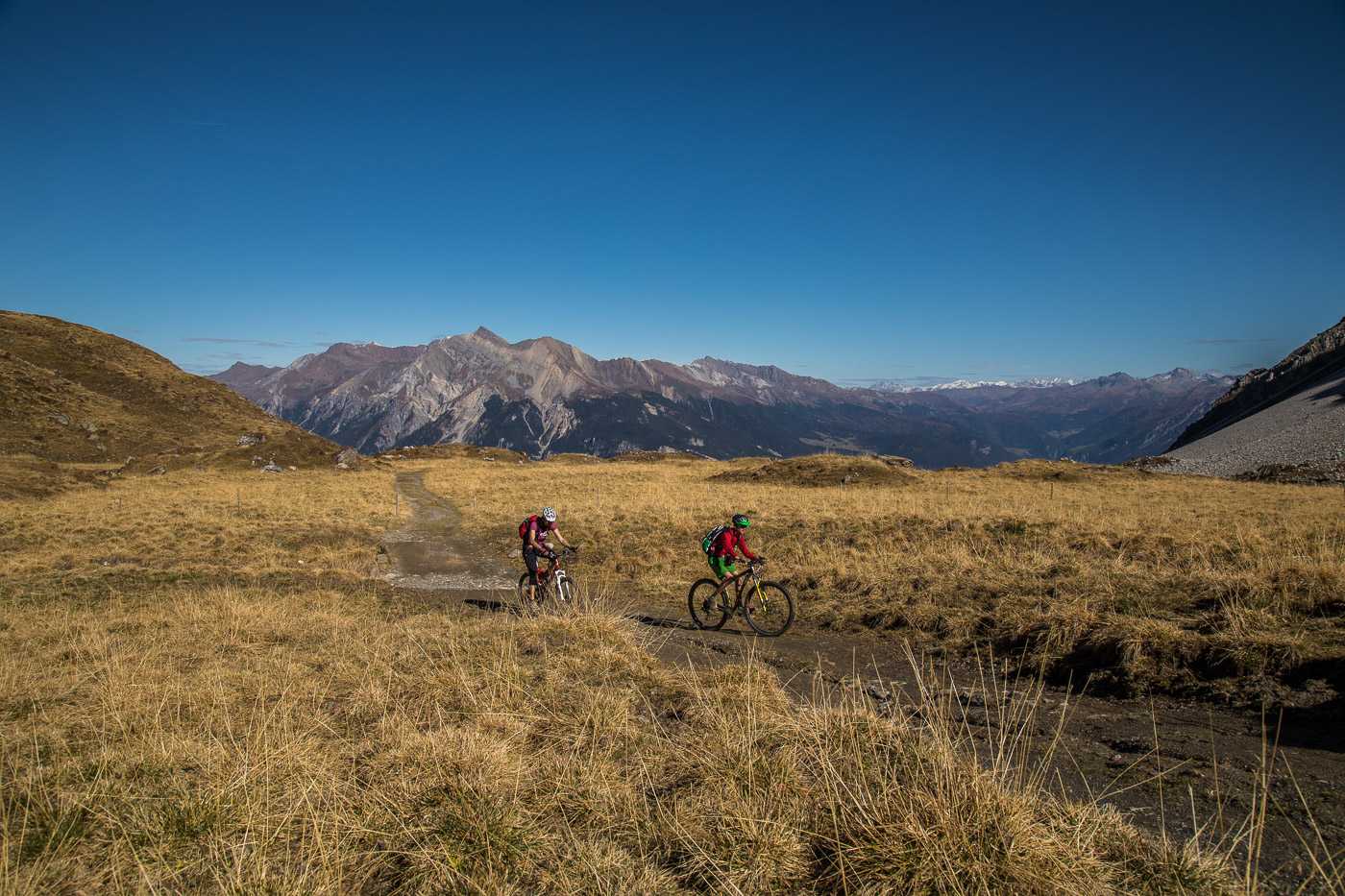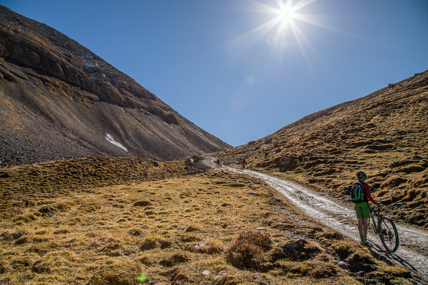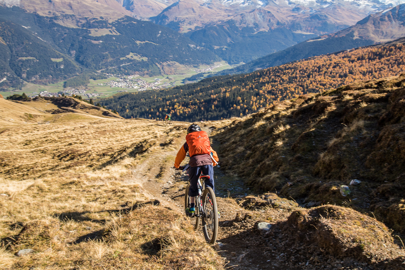 Bei Munter füllen wir nochmals unsere Trinkflaschen, dann wird es so steil, dass wir (schon wieder) schieben müssen. Die Landschaft ist eindrücklich, wir haben nun die Baumgrenze erreicht. Es ist einfach fantastisch, das Bündnerland im goldenen Herbst. Der Weg ist ganz matschig, da vor noch nicht allzu langer Zeit Schnee gelegen hat, wir bleiben fast kleben. Unterdessen ist Silvan erwacht, er strotzt vor Energie. Wir nähern uns dem Pass. Nun müssen wir entscheiden: Nochmals 100 Höhenmeter schieben zur Kirche oder vom Pass her abfahren? Fabian ist für die Variante Pass: „Wozu nochmals 100 Meter aufwärts, für dass man dann weniger Singletrails hat?“ Silvan schliesst sich natürlich diesem Argument an.