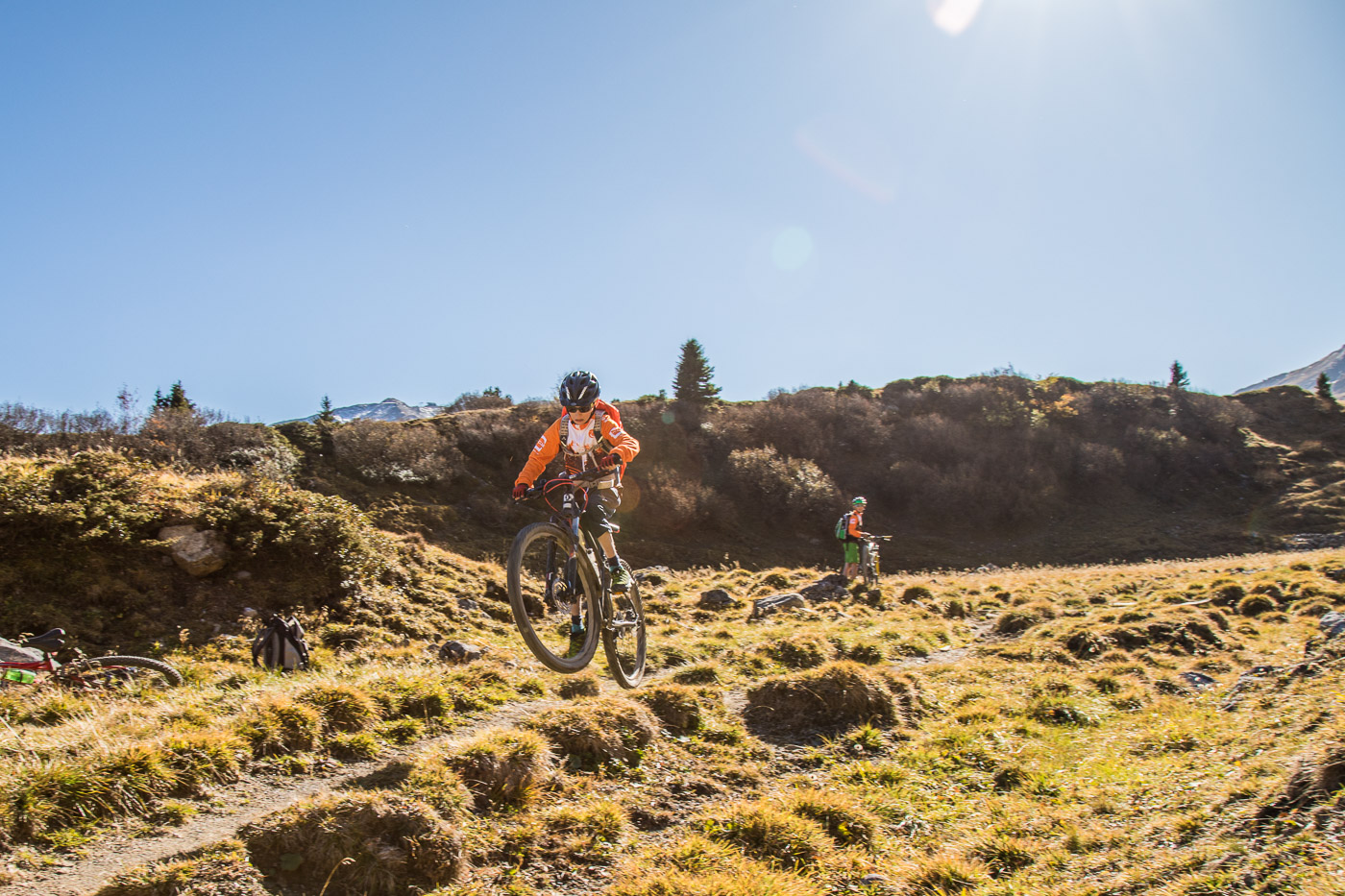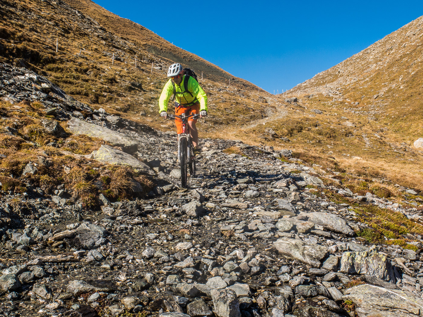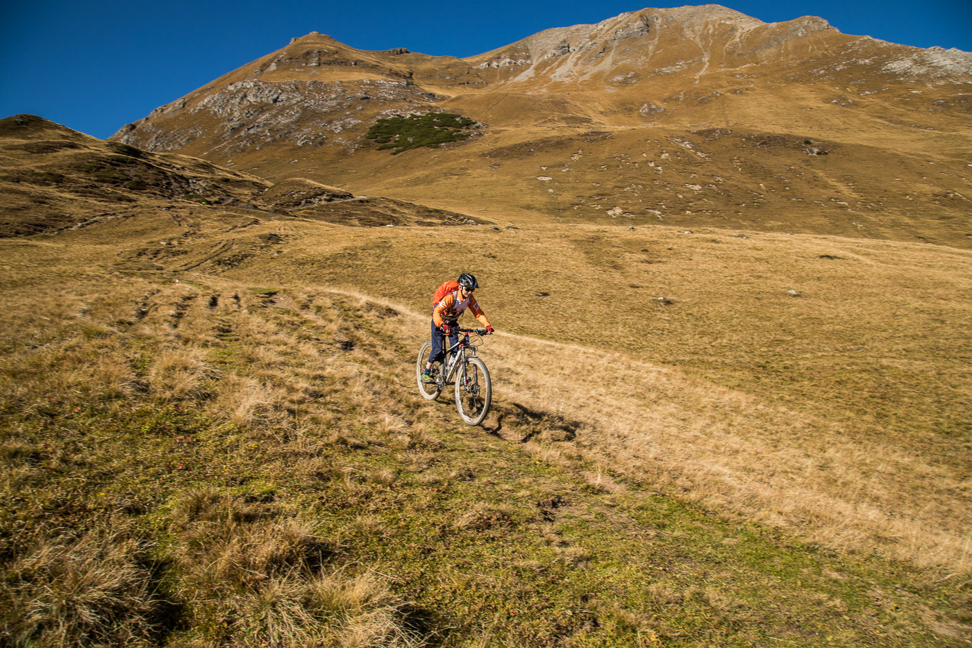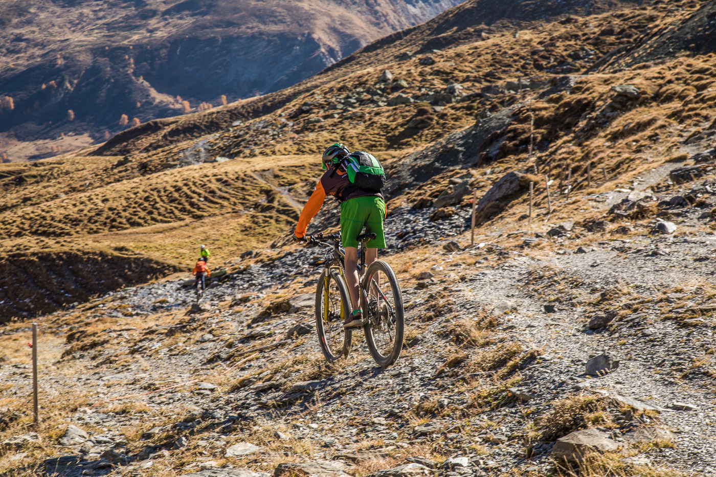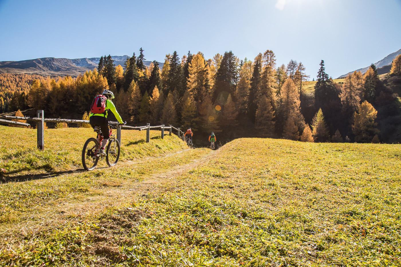 Bei Munter füllen wir nochmals unsere Trinkflaschen, dann wird es so steil, dass wir (schon wieder) schieben müssen. Die Landschaft ist eindrücklich, wir haben nun die Baumgrenze erreicht. Es ist einfach fantastisch, das Bündnerland im goldenen Herbst. Der Weg ist ganz matschig, da vor noch nicht allzu langer Zeit Schnee gelegen hat, wir bleiben fast kleben. Unterdessen ist Silvan erwacht, er strotzt vor Energie. Wir nähern uns dem Pass. Nun müssen wir entscheiden: Nochmals 100 Höhenmeter schieben zur Kirche oder vom Pass her abfahren? Fabian ist für die Variante Pass: „Wozu nochmals 100 Meter aufwärts, für dass man dann weniger Singletrails hat?“ Silvan schliesst sich natürlich diesem Argument an.