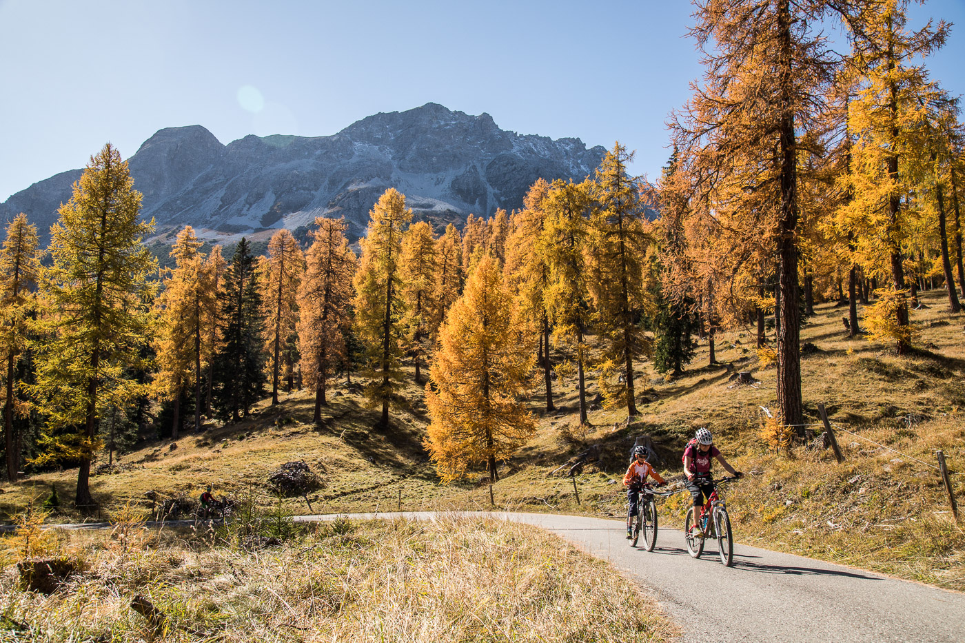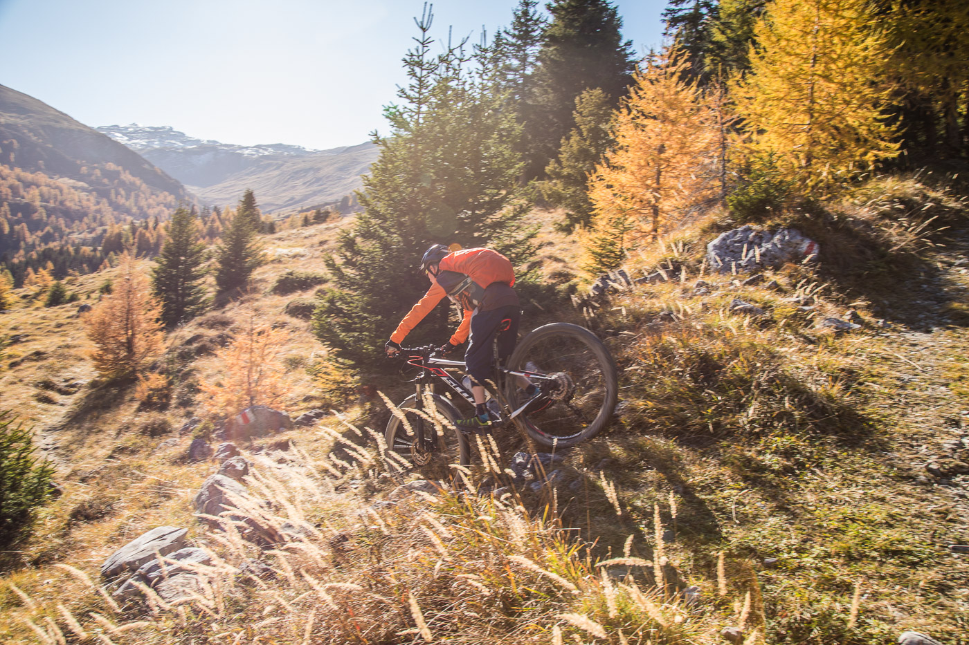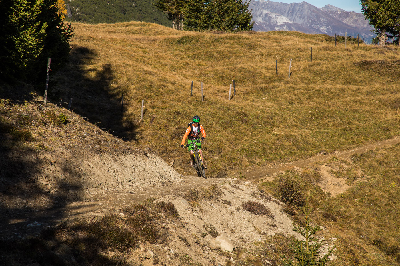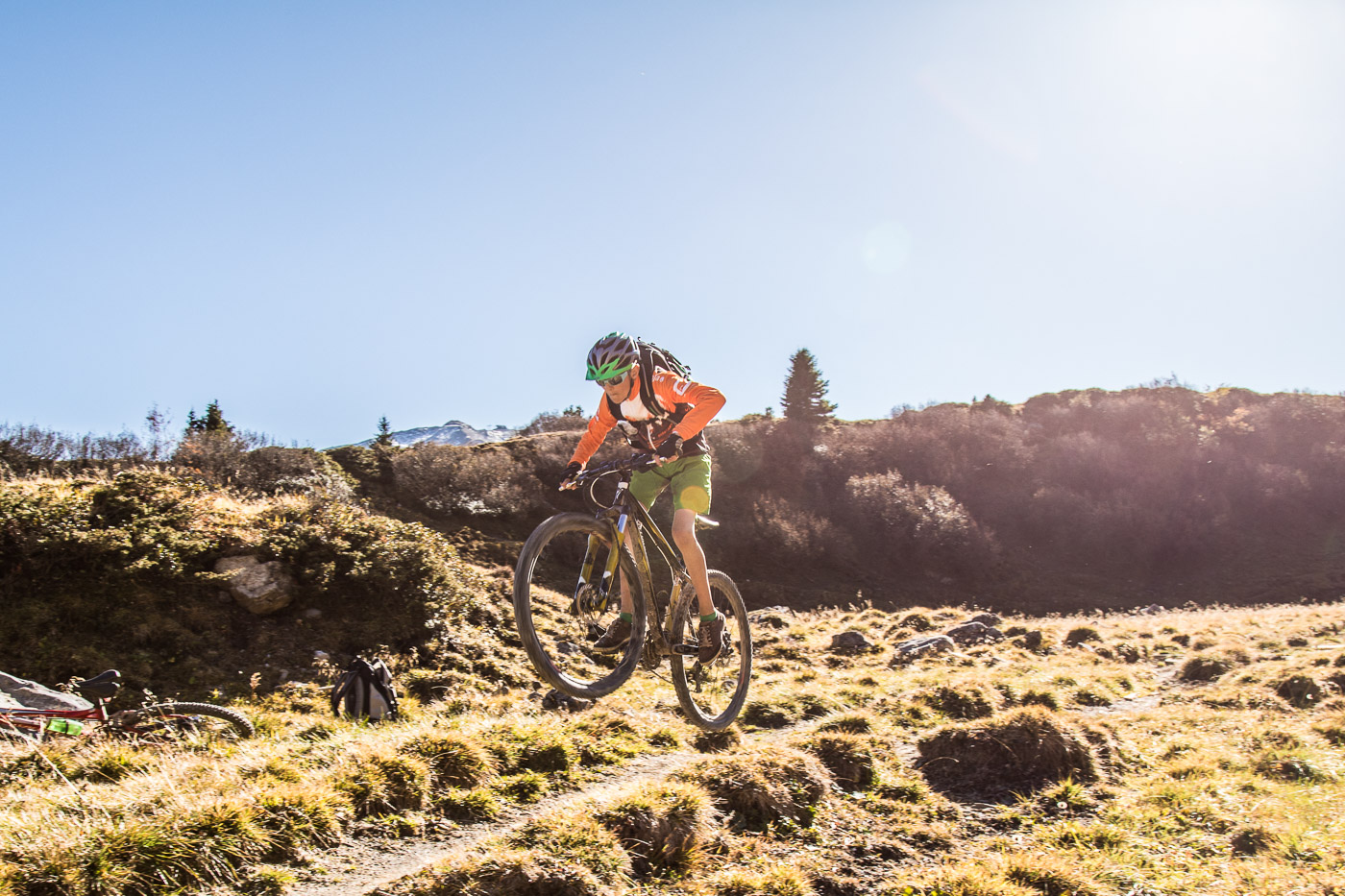 Bei Munter füllen wir nochmals unsere Trinkflaschen, dann wird es so steil, dass wir (schon wieder) schieben müssen. Die Landschaft ist eindrücklich, wir haben nun die Baumgrenze erreicht. Es ist einfach fantastisch, das Bündnerland im goldenen Herbst. Der Weg ist ganz matschig, da vor noch nicht allzu langer Zeit Schnee gelegen hat, wir bleiben fast kleben. Unterdessen ist Silvan erwacht, er strotzt vor Energie. Wir nähern uns dem Pass. Nun müssen wir entscheiden: Nochmals 100 Höhenmeter schieben zur Kirche oder vom Pass her abfahren? Fabian ist für die Variante Pass: „Wozu nochmals 100 Meter aufwärts, für dass man dann weniger Singletrails hat?“ Silvan schliesst sich natürlich diesem Argument an.