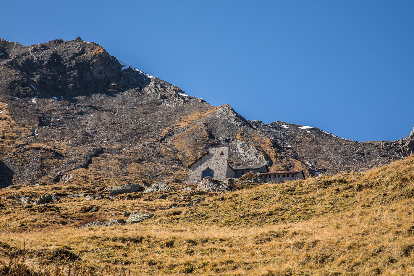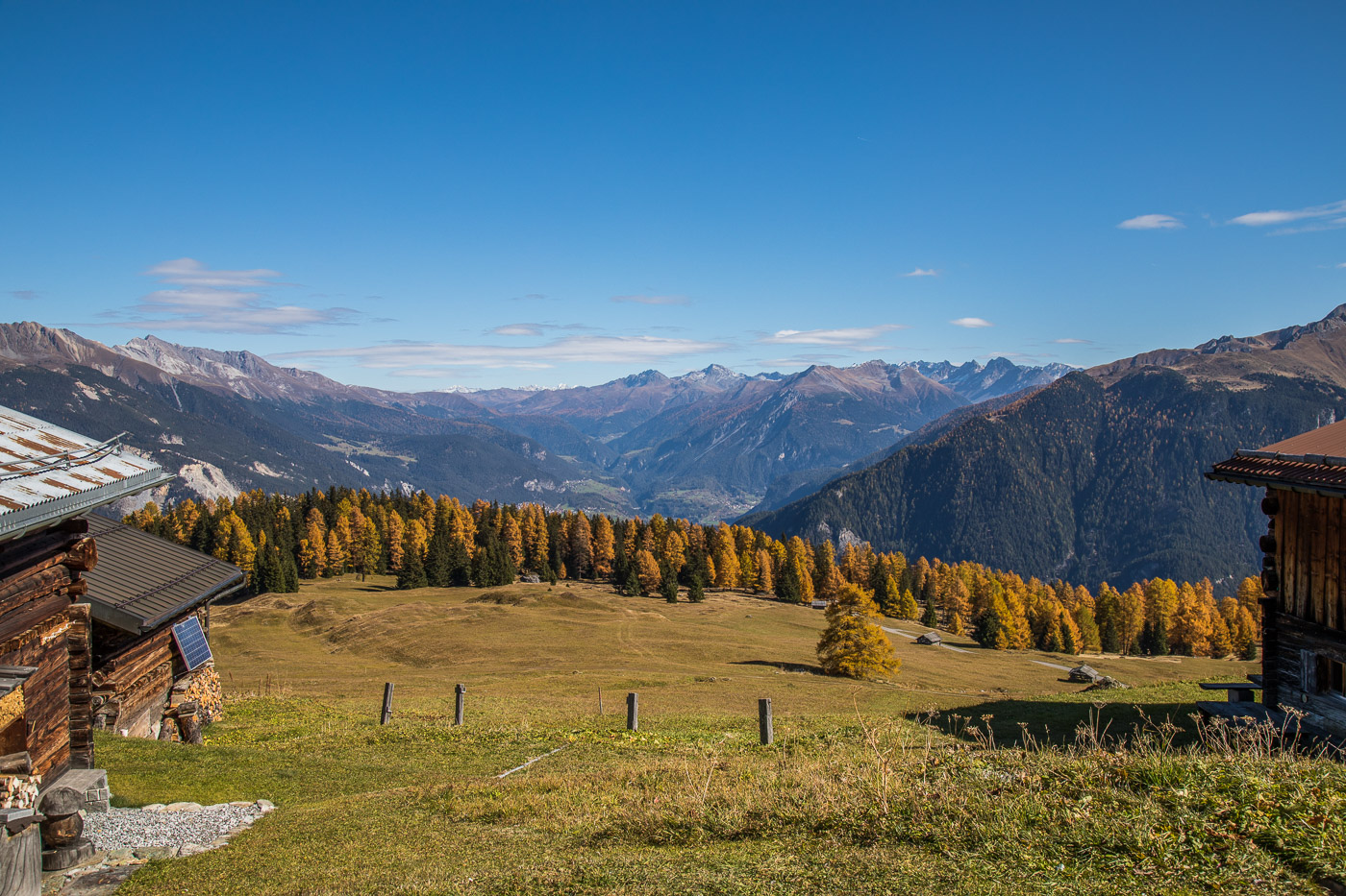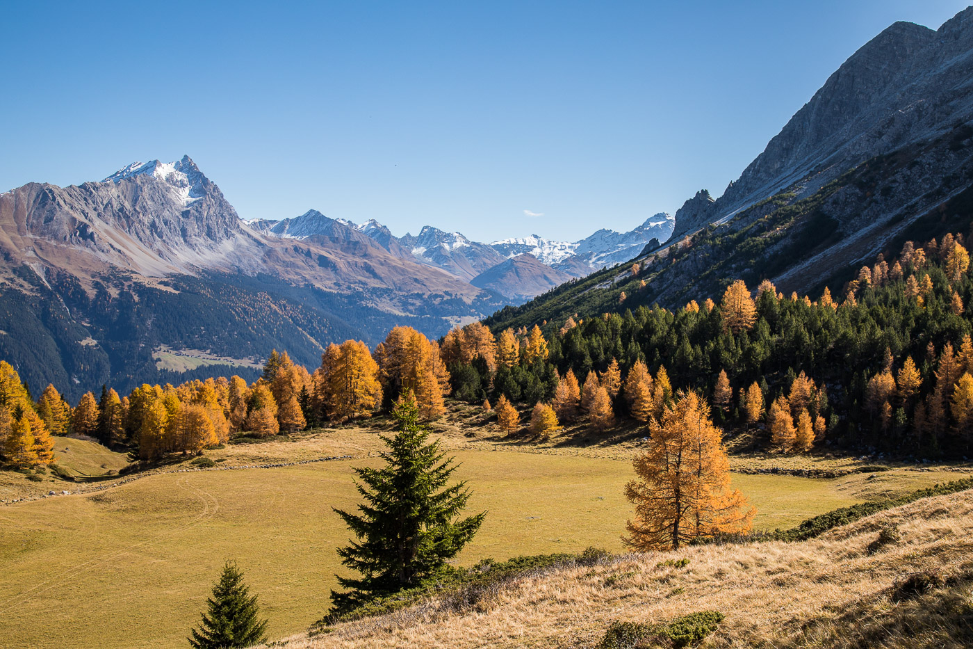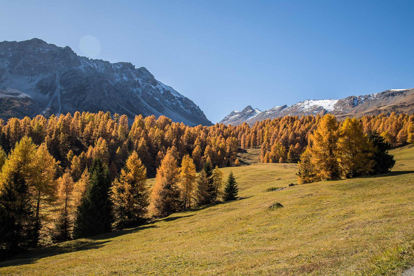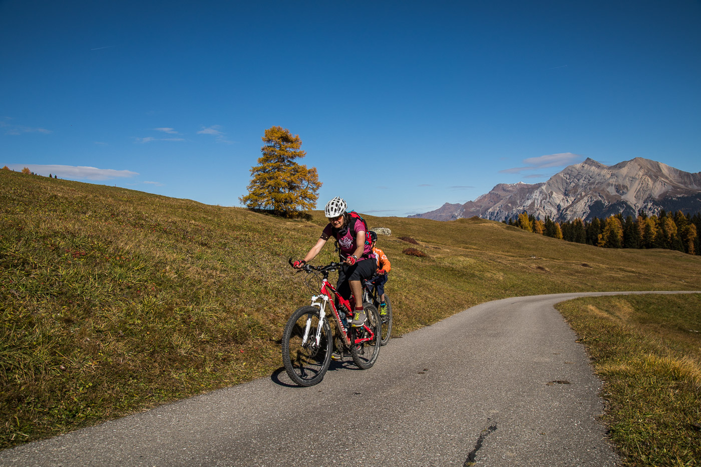 Bei Munter füllen wir nochmals unsere Trinkflaschen, dann wird es so steil, dass wir (schon wieder) schieben müssen. Die Landschaft ist eindrücklich, wir haben nun die Baumgrenze erreicht. Es ist einfach fantastisch, das Bündnerland im goldenen Herbst. Der Weg ist ganz matschig, da vor noch nicht allzu langer Zeit Schnee gelegen hat, wir bleiben fast kleben. Unterdessen ist Silvan erwacht, er strotzt vor Energie. Wir nähern uns dem Pass. Nun müssen wir entscheiden: Nochmals 100 Höhenmeter schieben zur Kirche oder vom Pass her abfahren? Fabian ist für die Variante Pass: „Wozu nochmals 100 Meter aufwärts, für dass man dann weniger Singletrails hat?“ Silvan schliesst sich natürlich diesem Argument an.