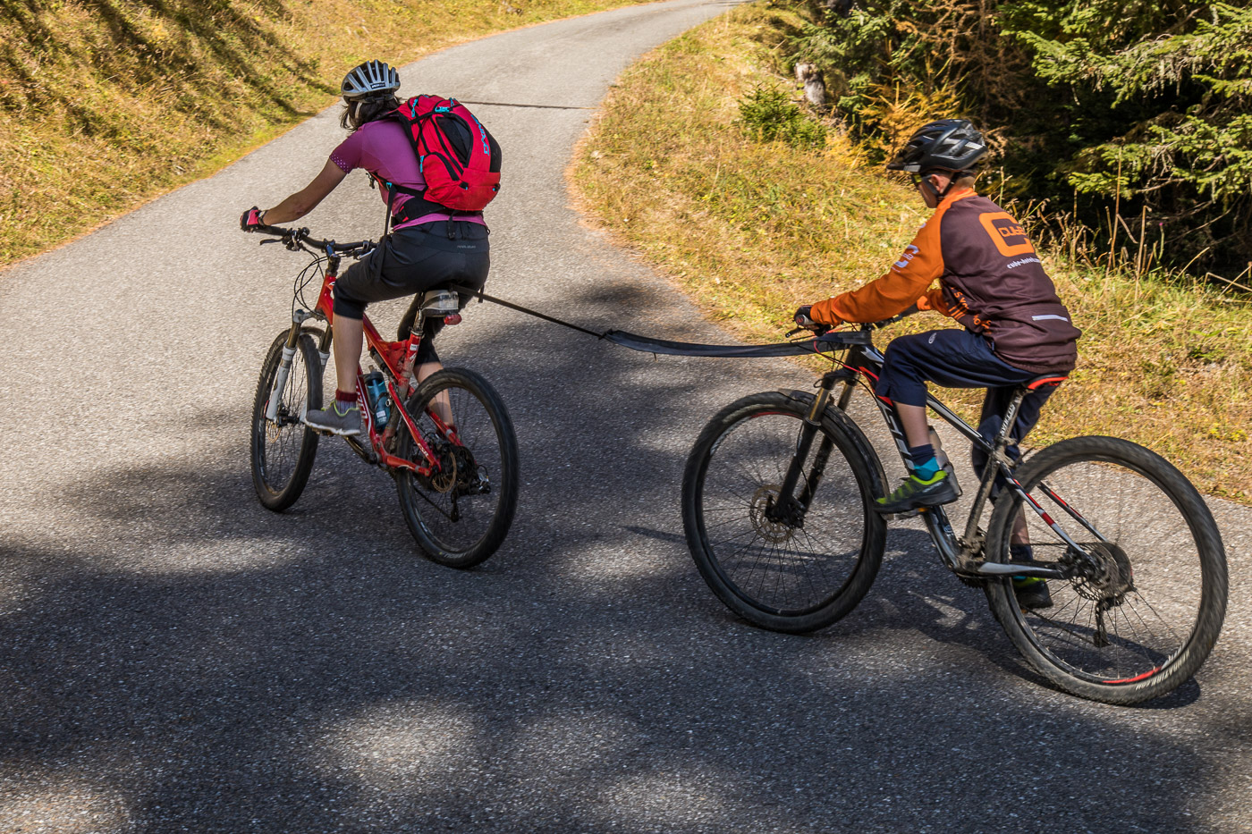 Silvan hat heute nicht den besten Tag erwischt, er kämpft. Ich entlaste ihn vom Rucksack, das reicht aber noch nicht. Die Frau bastelt aus einem Reserveschlauch und einem Bändel des Fotoapparates ein Abschleppseil und zieht ihn hoch. So gelangen wir mal bis zum Parkplatz, wo für alle Motorfahrzeuge Schluss ist. Bei einer verfallenden Hütte rasten wir und bestaunen die schöne Gegend.