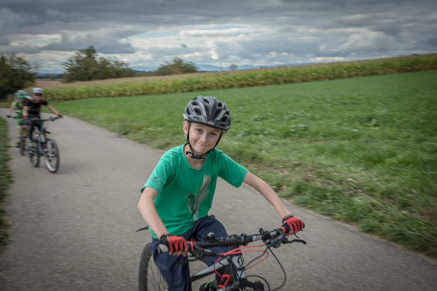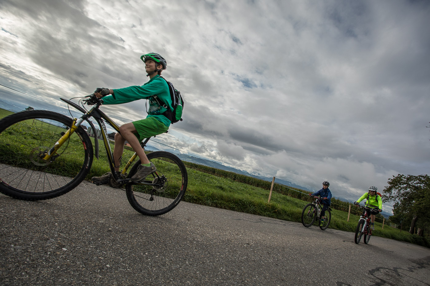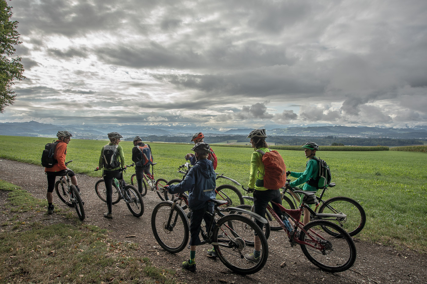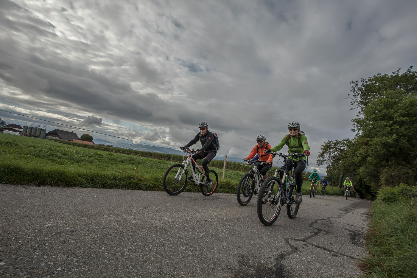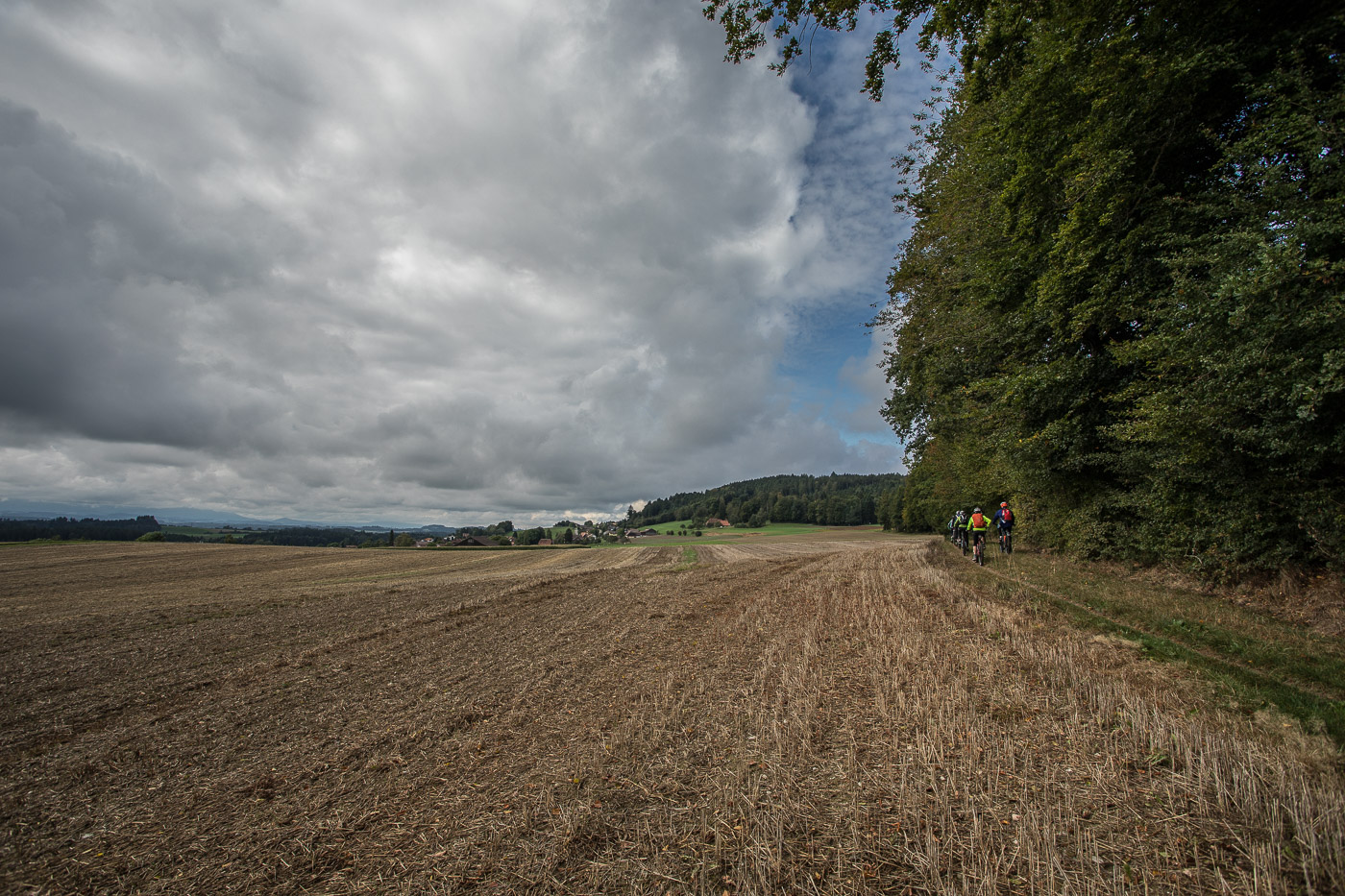 Pünktlich um neun Uhr starten acht Mitglieder des SAC Homberg zur Tour. Es ist eine generationenübergreifende Gruppe, der Jüngste ist 12 Jahre alt, der Älteste 79! Wir starten also in Meikirch, gelegen im Irgendwo zwischen Bern und Biel, und fahren zuerst einmal über die Felder, vorbei an Weilern mit so lustigen Namen wie Aetzikofen und Jetzikofen. Kühe weiden, dazwischen huscht ein Fuchs vorbei. Wir erblicken die beiden Hausberge von Bern, den Bantiger und den Gurten. Dick und schwer hängen dunkle Wolken über uns und liefern sich mit der Sonne einen Kampf um die Vorherrschaft am Himmel. Weiter geht es über Feld und durch Wald, in abwechslungsreichem Auf und Ab. Nach 13 Kilometer ist im Weiler Schüpberg im gleichnamigen Restaurant eine Kaffeepause mit Nussgipfel fällig, die ideale Stärkung für Mountainbiker.