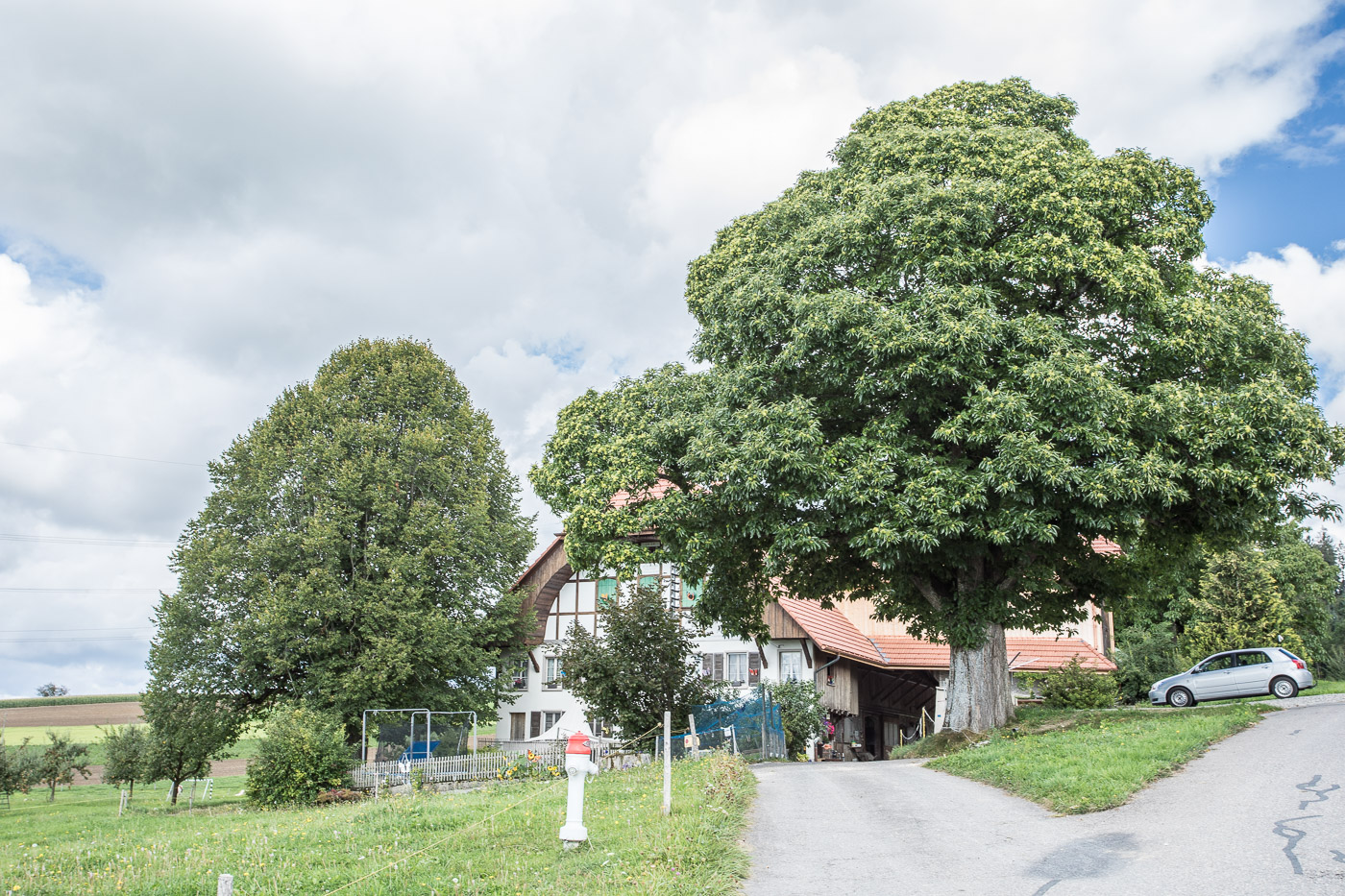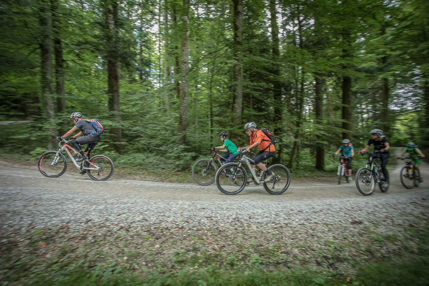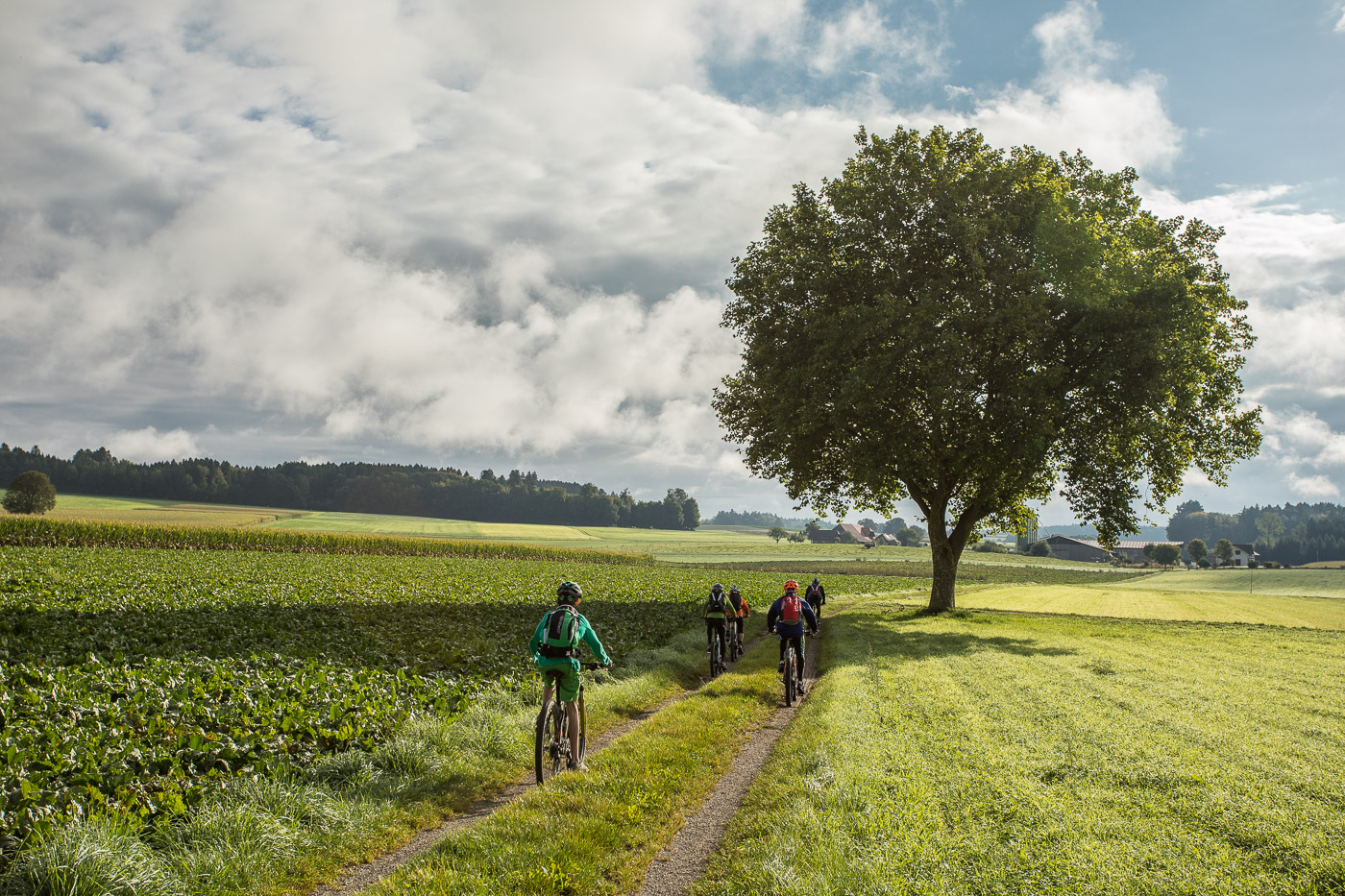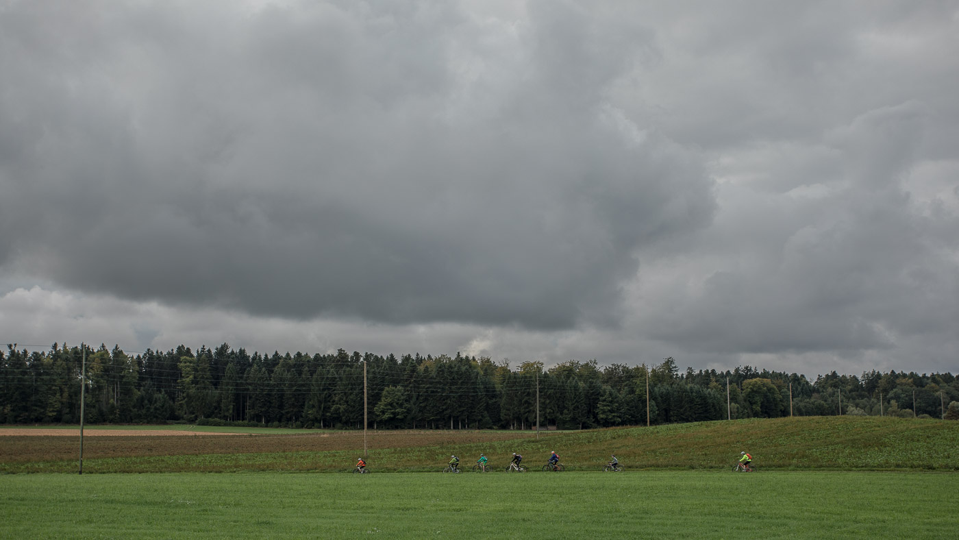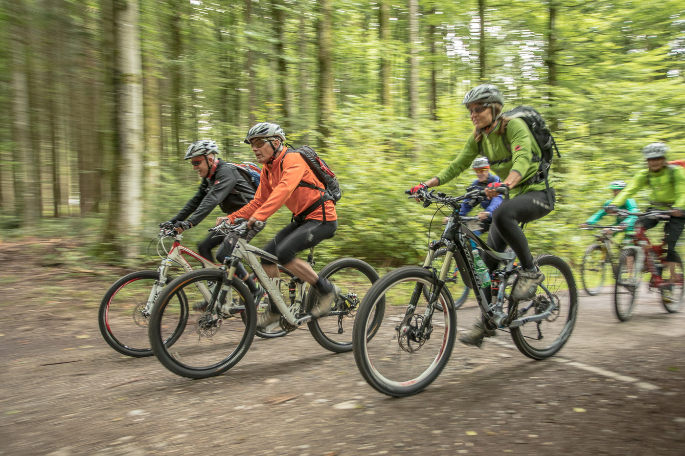 Pünktlich um neun Uhr starten acht Mitglieder des SAC Homberg zur Tour. Es ist eine generationenübergreifende Gruppe, der Jüngste ist 12 Jahre alt, der Älteste 79! Wir starten also in Meikirch, gelegen im Irgendwo zwischen Bern und Biel, und fahren zuerst einmal über die Felder, vorbei an Weilern mit so lustigen Namen wie Aetzikofen und Jetzikofen. Kühe weiden, dazwischen huscht ein Fuchs vorbei. Wir erblicken die beiden Hausberge von Bern, den Bantiger und den Gurten. Dick und schwer hängen dunkle Wolken über uns und liefern sich mit der Sonne einen Kampf um die Vorherrschaft am Himmel. Weiter geht es über Feld und durch Wald, in abwechslungsreichem Auf und Ab. Nach 13 Kilometer ist im Weiler Schüpberg im gleichnamigen Restaurant eine Kaffeepause mit Nussgipfel fällig, die ideale Stärkung für Mountainbiker.