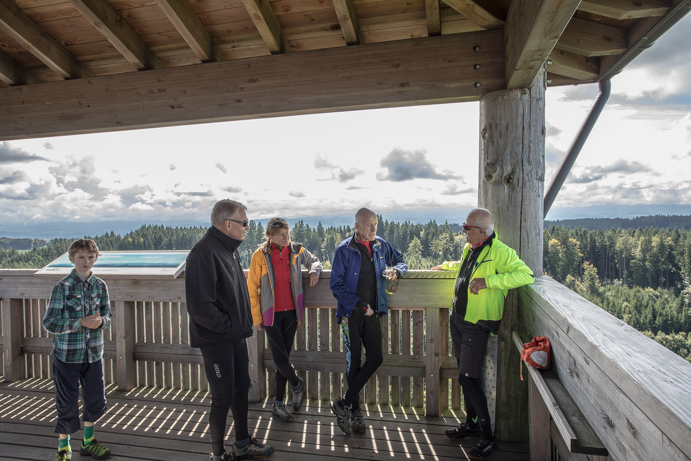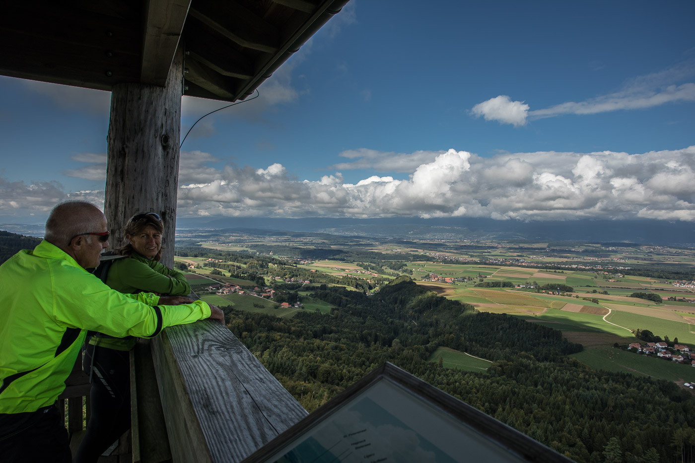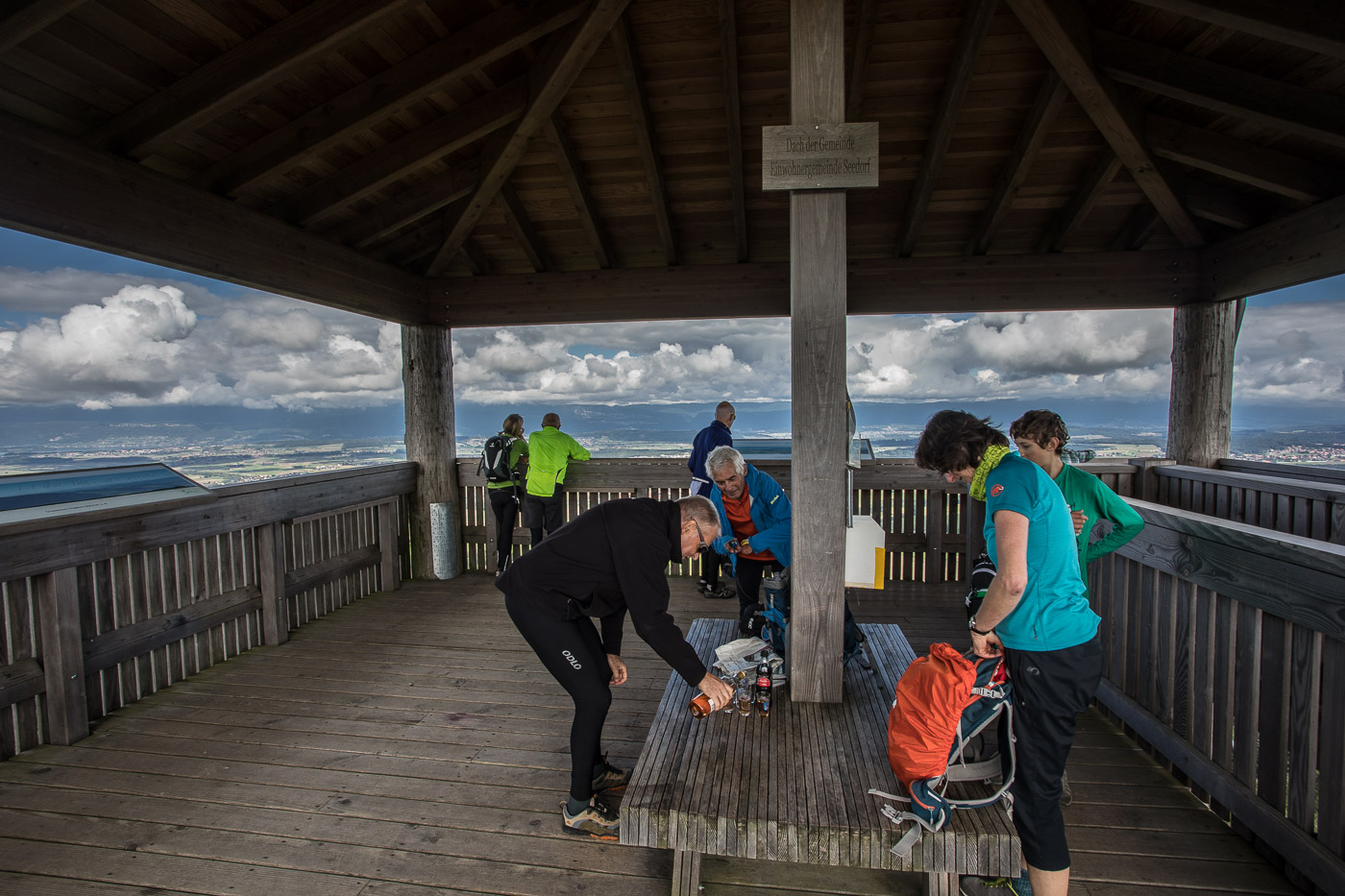 Weiter geht es durch Grächwil und Wahlendorf, hoch zum Chutze auf 820 Meter über Meer. Das ist der höchste Punkt der Tour, wäre da nicht der Chutzeturm, der uns nochmals von 40 Meter höher auf die Umgebung schauen lässt. Der Aufstieg scheint endlos, aber wir erreichen die oberste Plattform doch noch – und erleben eine Überraschung: Wir treffen einen SAC-Kameraden an, der eigentlich Co-Leiter hätte sein sollen, aber angeblich verhindert sei. Um uns nämlich einen Apéro zu bereiten zuoberst auf dem Turm! Das ist doch mal eine freudige Überraschung. Wir erblicken den Neuenburger- und den Bielersee, der Blick schweift über weite Teile des Mittellandes. Wir würden auch fast den ganzen Alpenkranz vom Boden- bis zum Genfersee erblicken sowie die ganze Jurakette, aber dicke Wolken verhindern die Sicht.
