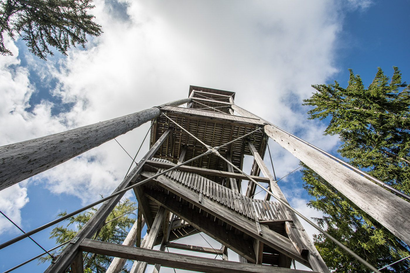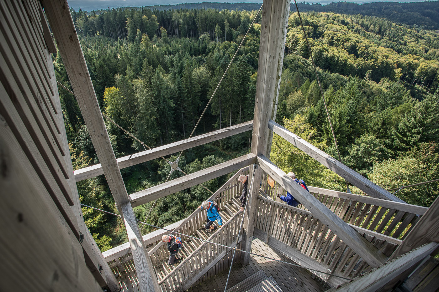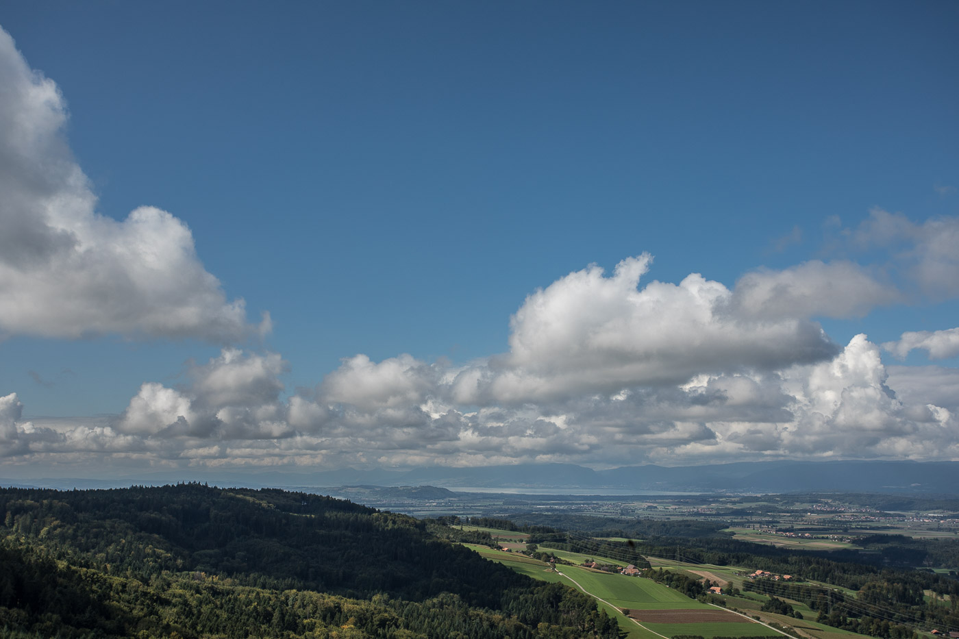 Weiter geht es durch Grächwil und Wahlendorf, hoch zum Chutze auf 820 Meter über Meer. Das ist der höchste Punkt der Tour, wäre da nicht der Chutzeturm, der uns nochmals von 40 Meter höher auf die Umgebung schauen lässt. Der Aufstieg scheint endlos, aber wir erreichen die oberste Plattform doch noch – und erleben eine Überraschung: Wir treffen einen SAC-Kameraden an, der eigentlich Co-Leiter hätte sein sollen, aber angeblich verhindert sei. Um uns nämlich einen Apéro zu bereiten zuoberst auf dem Turm! Das ist doch mal eine freudige Überraschung. Wir erblicken den Neuenburger- und den Bielersee, der Blick schweift über weite Teile des Mittellandes. Wir würden auch fast den ganzen Alpenkranz vom Boden- bis zum Genfersee erblicken sowie die ganze Jurakette, aber dicke Wolken verhindern die Sicht.
