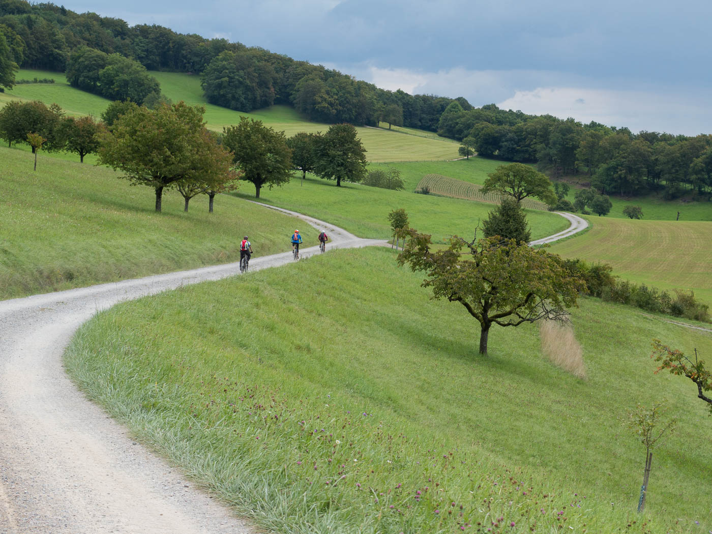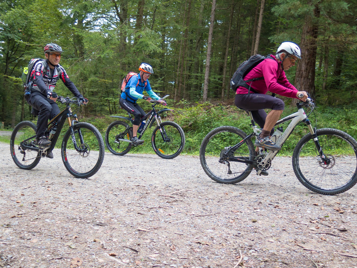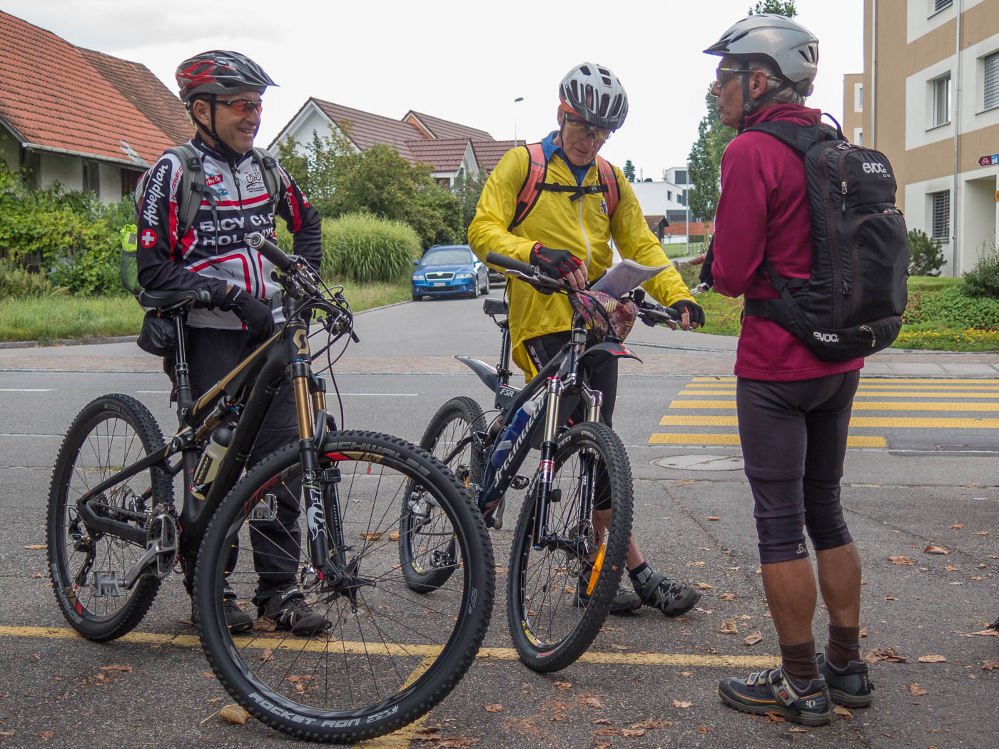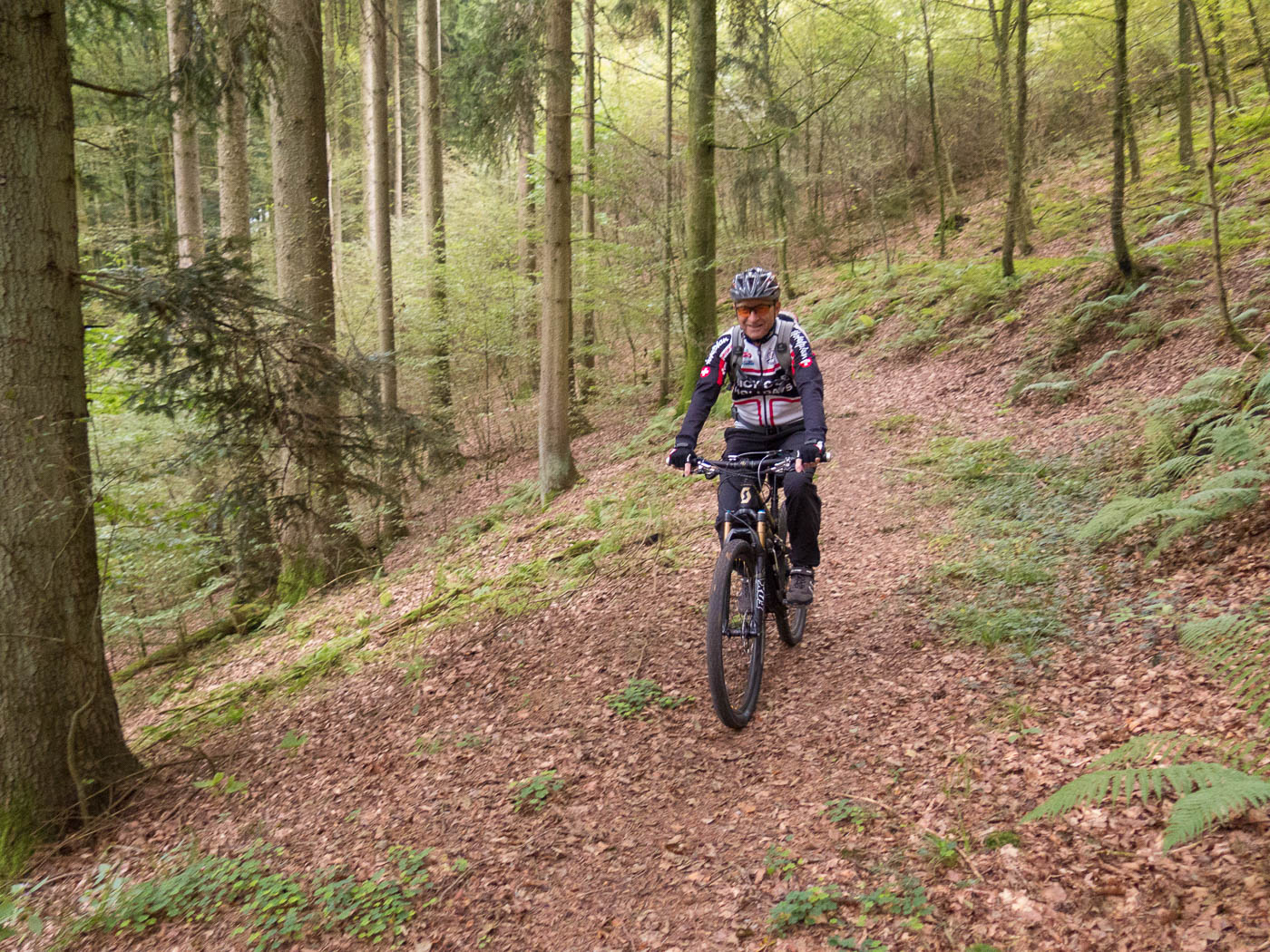 Der Start war in Hunzenschwil, wir starteten zu viert. Ich war rund 30 Jahre jünger als die anderen drei. Das tönt jetzt, als wären wir nur ein bisschen Velölen gegangen. Aber Achtung: Diese drei Herren um die siebzig Jahre waren topfit! Die fahren noch manchem Jungen um die Ohren. Ich verlor schon kurz nach Hunzenschwil die Orientierung, der Kurs drehte immer wieder. Irgendwann erspähte ich die Kirche von Staufen, aber ich wusste nicht, aus welcher Perspektive. Egal, Hauptsache, der Tourenleiter wusste, wo es durchgeht. Wo es rauf geht, geht es auch wieder runter. Und dazu hatte er sich Singletrails ausgesucht, schön flowig. Damit ihr wisst, was für Tourenleiter wir im SAC Homberg haben: Er rekognoszierte vorgängig die Tour mehrere Male, entfernte an einer Tanne, die quer über den Weg lag, die Äste, damit wir bequemer queren konnten und riss Brenneseln aus, damit wir mit diesen nicht in Berührung kommen. Ja, so geht das bei uns!