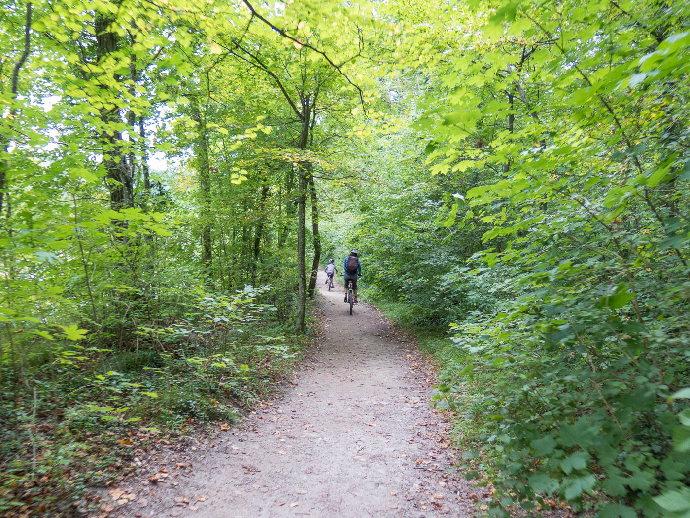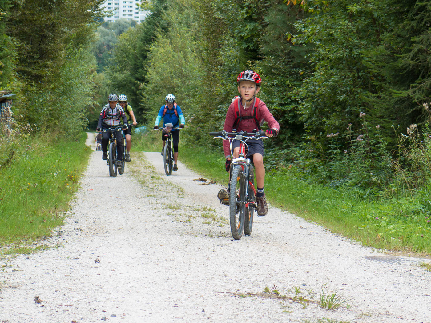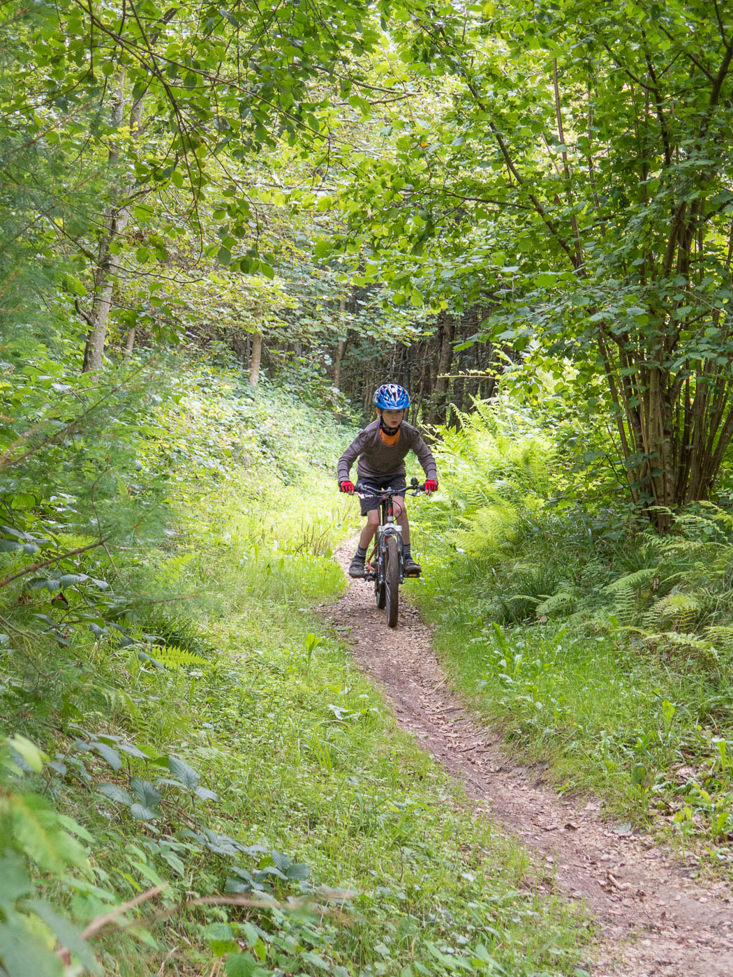 Nachdem wir wieder gestärkt waren, ging die Reise weiter nach Eppenberg. Dort startete das Highlight der Tour: Ein Singletrail hinunter nach Roggenhusen. Da meine Hände am Lenker sein mussten, konnte ich leider keine Bilder machen vom spannendsten Abschnitt. Ich fuhr direkt hinter meinem Jüngsten. Der Weg war ruppig, mit Wurzeln quer darüber, und steil. Das kümmerte ihn nicht, im Gegenteil, er sprang über jede Wurzel und preschte den Pfad runter wie ein Profi. Und das mit seinem 20″-Kinderbike! Es war als Vater eine Freude, ihm zuzuschauen. Viel zu schnell waren wir wieder auf der Strasse. Wir wechselten nun an die Aare, wo ein flacher, aber schöner Singletrail folgte.