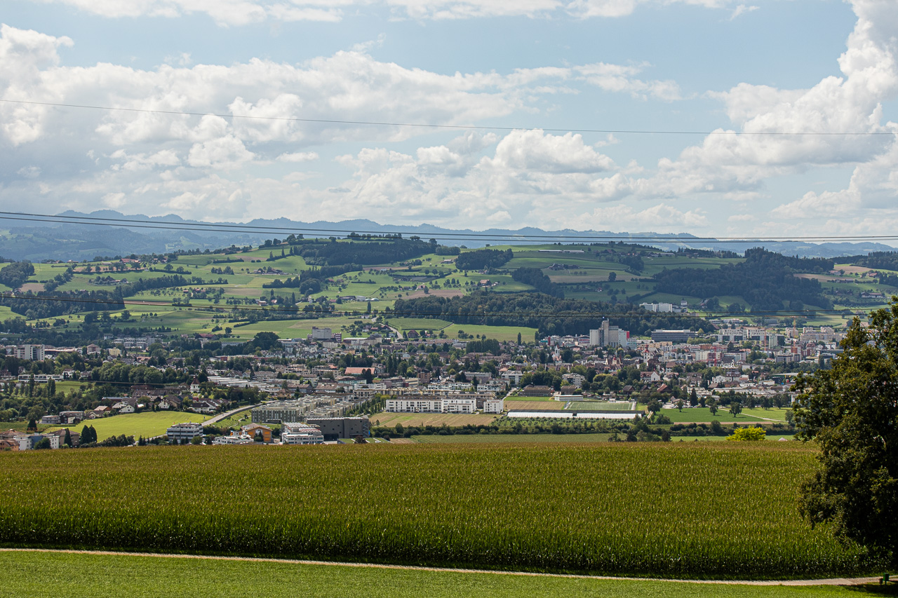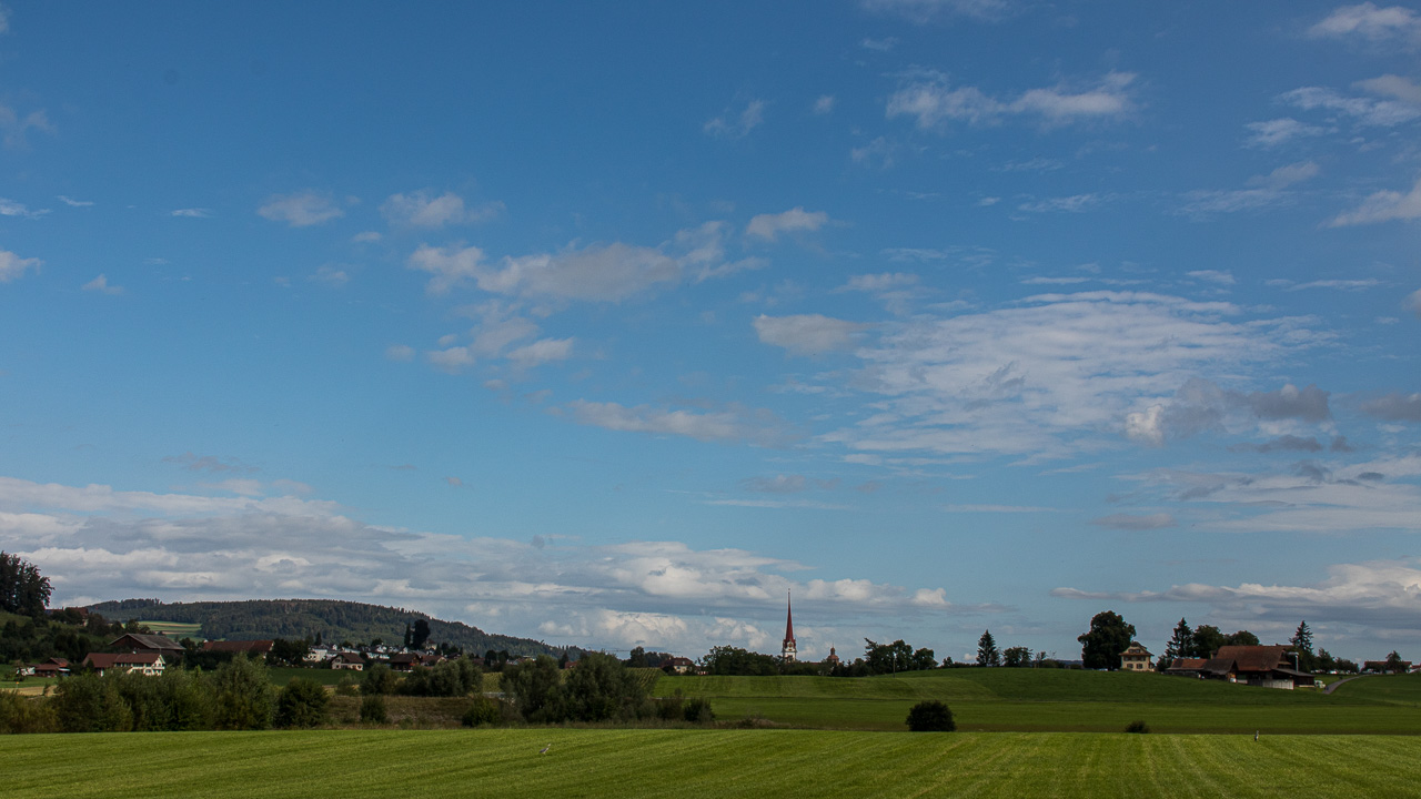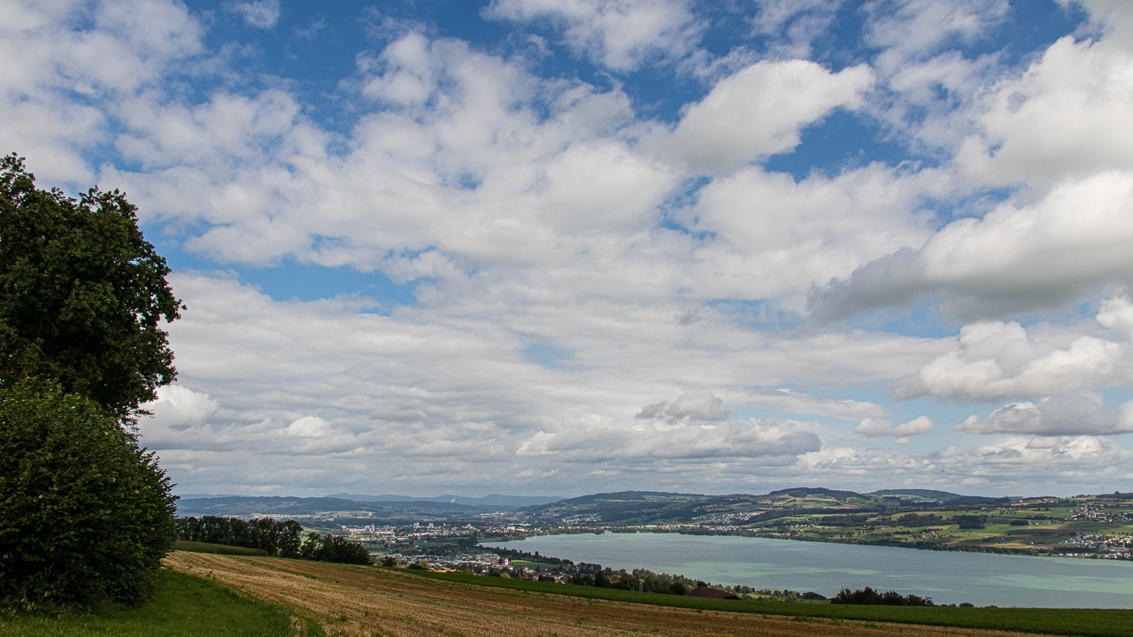 Über Zopfeberg fahren wir nach Tann, immer leicht ansteigend. Das letzte Stück hoch nach Holdern ist nochmals steil. Beim Rückblick sehen wir die ganze Hügelkette, die wir traversiert haben. Ab Holdere folgen wir dem altbekannten Weg der Route 599 bis Gunzwil, zweigen dort ab zum Radweg, wo wir am Morgen hergekommen sind, und schliessen somit den Kreis. Damit endet eine schöne, abwechslungs- und aussichtsreiche Tour rund um einen der drei Seen in unserer Umgebung. Da kommt mir in den Sinn: Wenn man mal alle drei Seen umrunden…?