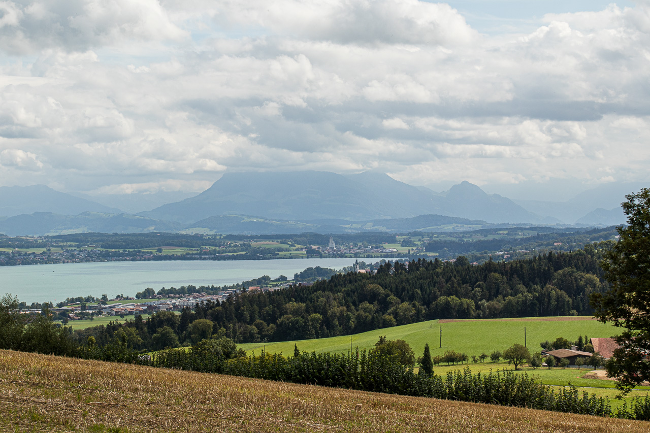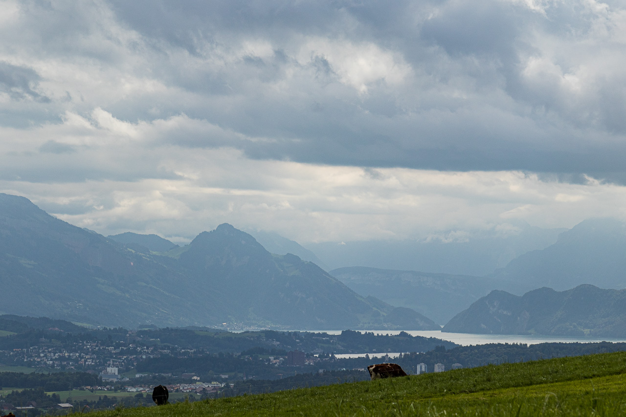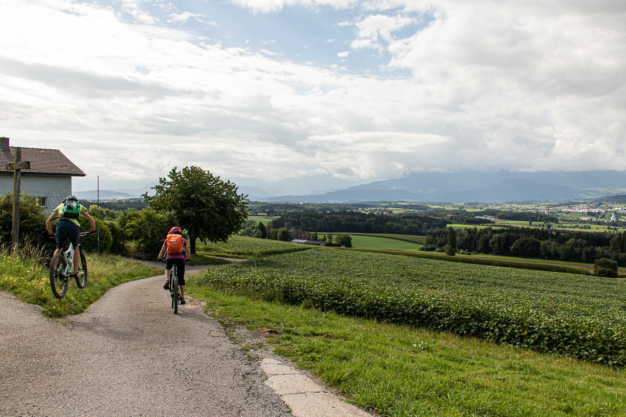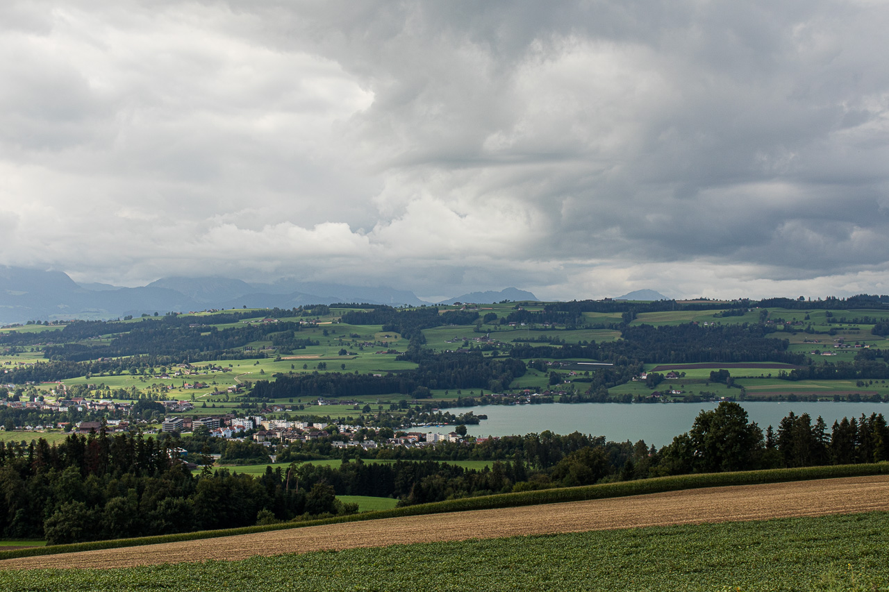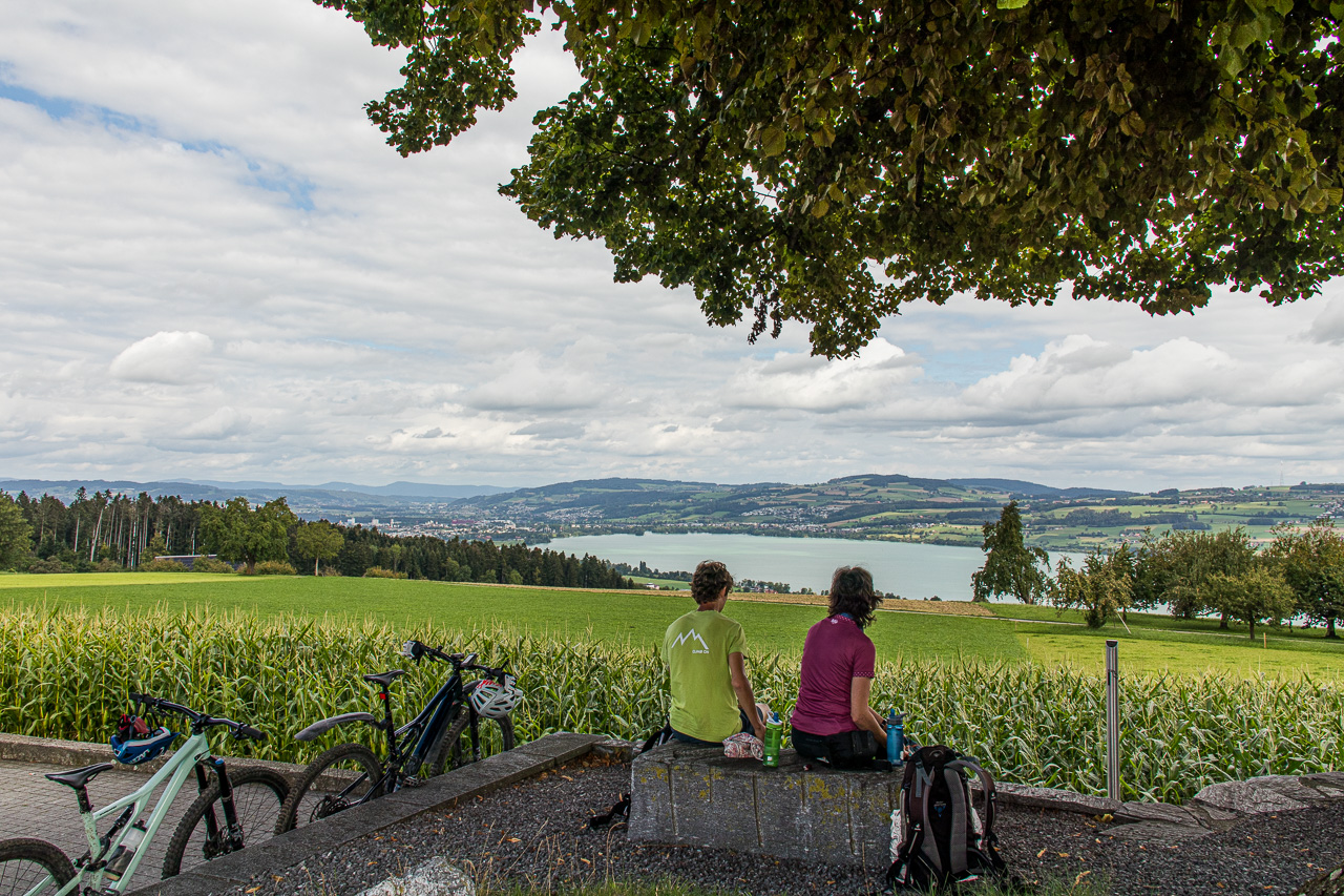 Wir durchqueren Neuenkirch, der nächste Hügel wartet, der „Rusmuer Berg“ oder auf deutsch Ruswilerberg. Die Route verläuft nun asphaltiert in angenehmer Steigung, vorbei an Bauernhöfen und Kuhweiden. Wir blicken auf den Sempachersee runter, die Rigi und der Rossberg tragen eine Wolkenkappe. Bei Windblosen blicken wir auf das volle Programm der Innerschweiz mit dem Vierwaldstättersee und den ebenfalls wolkenverhangenen Pilatus, Stanserhorn und so weiter. Die Strasse, auf die wir geraten sind, ist für unseren Geschmack stark befahren, so dass wir froh sind, dass unsere Route, besser gesagt zwei inzwischen, da ist noch die Napf-Bike dazugekommen, beim Vorderstrick rechts abzweigt. Wir halten uns nun an die Bikeroute 77, die einen Singletrail im Wald verspricht. Na, da halten wir doch voll rein, preschen den Weg runter. Zwischendurch halten wir an und blicken auf den Sempachersee.
