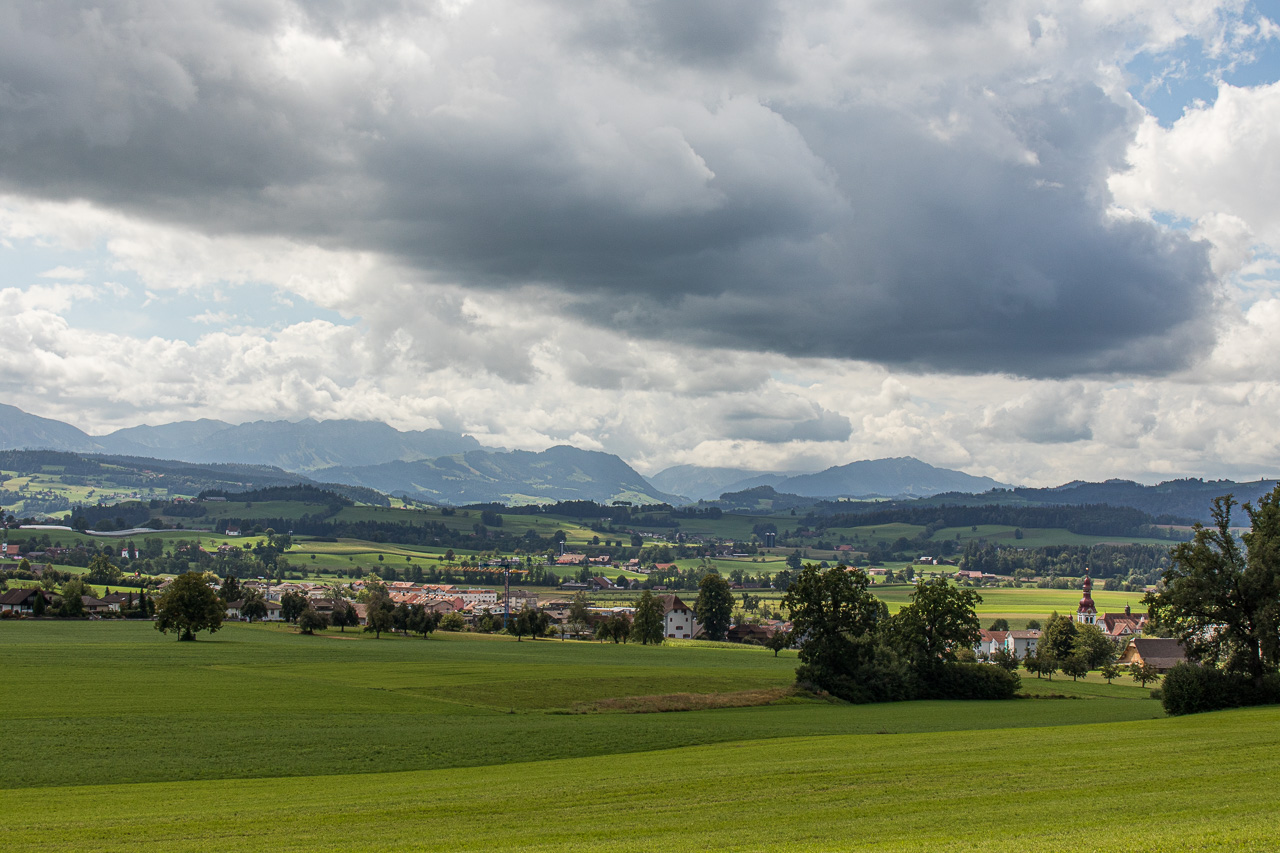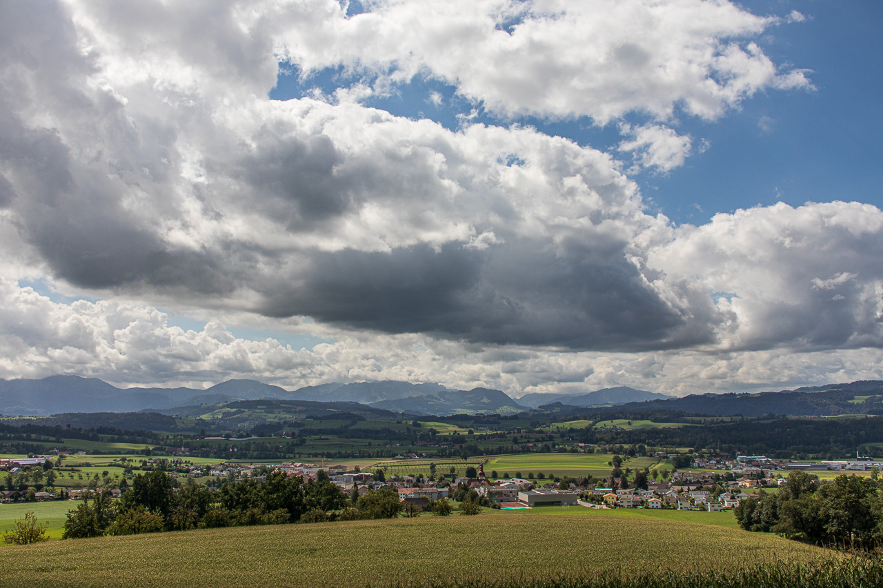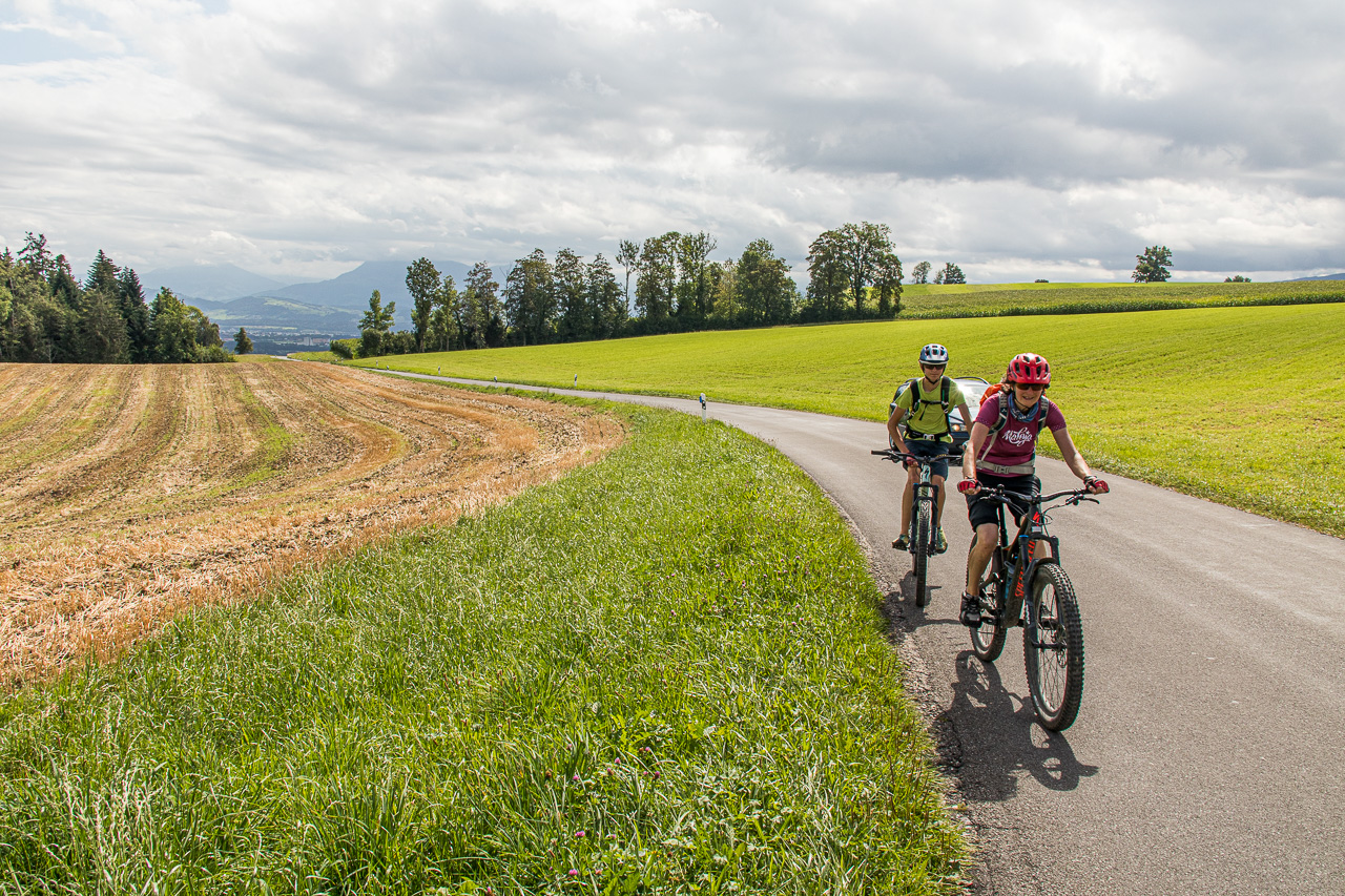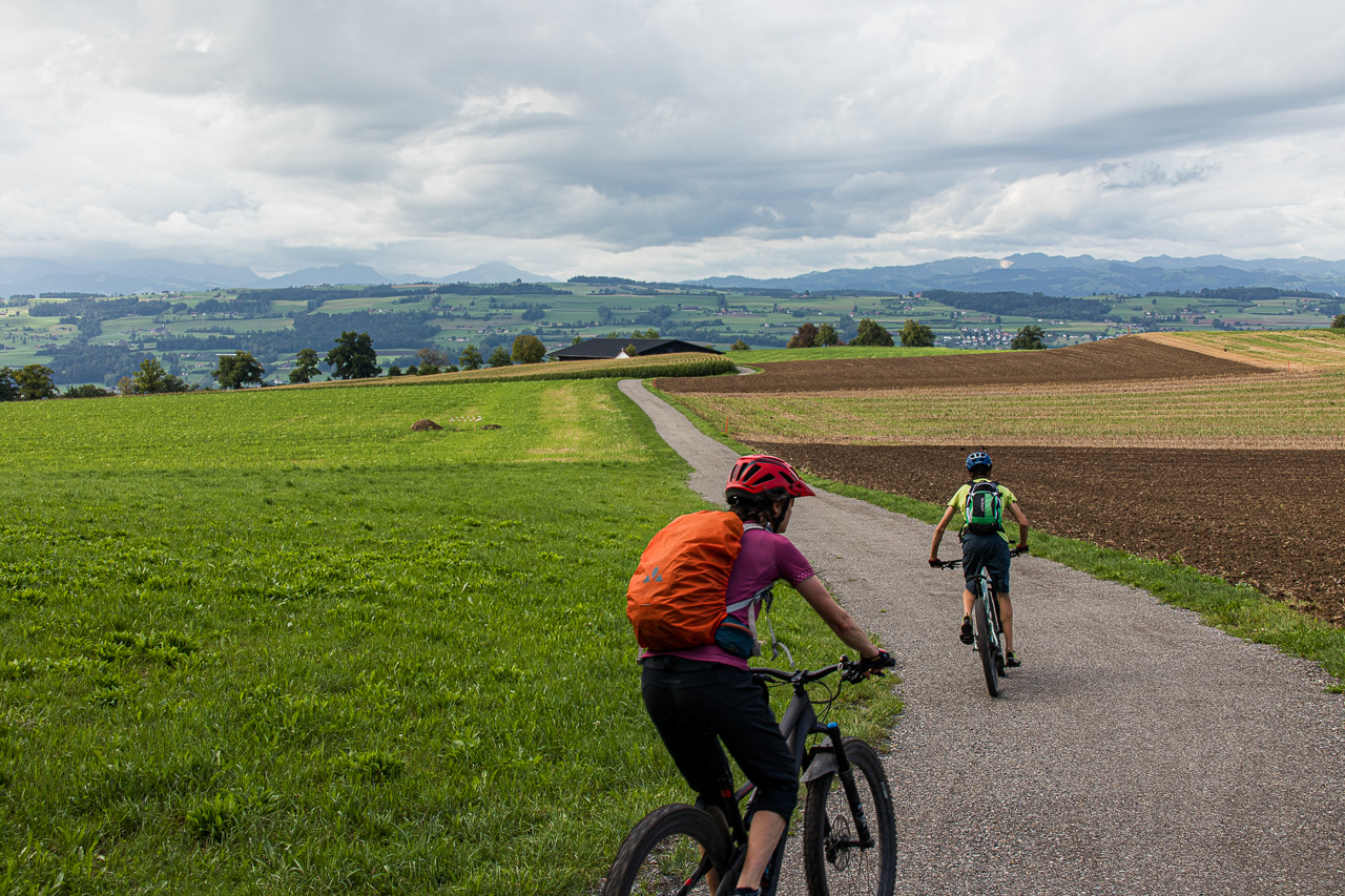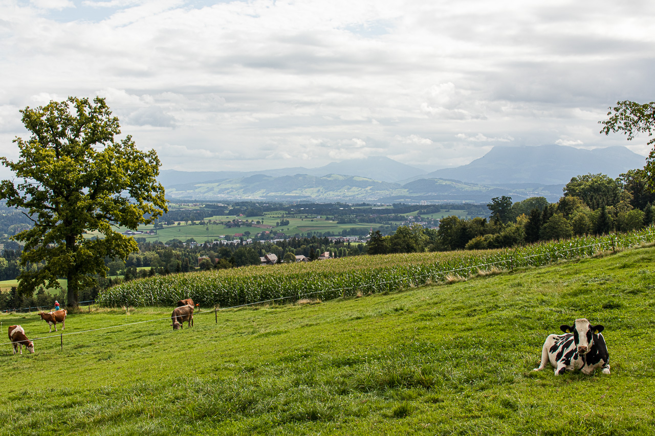 Wir durchqueren Neuenkirch, der nächste Hügel wartet, der „Rusmuer Berg“ oder auf deutsch Ruswilerberg. Die Route verläuft nun asphaltiert in angenehmer Steigung, vorbei an Bauernhöfen und Kuhweiden. Wir blicken auf den Sempachersee runter, die Rigi und der Rossberg tragen eine Wolkenkappe. Bei Windblosen blicken wir auf das volle Programm der Innerschweiz mit dem Vierwaldstättersee und den ebenfalls wolkenverhangenen Pilatus, Stanserhorn und so weiter. Die Strasse, auf die wir geraten sind, ist für unseren Geschmack stark befahren, so dass wir froh sind, dass unsere Route, besser gesagt zwei inzwischen, da ist noch die Napf-Bike dazugekommen, beim Vorderstrick rechts abzweigt. Wir halten uns nun an die Bikeroute 77, die einen Singletrail im Wald verspricht. Na, da halten wir doch voll rein, preschen den Weg runter. Zwischendurch halten wir an und blicken auf den Sempachersee.