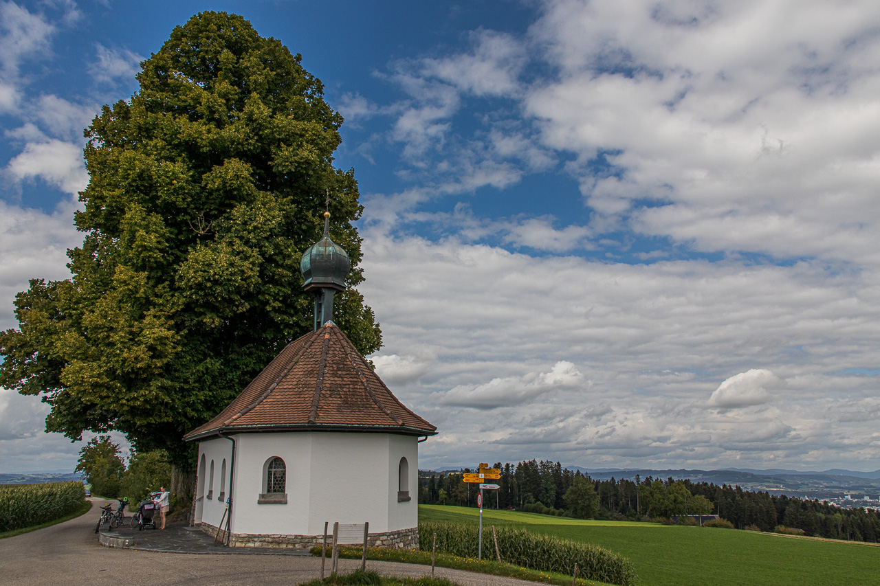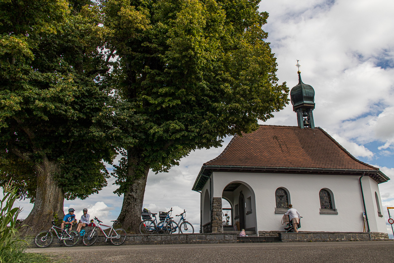 Bei Obermerzeberg treffen die Route 99 und 77 wieder aufeinander, die Tour führt auf Asphalt weiter. Bei der Kapelle Flüss machen wir ausgiebig Rast. Wir sind nicht die einzigen mit dieser Idee, die meisten Radfahrer, von denen es nicht wenige hat, scheinen hier einen Halt einzulegen. Der Platz ist auch perfekt dazu, im Schatten der grossen Linden stehen mehrere Bänke, die eine schöne Aussicht auf den Sempachersee erlauben.