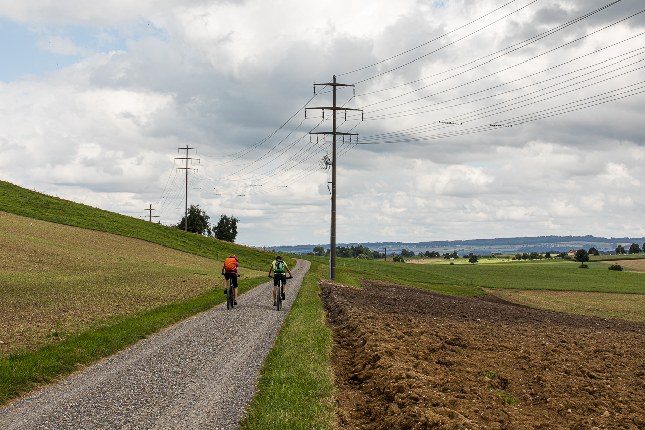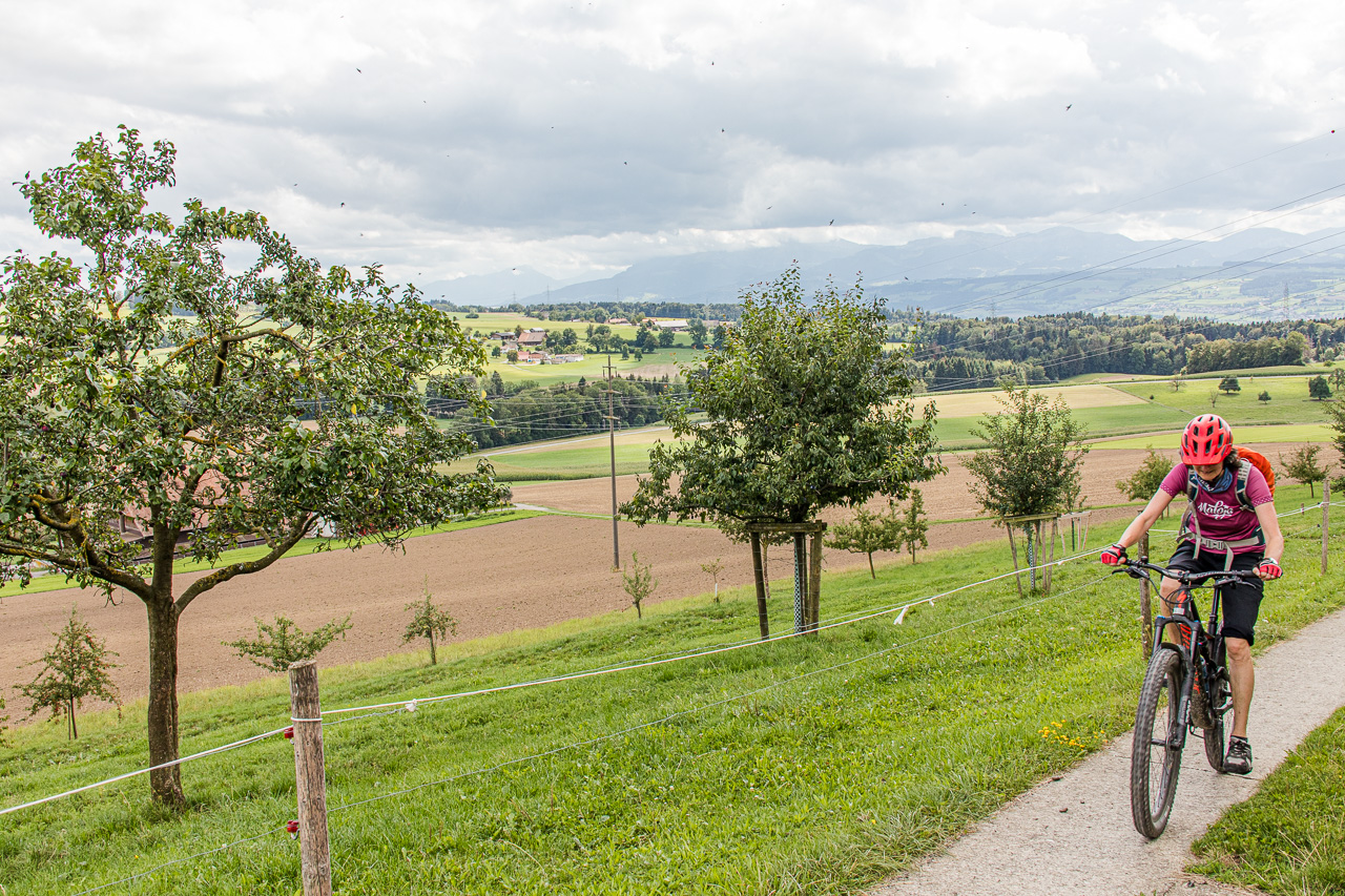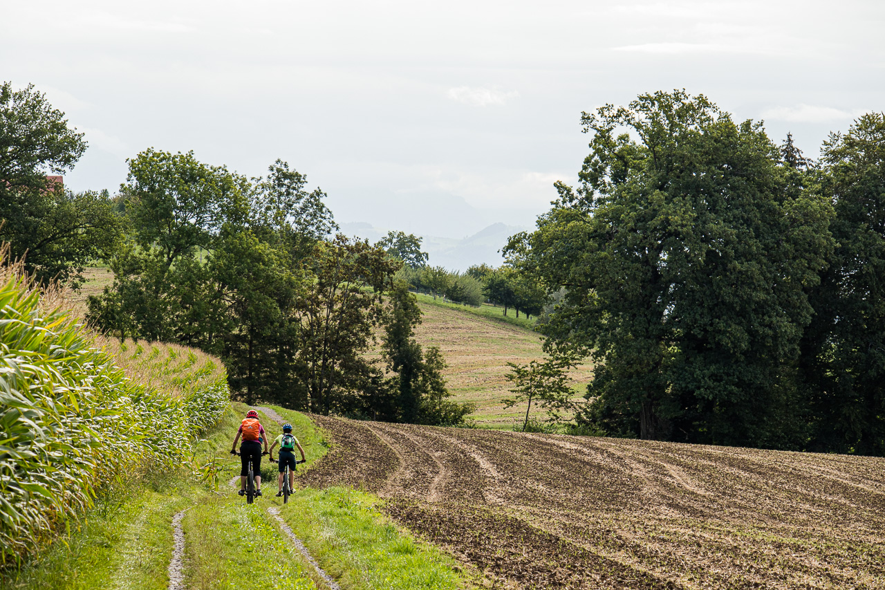Für die Weiterfahrt verzichten wir ab Mittelarig auf die Signalisation und tauchen in den Wald ein. Vor Buttisholz kreuzen wir die Strasse, es geht wieder aufwärts und durch den Sigerswilerwald hindurch und runter bis Renzligen. Dort erwartet uns eine letzte Steigung, wenigstens vorerst, die wir auf der Oberhöhe gemeistert haben. Nun geht es nach Sursee runter. Vor einem Wald fragt Fabian, ob es hier runtergehe. „Ich sehe nur diesen schmalen, steilen Weg durch den Wald“, stelle ich fest. „Juchuuu!“ und er springt regelrecht in den Weg hinein. Ein cooler Singletrail führt uns abwärts, und gleich noch weiter bis zum Campus Sursee.