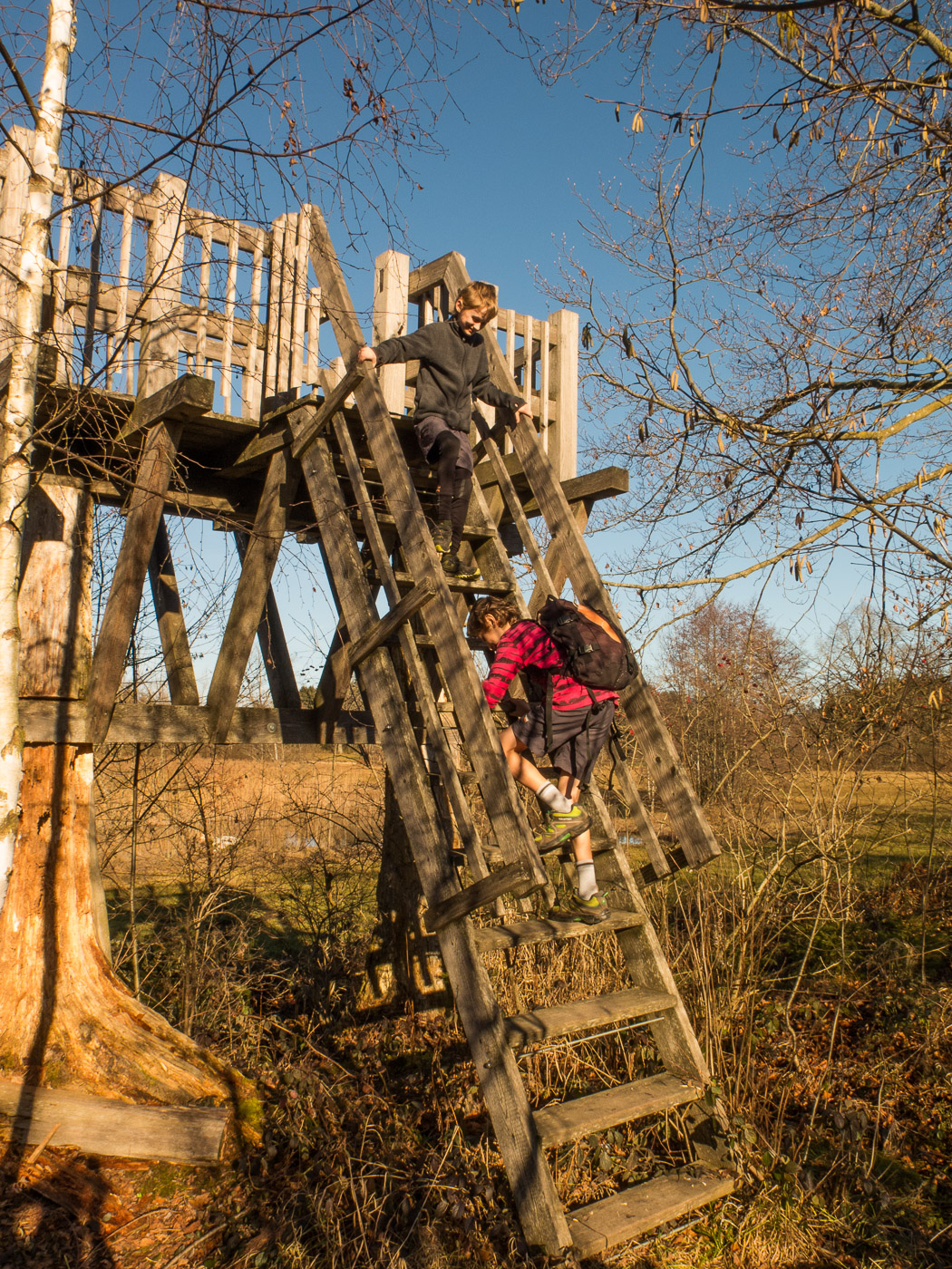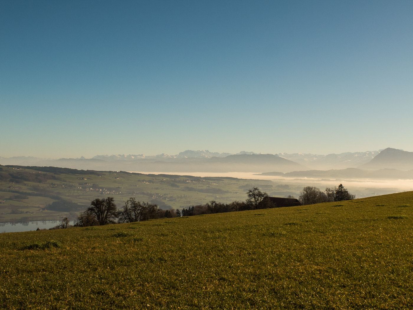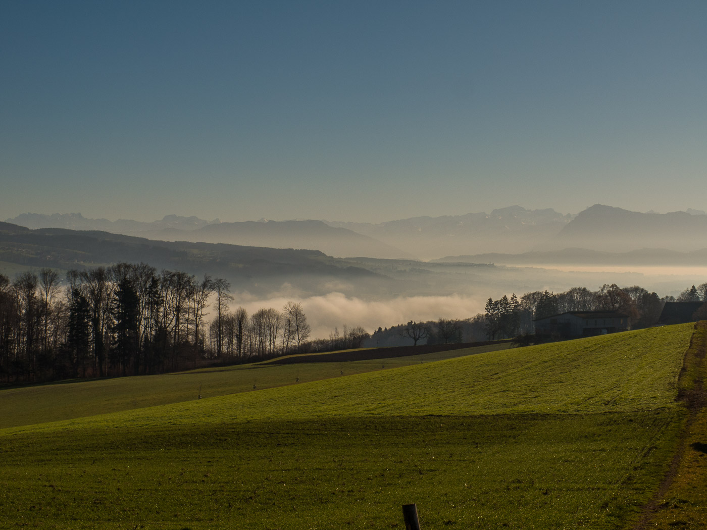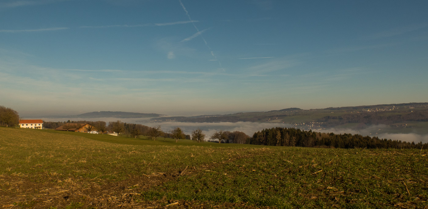 Unsere Tour beginnt im Reinacher Sonnenberg, der vom Bahnhof Reinach AG aus in einer Viertelstunde erreichbar ist. Auf Asphalt geht es weiter zur Lüsch und nach Schwarzenbach, analog der Velotour am Hallwilersee. Es ist ungewöhnlich warm an diesem Dezember-Sonntag, der Junior fährt in kurzen Hosen. Wir bewundern die Aussicht in die Berge und auf den Nebel. Wie so oft liegt das angrenzende Seetal im Nebel, während wir die Sonne geniessen.