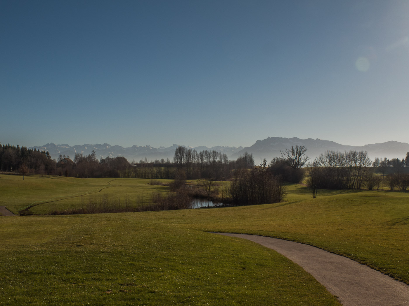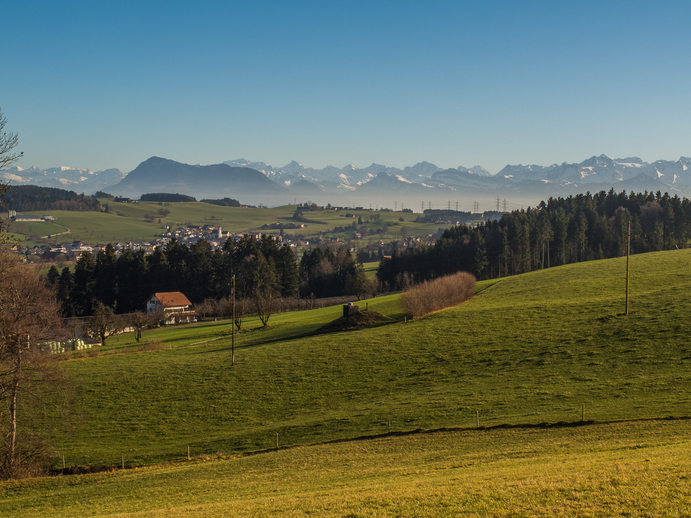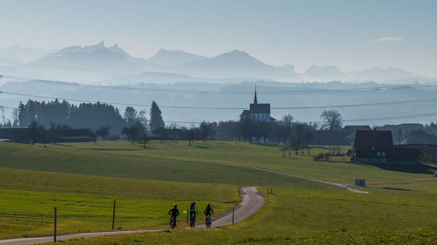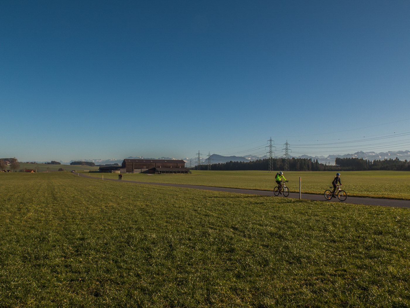 Wir fahren also durch diesen Chüewald, immer den gelben Wanderwegweisern nach. Es hat so viele Strassen in diesem Wald, dass man sich an den gelben Rauten am besten orientieren kann. Wir erreichen das Vogelmoos, ein Feuchgebiet mit mehreren Weihern und zwei Aussichtsplattformen. Um diese Jahreszeit ist natürlich nicht viel los, aber das Moos nicht minder schön. Nach einer längeren Pause fahren wir weiter durch den Wald, dann abwärts nach Älmeringe, einem Weiler, und weiter zum Gormund an der Kantonsstrasse, wo eigentlich das Restaurant Gormund zu einer Pause verleiten würde. Aber der Parkplatz ist proppenvoll, so dass uns unverzüglich die Lust vergeht auf einen Halt. Auf dem Hügel thront die Kapelle, die äusserst beliebt ist zum Heiraten (jemand Bedarf?). Nun fahren wir wieder durch eine andere Welt, nämlich jene des Golfsports. Wir ziehen den Kopf ein und fahren möglichst schnell durch. Dabei verpassen wir beinahe die grossartige Aussicht in die Berge.