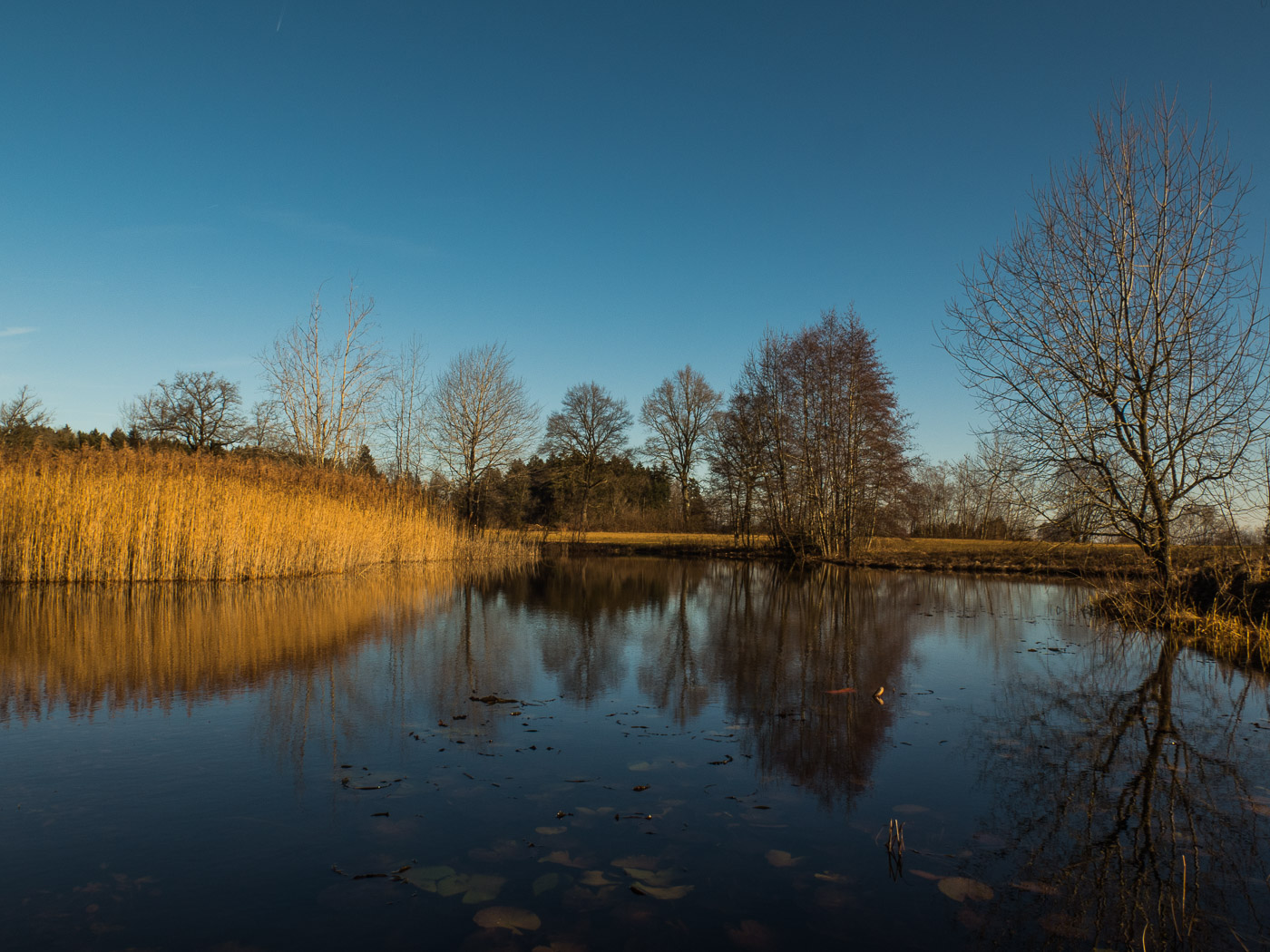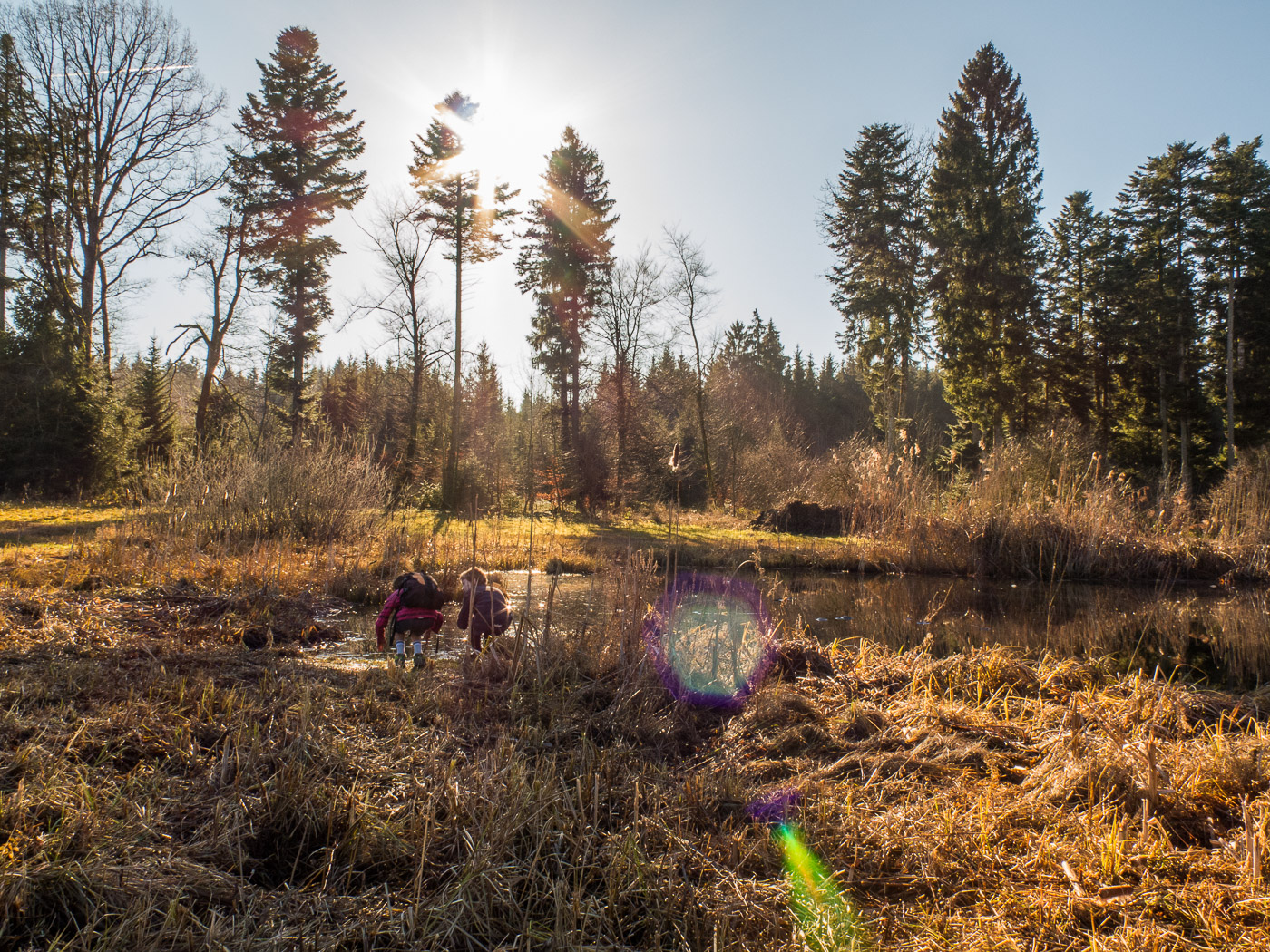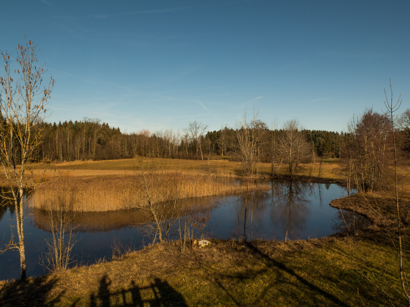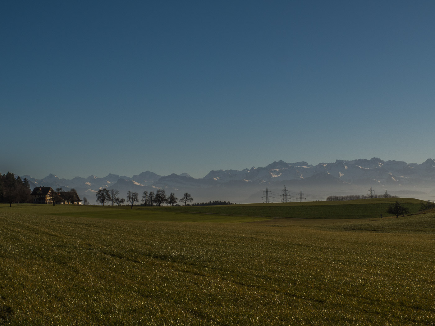 Wir fahren also durch diesen Chüewald, immer den gelben Wanderwegweisern nach. Es hat so viele Strassen in diesem Wald, dass man sich an den gelben Rauten am besten orientieren kann. Wir erreichen das Vogelmoos, ein Feuchgebiet mit mehreren Weihern und zwei Aussichtsplattformen. Um diese Jahreszeit ist natürlich nicht viel los, aber das Moos nicht minder schön. Nach einer längeren Pause fahren wir weiter durch den Wald, dann abwärts nach Älmeringe, einem Weiler, und weiter zum Gormund an der Kantonsstrasse, wo eigentlich das Restaurant Gormund zu einer Pause verleiten würde. Aber der Parkplatz ist proppenvoll, so dass uns unverzüglich die Lust vergeht auf einen Halt. Auf dem Hügel thront die Kapelle, die äusserst beliebt ist zum Heiraten (jemand Bedarf?). Nun fahren wir wieder durch eine andere Welt, nämlich jene des Golfsports. Wir ziehen den Kopf ein und fahren möglichst schnell durch. Dabei verpassen wir beinahe die grossartige Aussicht in die Berge.