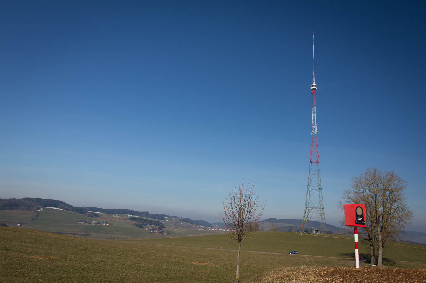 So fuhren wir denn los, das Ziel war der Landessender auf dem Bloseberg bei Beromünster. Ich war schon ein paar Mal auf dem Bloseberg, aber diesmal sah es so aus, dass ich den Turm tatsächlich zu Gesicht bekäme. Auf dem Radweg der ehemaligen Möischterlinie kamen wir flott voran. Ich stellte fest: Meine Buben waren jetzt grosse Jungs. Während vor ein paar Jahren ein Ausflug nach Beromünster noch tagesfüllend war, waren wir jetzt innert Kürze dort. Wir nahmen uns noch die Zeit, unterwegs einen Geocache zu bergen. Wir kamen an der St. Theobald-Kapelle vorbei, wo vor langer Zeit, genauer 1386, die Leiche von Herzog Leopold geruht haben soll, nachdem er in der Schlacht bei Sempach gefallen war. Zum Glück geht es heute friedlicher zu und her – zumindest im Moment noch.