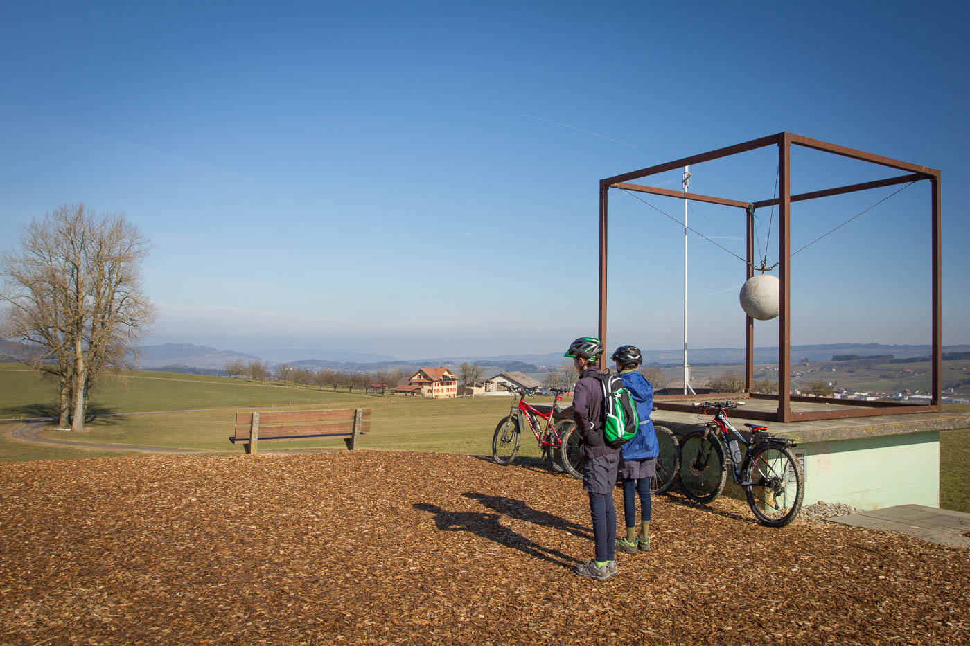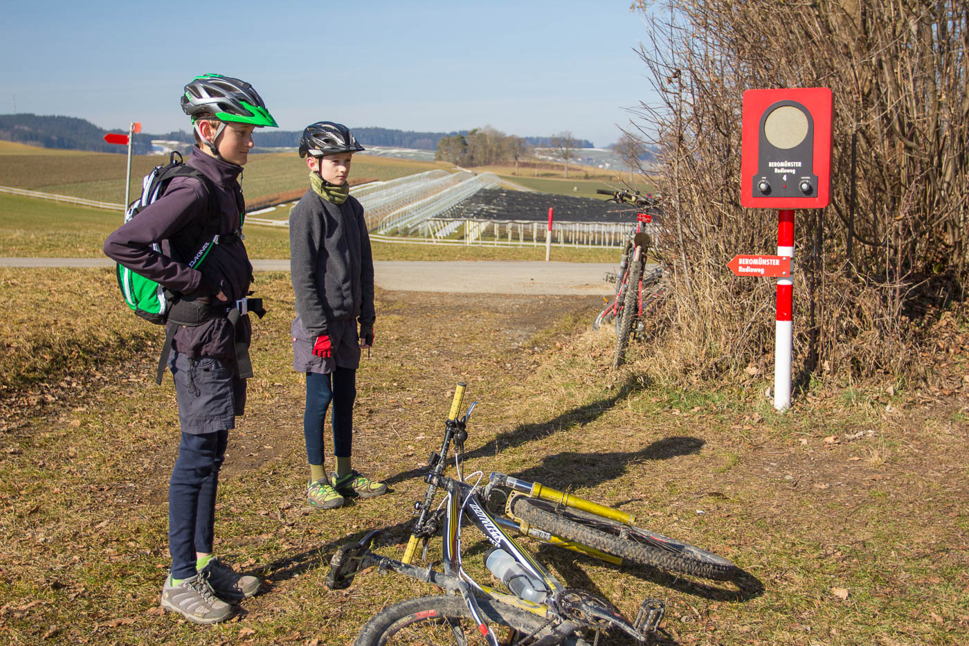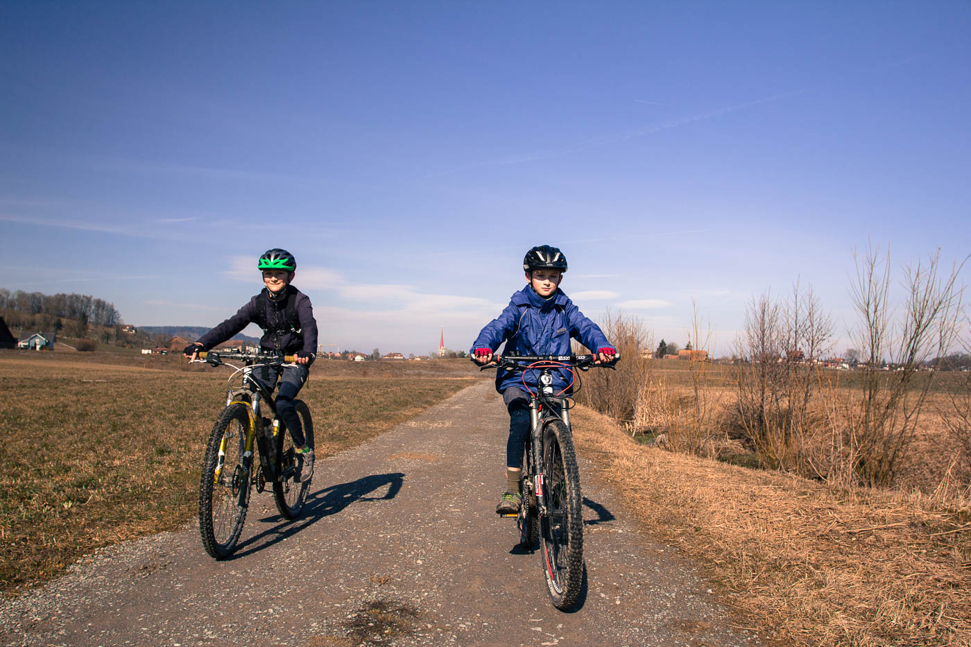 „Was wollen wir morgen machen?“ fragte ich am Samstag. „Biken!“ kam es wie aus der Kanone geschossen. Klar, ich hatte nichts anderes erwartet. So machten wir uns am Sonntagmorgen parat, die Sonne stand schon hoch am stahlblauen Himmel. Die Temperaturen näherten sich dem angenehmen Bereich, obwohl es am frühen Morgen noch unter Null war. Trotzdem musste ich den Jüngeren darauf hinweisen, dass er doch bitte lange Hosen anziehen soll. Aber wahrscheinlich wollte er nur sehen, wie ich reagiere.