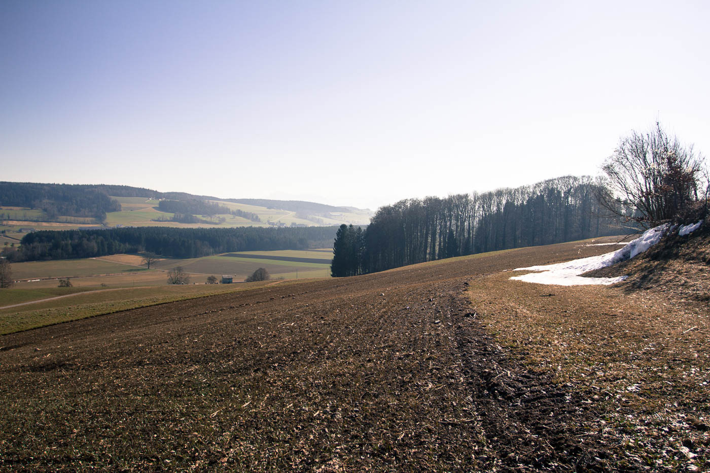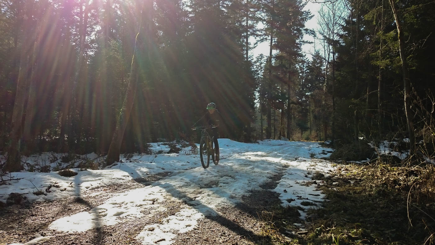 Wir hätten nun ganz profan wieder den gleichen Weg zurück fahren können, aber dann wäre es keine Biketour gewesen. Wir fuhren deshalb zuerst noch durch den Chegelwald. Durch die Höhe (der Wald liegt auf fast 800 Meter) und den Schatten hatte sich Eis und Schnee gehalten. Normale Velofahrer würden von diesen Verhältnissen angewidert umkehren, meine Jungs jubelten. Durch Eis, Schnee und Dreck fuhren wir in die Ebene hinunter.