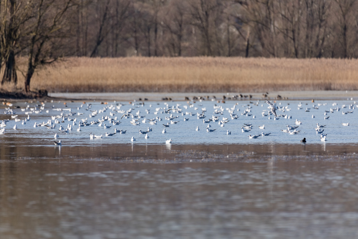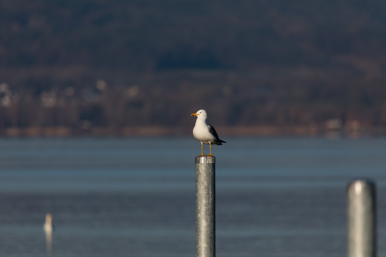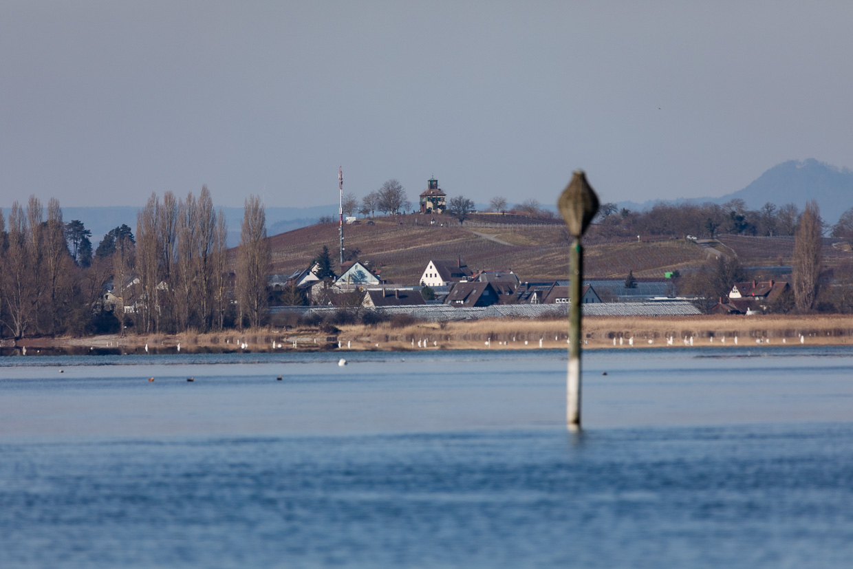Während an diesem schönen, sonnigen Samstag alle in die Berge streben, fahren wir den umgekehrten Weg, was äusserst angenehm ist. Wir fahren fast alleine durch die Terra Incognita hinter Zürich, an Winterthur vorbei und durch den Thurgau nach Kreuzlingen, geniessen die Aussicht auf dem Seerücken in die Berge. Mit dem Thurbo erreichen wir Ermatingen, es ist noch recht kühl, trotz Sonnenschein. Unser erstes Ziel ist der Hafen, wo kaum Menschen, aber viele Möwen sind, es tönt wie am Meer. Viele Lachmöwen fliegen umher, aber da sind auch noch andere dazwischen. Auf einem Pfosten sitzt eine Sturmmöwe, ein Wintergast. Und dann sitzt da auf einem weiteren Pfosten eine Grossmöwe. Aber welche? Erst zu Hause können wir sie, nach genauem Studium der Bilder und mit Hilfe des Möwenbuches, identifizieren: Eine Heringsmöwe, eine eher seltene Art bei uns.