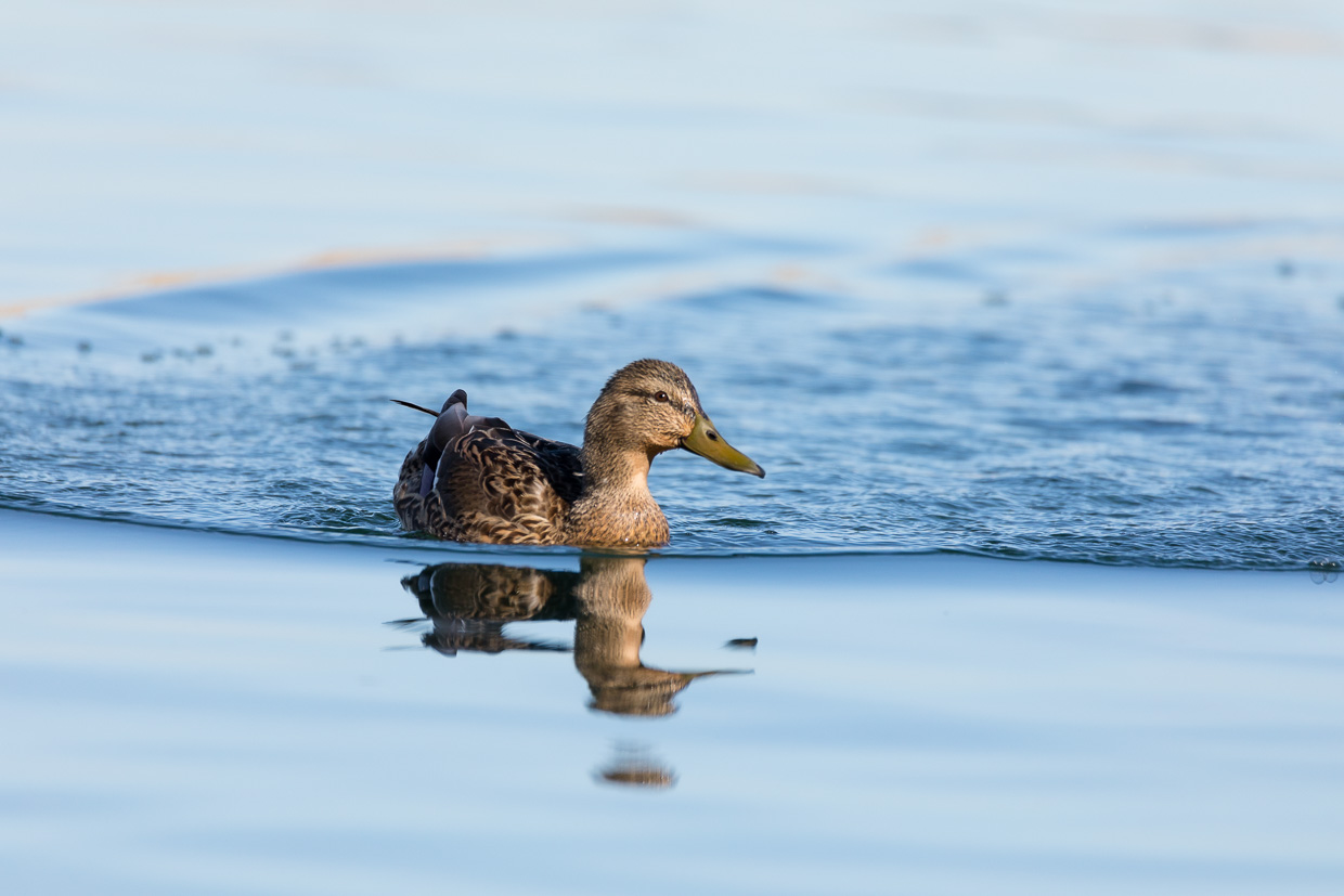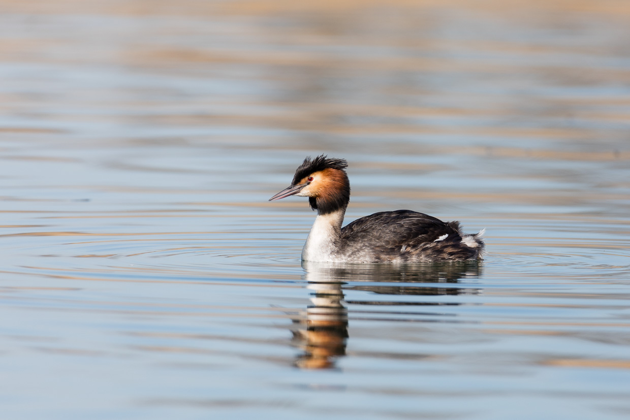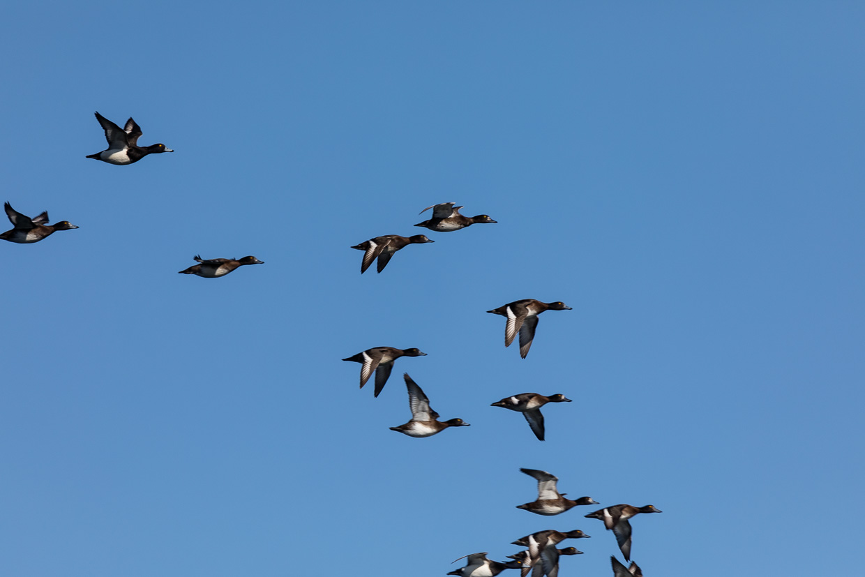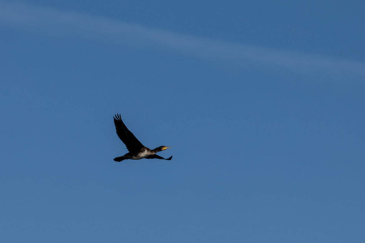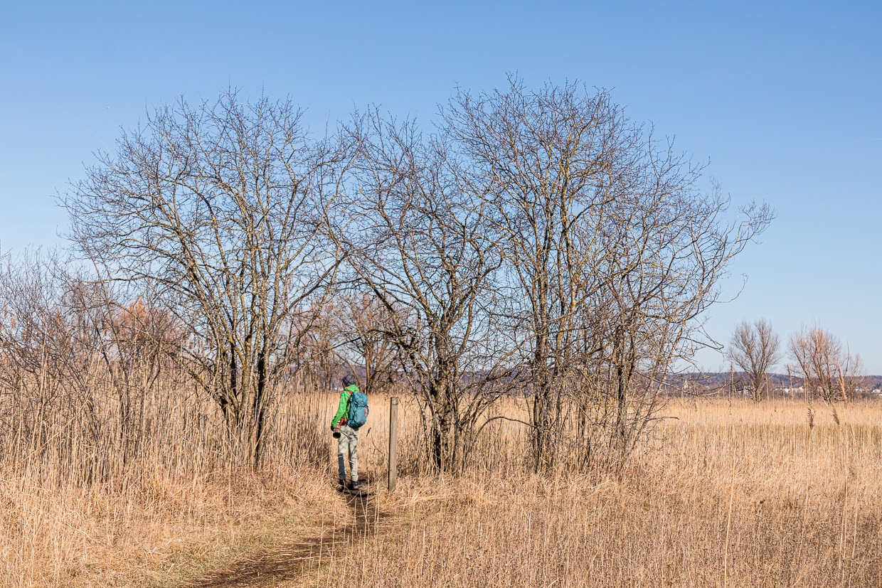 Wir gehen weiter dem Wanderweg entlang, laufen auf die Gruppe auf, die wir vorher angetroffen haben. Wir möchten Vögel beobachten und nicht dem Geschnatter zuhören, so kommt uns das Schild gerade recht, das auf einen Pfad hinweist, dem wir am Rande des Röhrichts folgen, wir fühlen uns ein bisschen wie in der Savanne in Afrika, abgesehen von den Temperaturen. Irgendwo ruft wieder ein Zilpzalp. Wir kommen an die Stelle, wo der Seerhein beginnt, der Verbindung zwischen dem Bodensee und dem Untersee. Sie lädt zu einer Pause und zum Beobachten ein. Ein Schwarm Reiherenten zieht eine Flugshow ab, sie fliegen zuerst Richtung Ermatingen, um kurz darauf wieder in die andere Richtung an uns vorbeizufliegen.