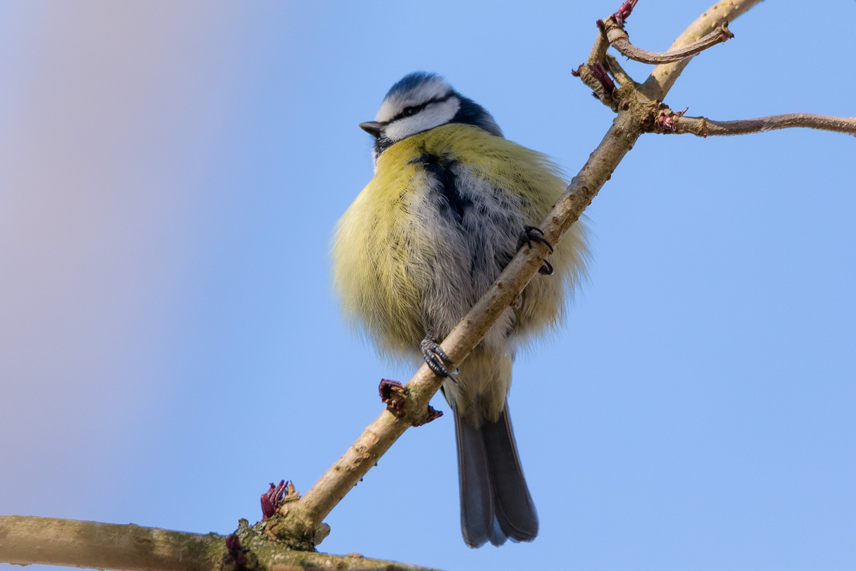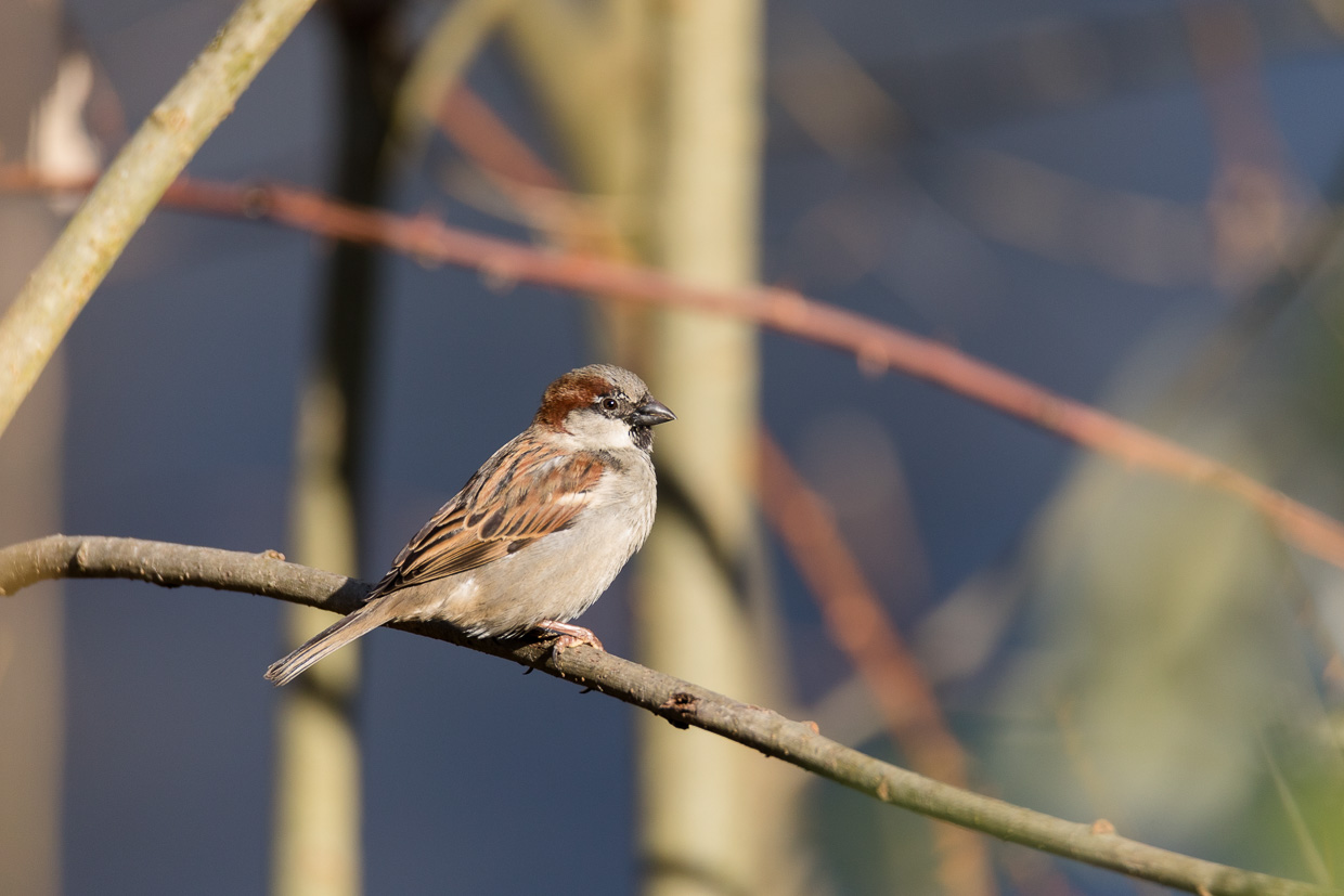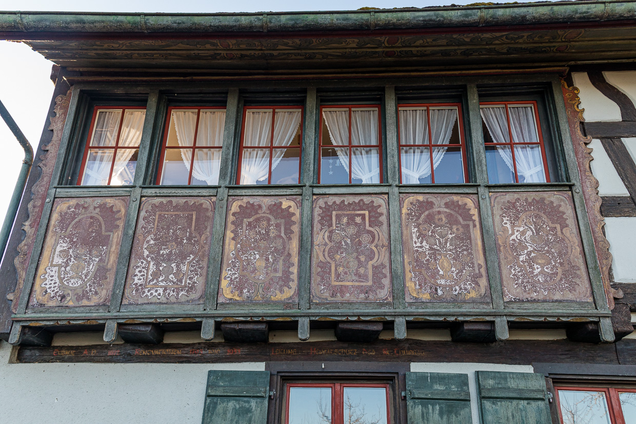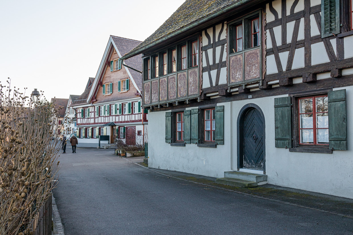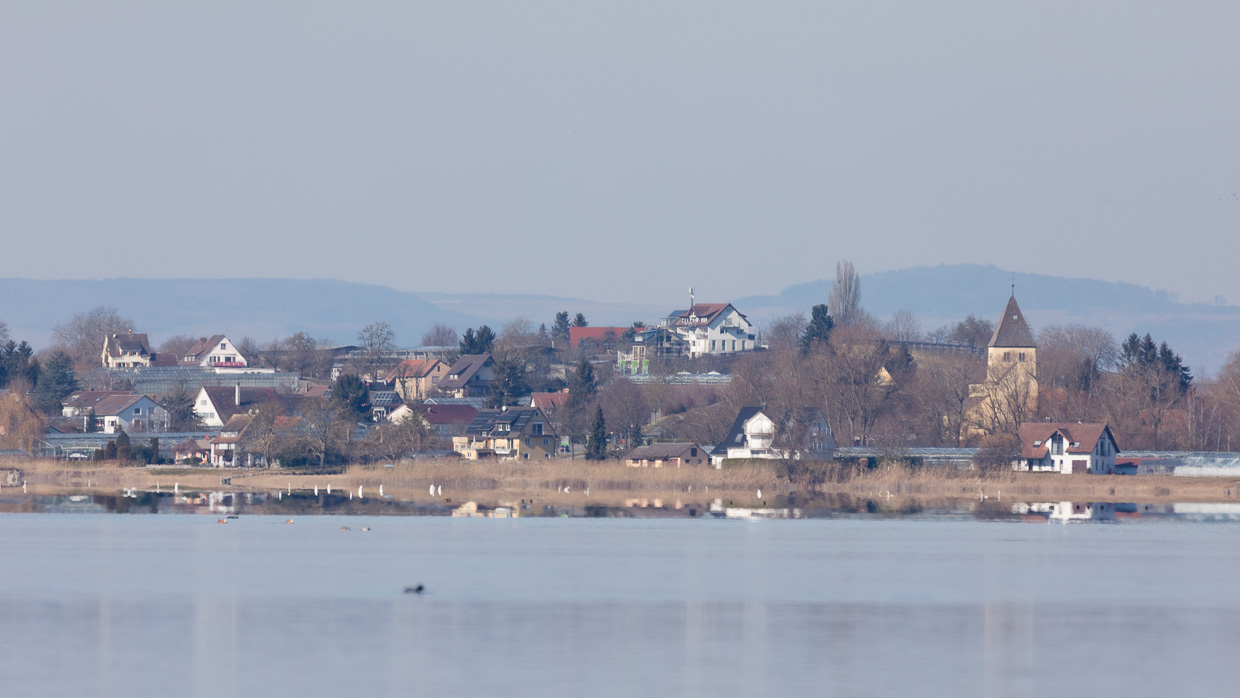 Wir wandeln durch das Dorf, das in typischer Ostschweizer Manier aus Riegelbauten besteht, zumindest der alte Dorfkern am Hafen. Wir hören das Tröten der Singschwäne weit draussen auf dem Untersee, nahe am Ufer schwimmen Blässhühner, geschätzt über 500. Der Weg führt nun vom Ufer weg, parallel zur Bahnlinie. So haben die Vögel auf dem Wasser und im Schilf ihre Ruhe. Spatzen, Meisen und verschiedene Finken huschen in den Sträuchern umher. In einem entdeckt Silvan einen grünlichen Vogel, einen Laubsänger. Der erste Zilpzalp des Jahres!