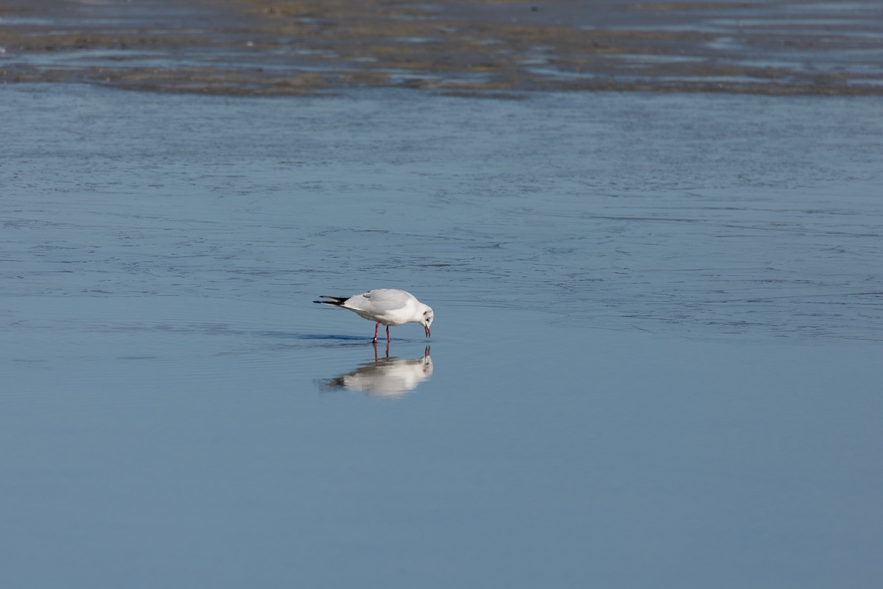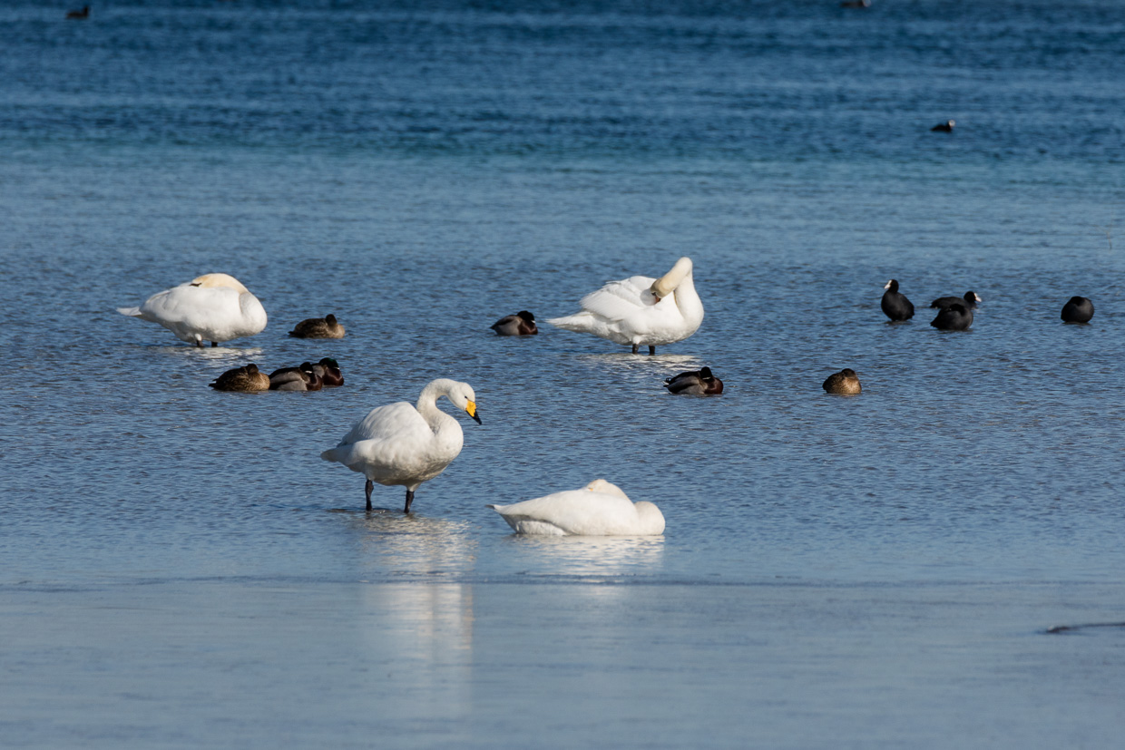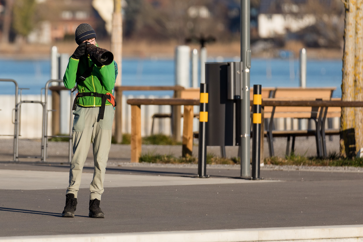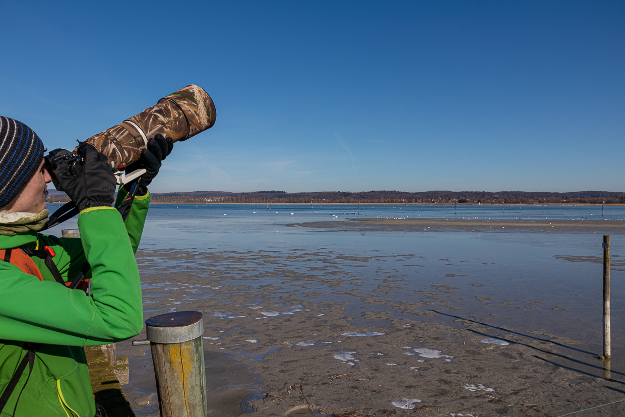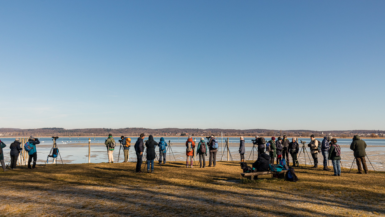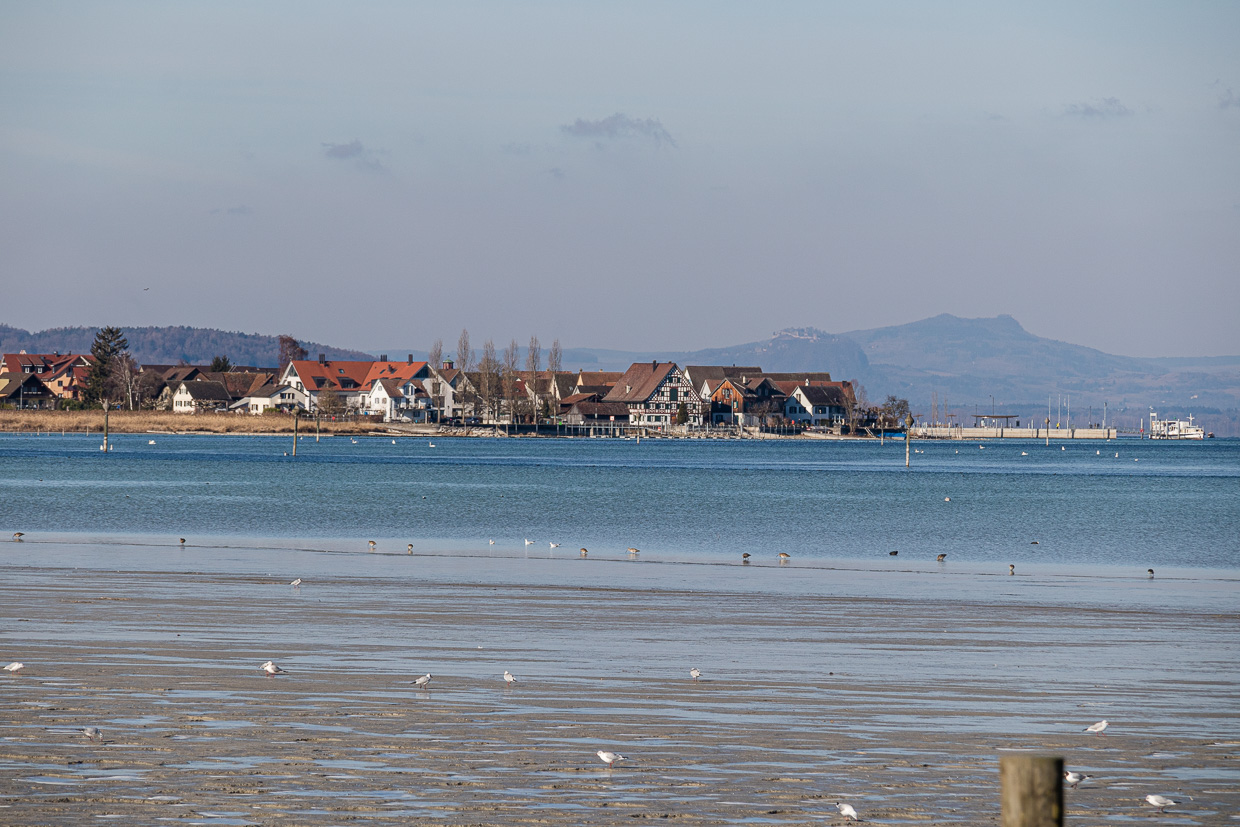 Gleich nach der Haltestelle Triboltingen führt ein Weg ans Ufer, das offensichtlich bekannt ist bei Vogelfreunden, zwei Dutzend Leute schauen durch Ferngläser und -rohre auf den See hinaus. Zu sehen gibt es tatsächlich einiges, nebst vielen Lachmöwen, Höckerschwänen und Rostgänsen ruht auch ein Singschwan, neben im vermutlich noch einer. Vermutlich deshalb, weil er die ganze Zeit, in der wir dort waren, seinen Kopf im Gefieder versteckt hatte und döste. Weiter links stocherten 37 Grosse Brachvögel im Schlick.
