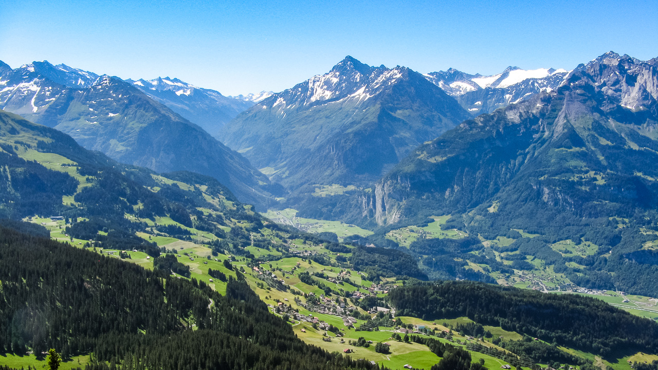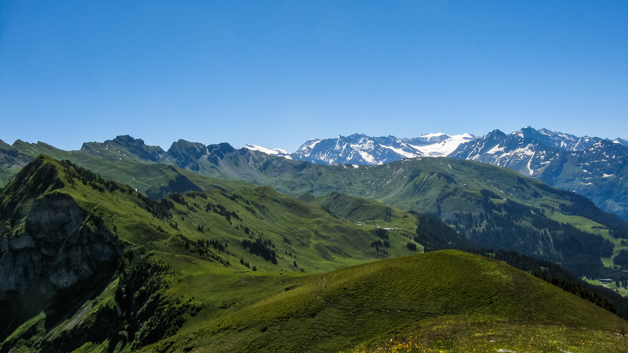 Fabian und ich gehen voran, schon bald haben wir die anderen abgehängt. Wir haben schon ein paar Mal angehalten, um die beiden wieder aufholen zu lassen. Ich würde zu schnell gehen, klagt Silvan. Also geht ab jetzt die Frau voran und wir definieren das Ziel um, neu ist das die Alp Hüttstett, 370 Meter unter dem Gibel. Es ist heiss, die Sonne brennt auf unsere Köpfe. Aber es ist nicht mehr weit. Silvan ist erleichtert, als wir unseren „Gipfel“ erreichen. Ja, er sieht aus wie ein Gipfel, da steht sogar ein Gipfelkreuz und es geht ringsum runter. Na gut, nur einen Meter, aber es fühlt sich an wie ein Gipfel. Wir machen ausgiebig Pause und geniessen die Aussicht. Wir blicken ins Kleine Melchtal, wo der Mittelpunkt der Schweiz liegt, auf der anderen Seite, weit hinten, erhebt sich die Niesenkette über dem Thunersee. Leider bleibt uns nun die Aussicht ins Haslital verwehrt. Jänu, ein anderes Mal. Nun wird es aber Zeit für die Abfahrt. Wie der Schnee wohl ist?